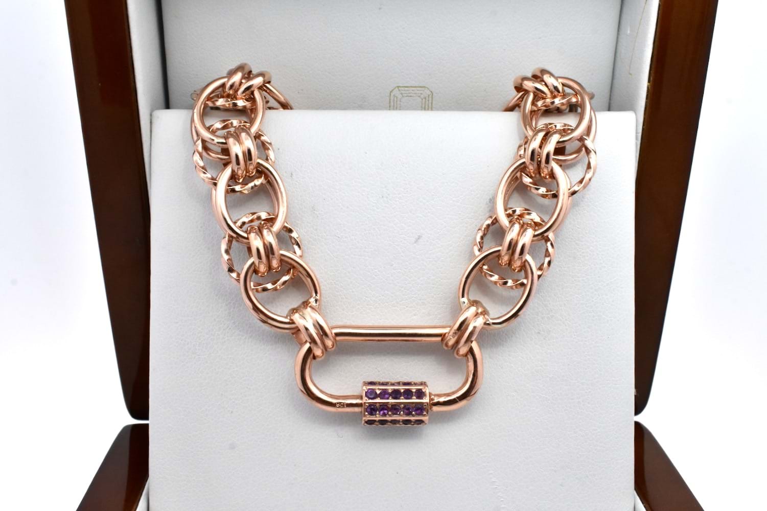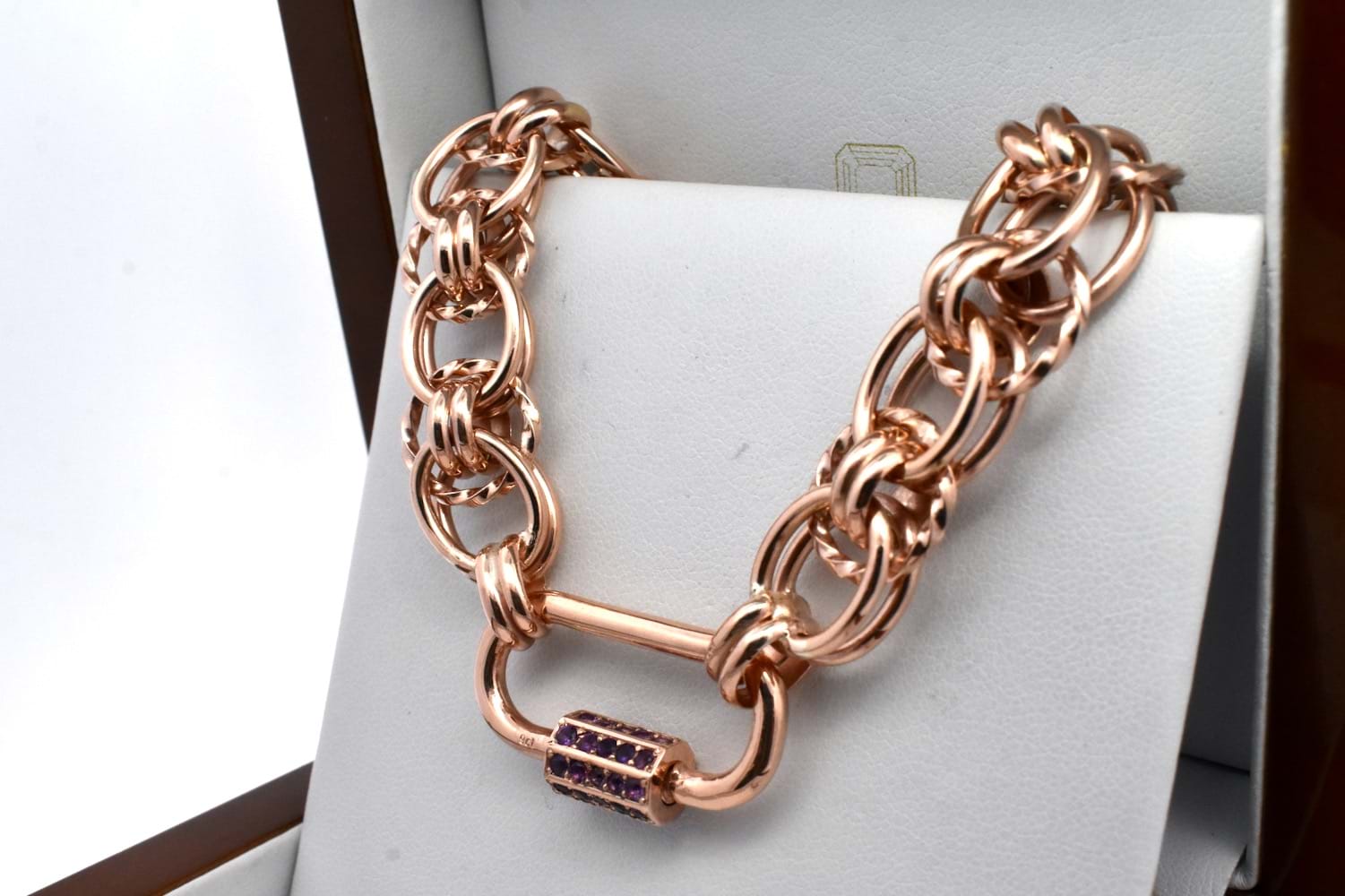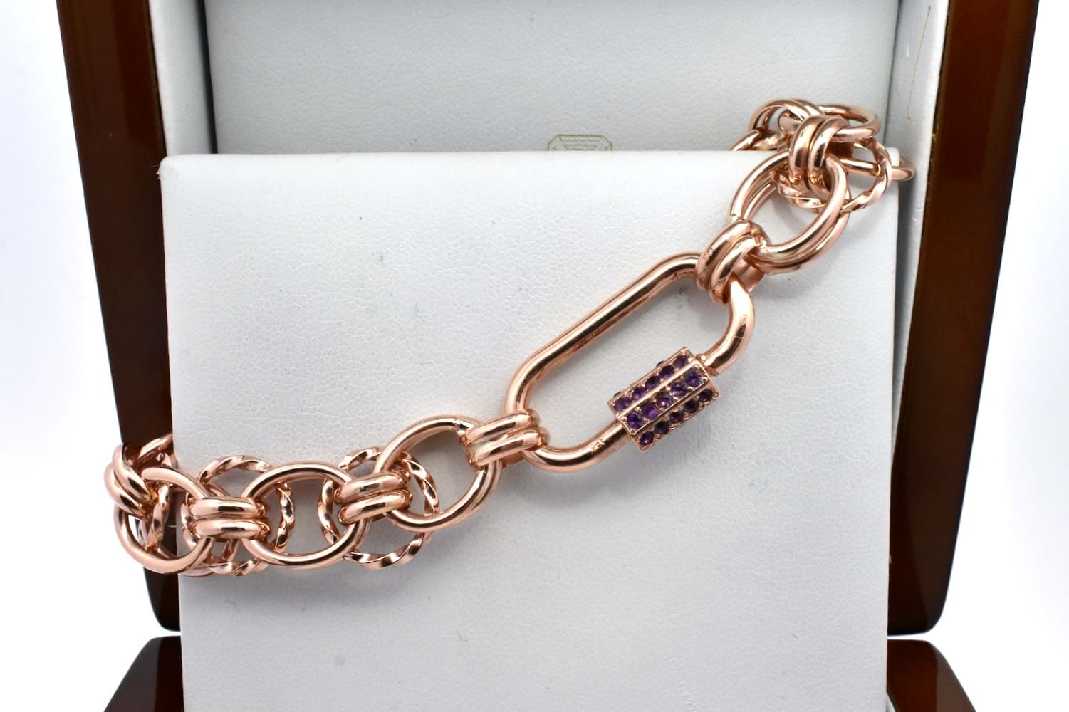 Stunning handmade fancy link bracelet beautifully made by our goldsmith in 9ct rose gold with end finials and our signature oval carabiner clasp and the custom amethyst set barrel. Total weight 36.14grams.