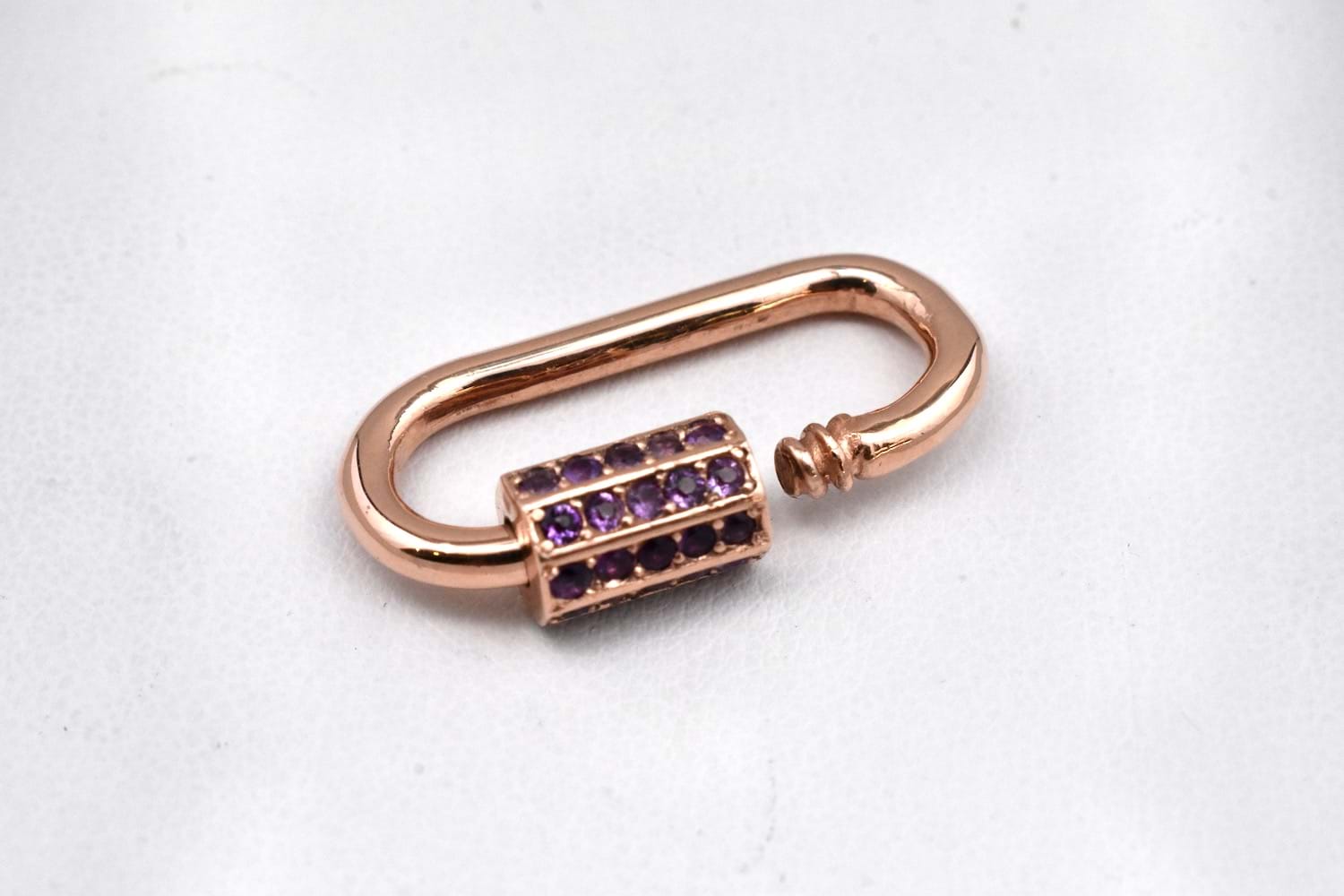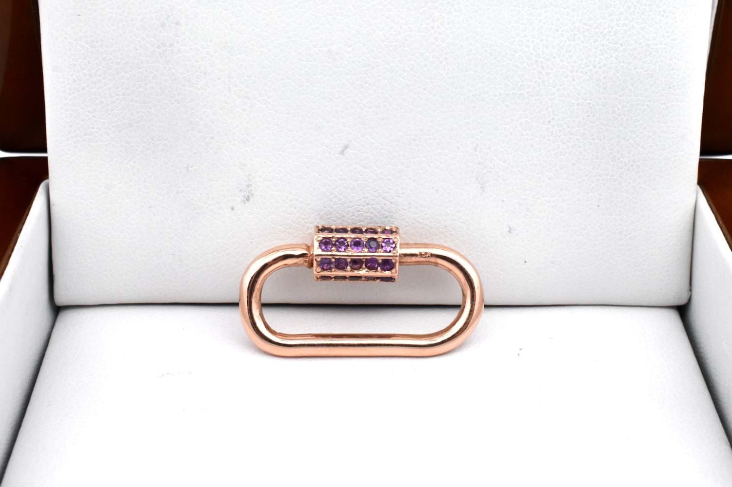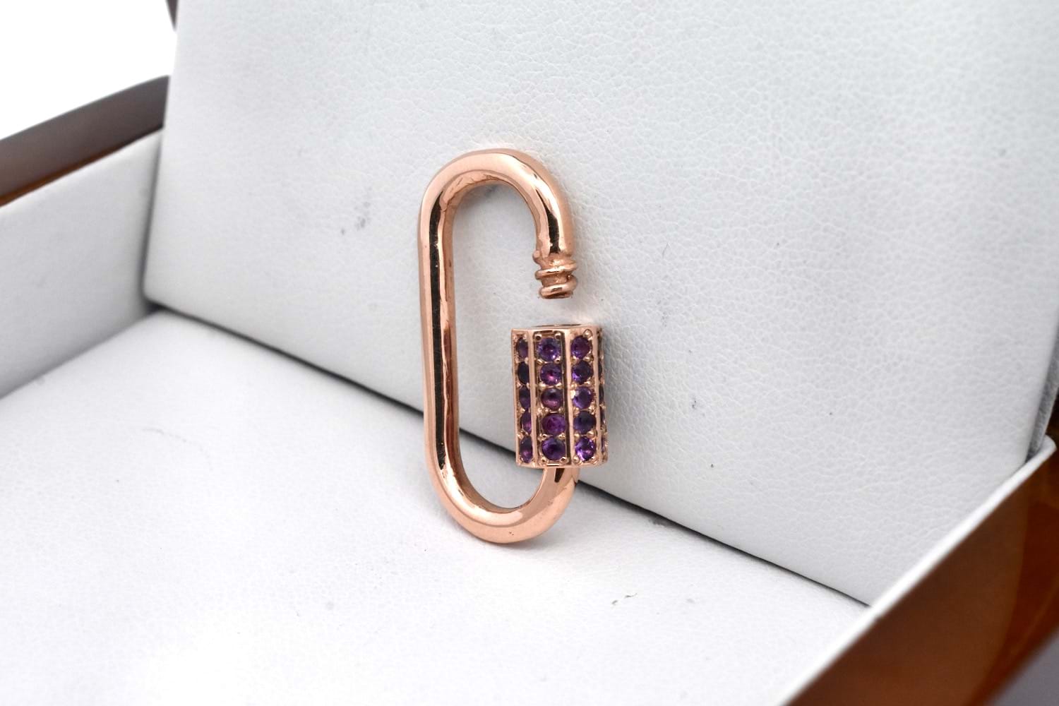 Stunning handmade fancy link bracelet beautifully made by our goldsmith in 9ct rose gold with end finials and our signature oval carabiner clasp and the custom amethyst set barrel. Total weight 36.14grams.