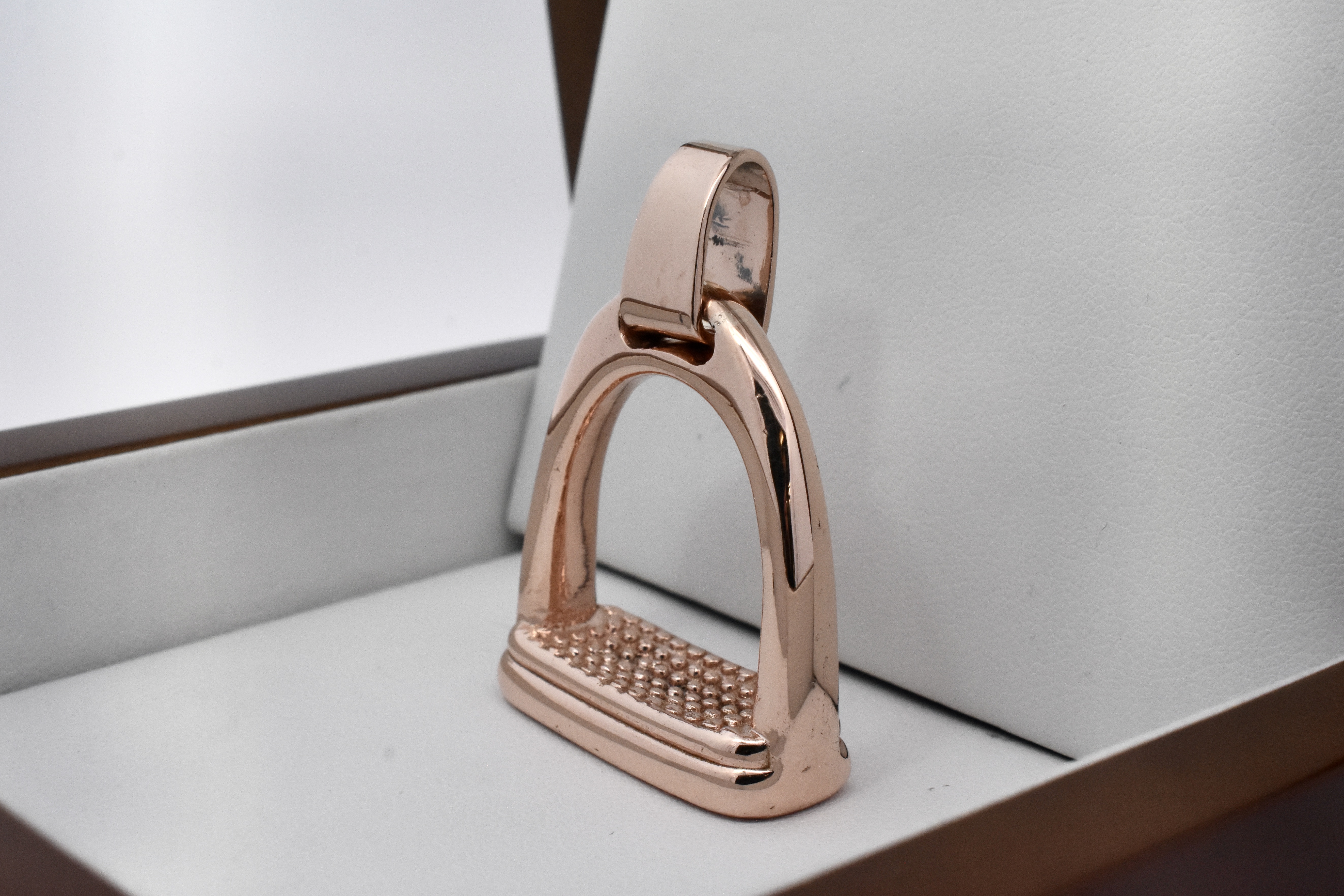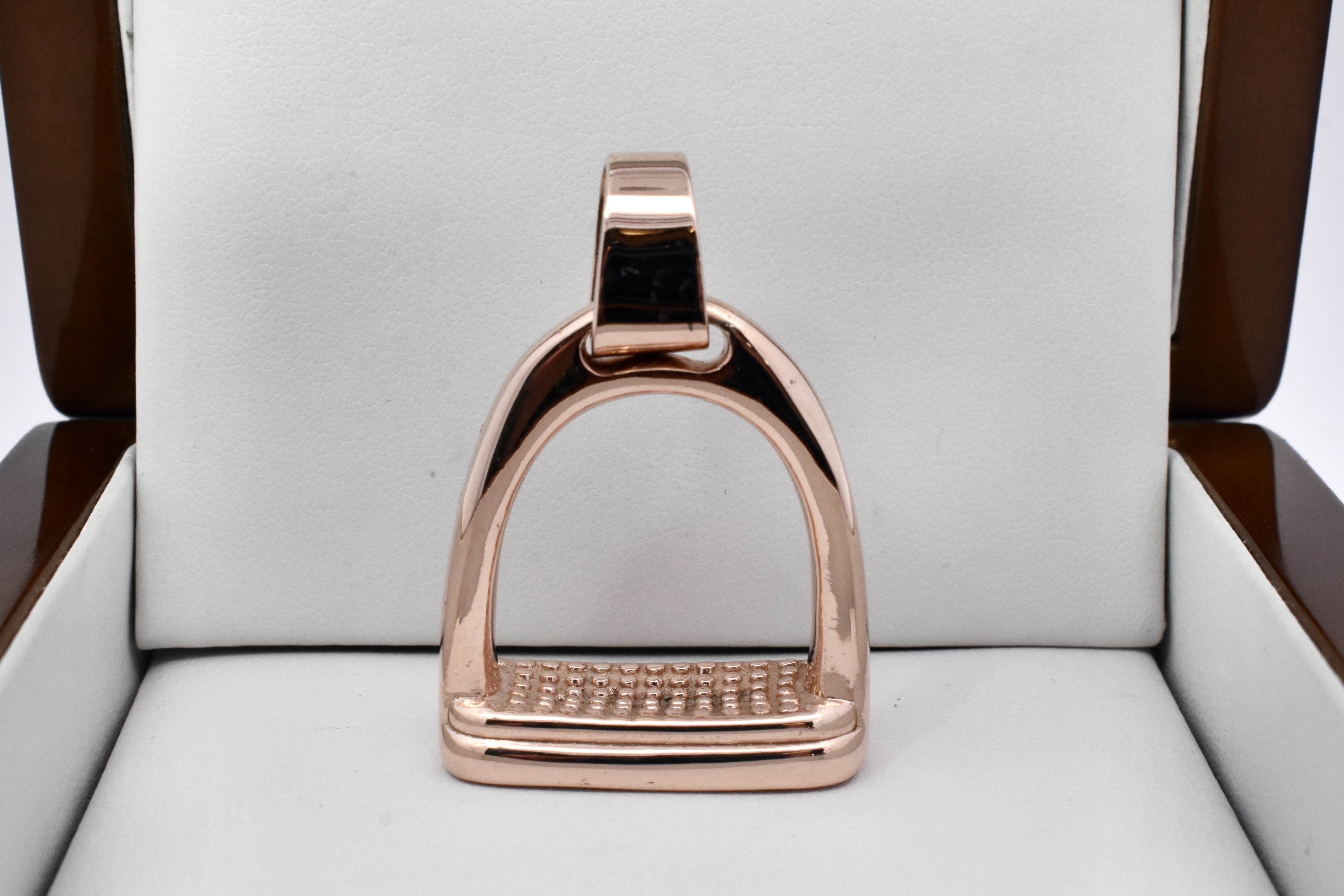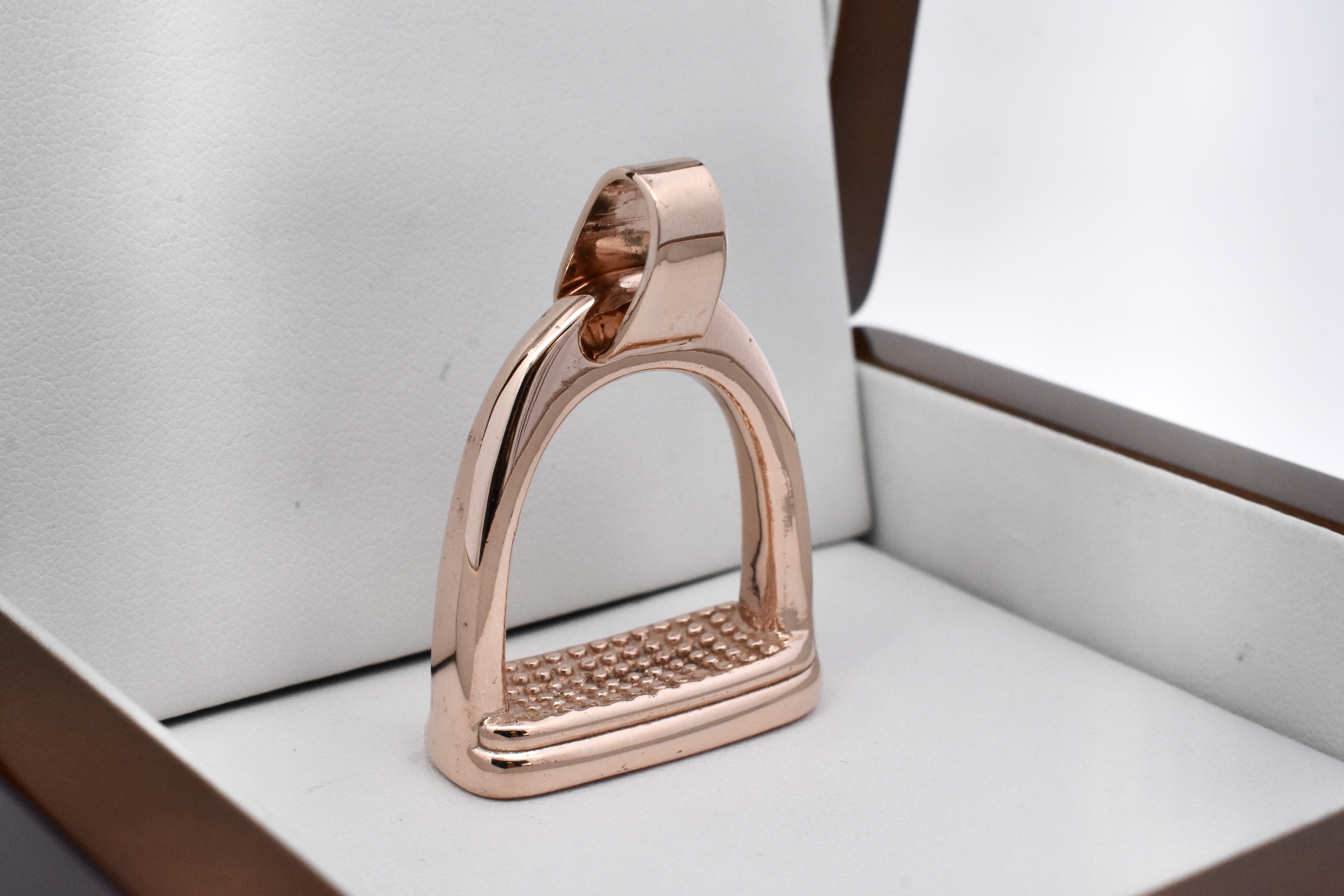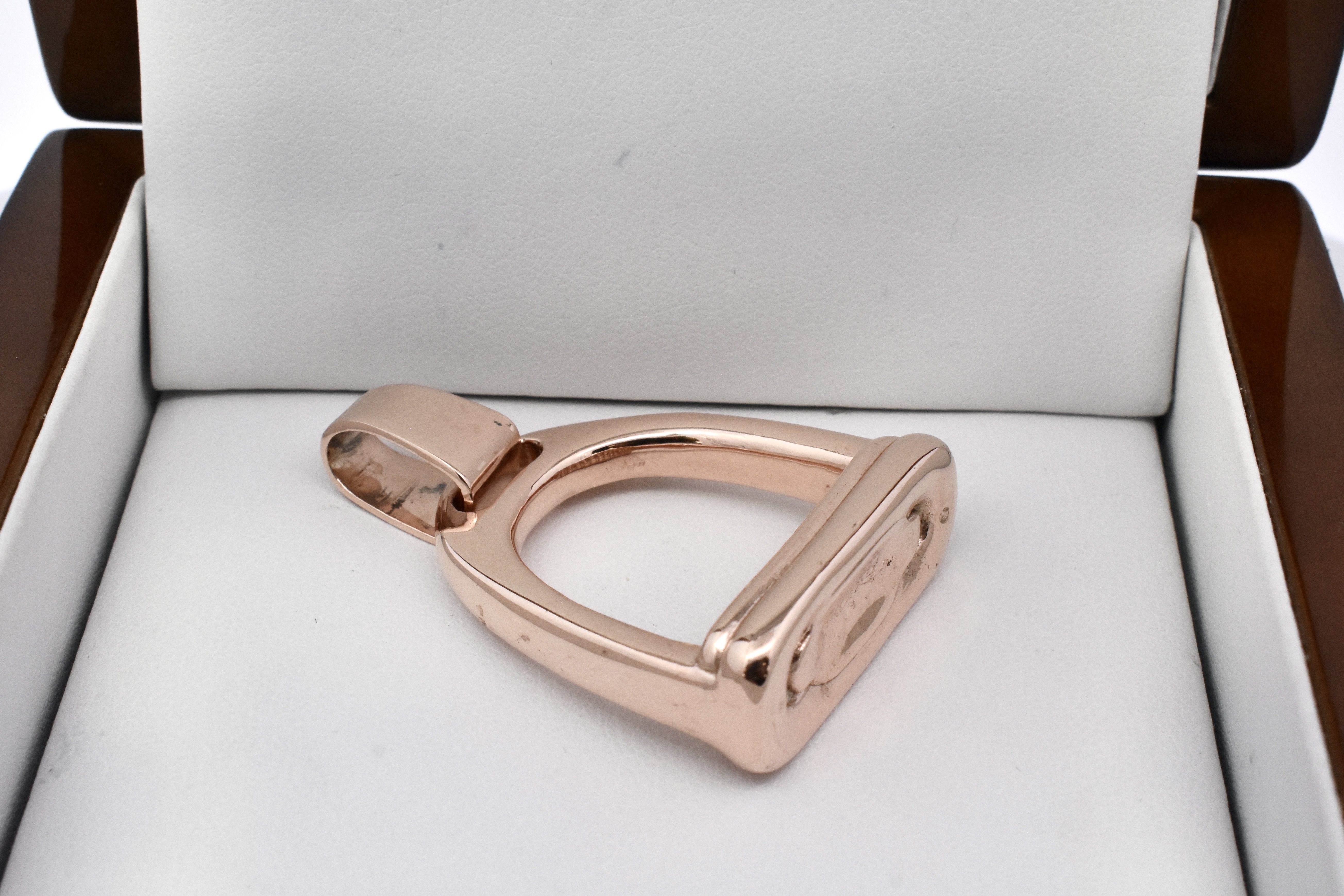 This solid 9ct rose gold stirrup pendant was made by goldsmith after taking a mould of the clients silver pendant. The piece weighs an impressive 29grams.
