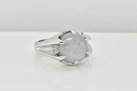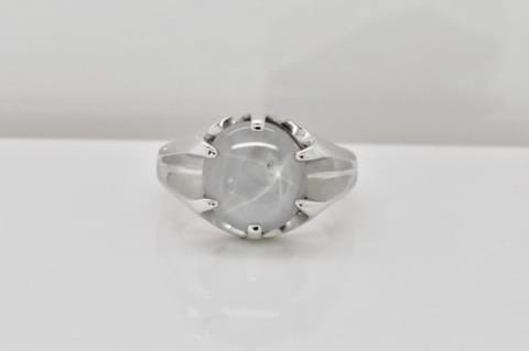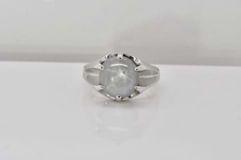 This magical 10.80ct blue/grey star sapphire is of Burmese origin and displays an absolutely mesmorising diffuse double 6 ray star which is visible in all lighting. Hand chosen by it's passionate gem collecting owner, this fantastic example of a star sapphire has been set into a bespoke 9ct white gold ring inspired by the gypsy rings of the late 1800's. This piece was given a contemporary twist and perfectly serves its purpose of showcasing it's rare and eye catching caochon centre piece. Independent Valuation Supplied. This bespoke creation is being enjoyed by its new owner, if you are inspired by this archived design contact us today to discuss how we can create something incredible for you or your loved one.