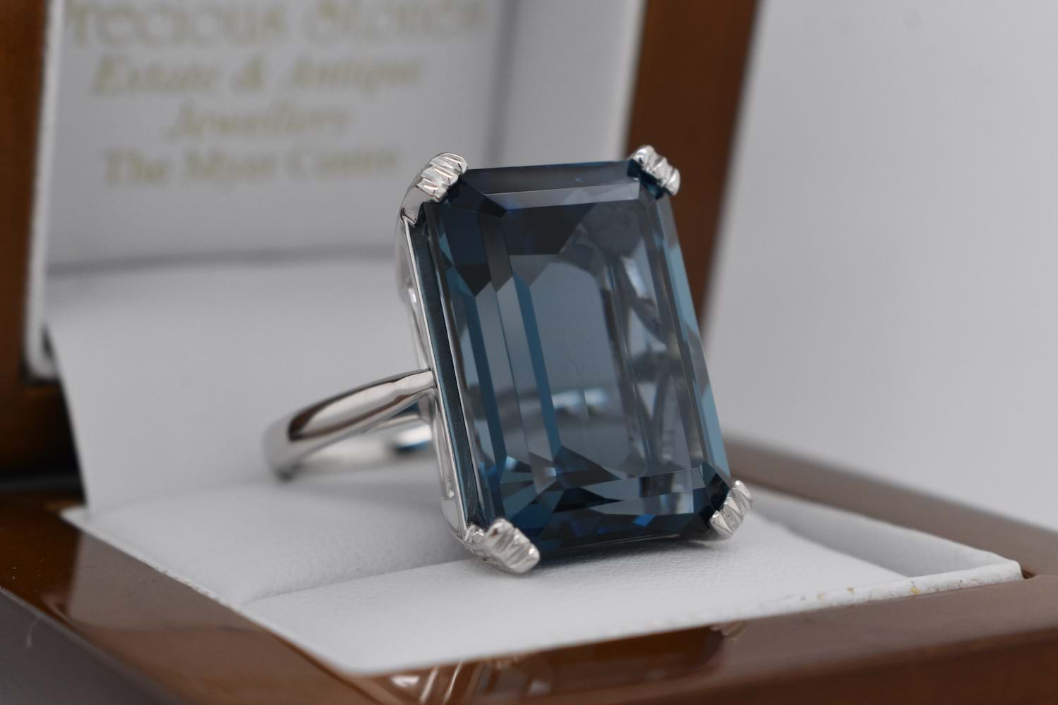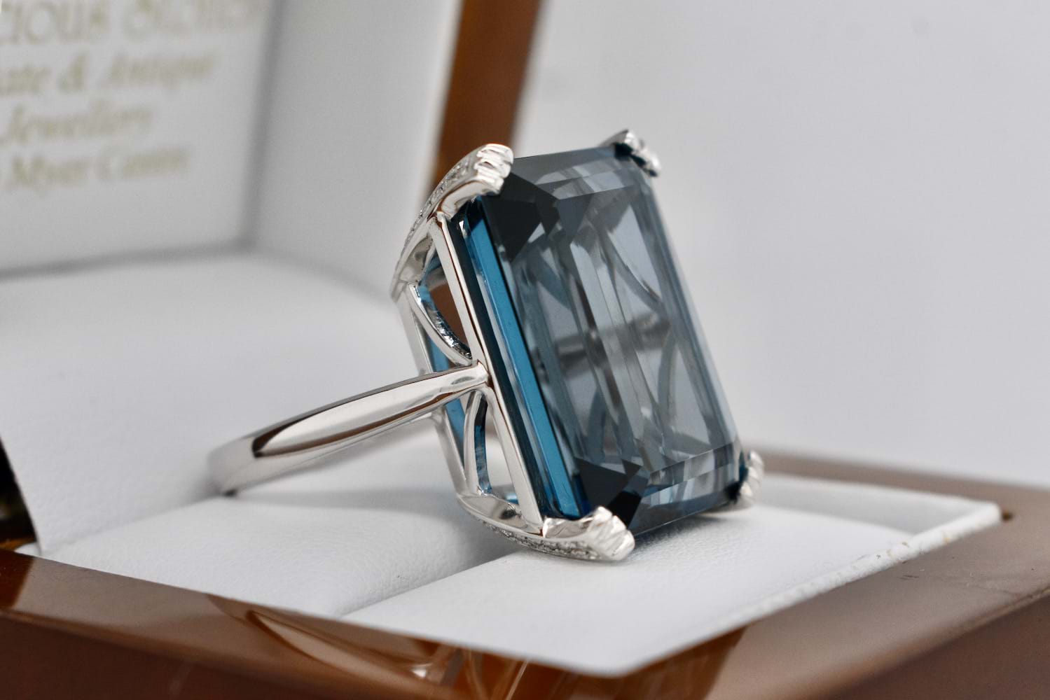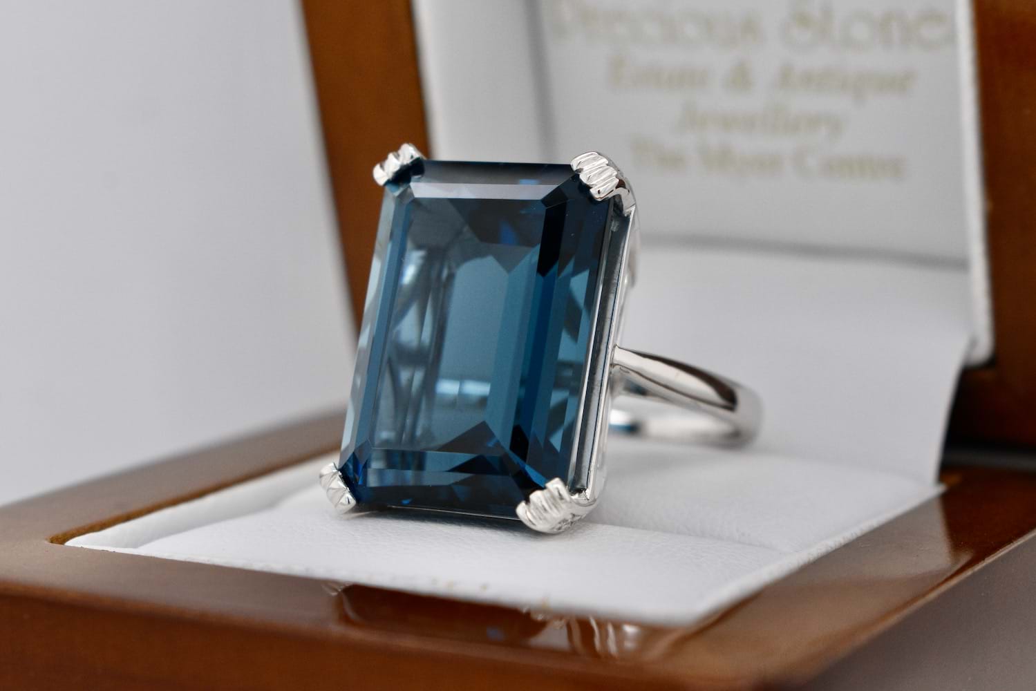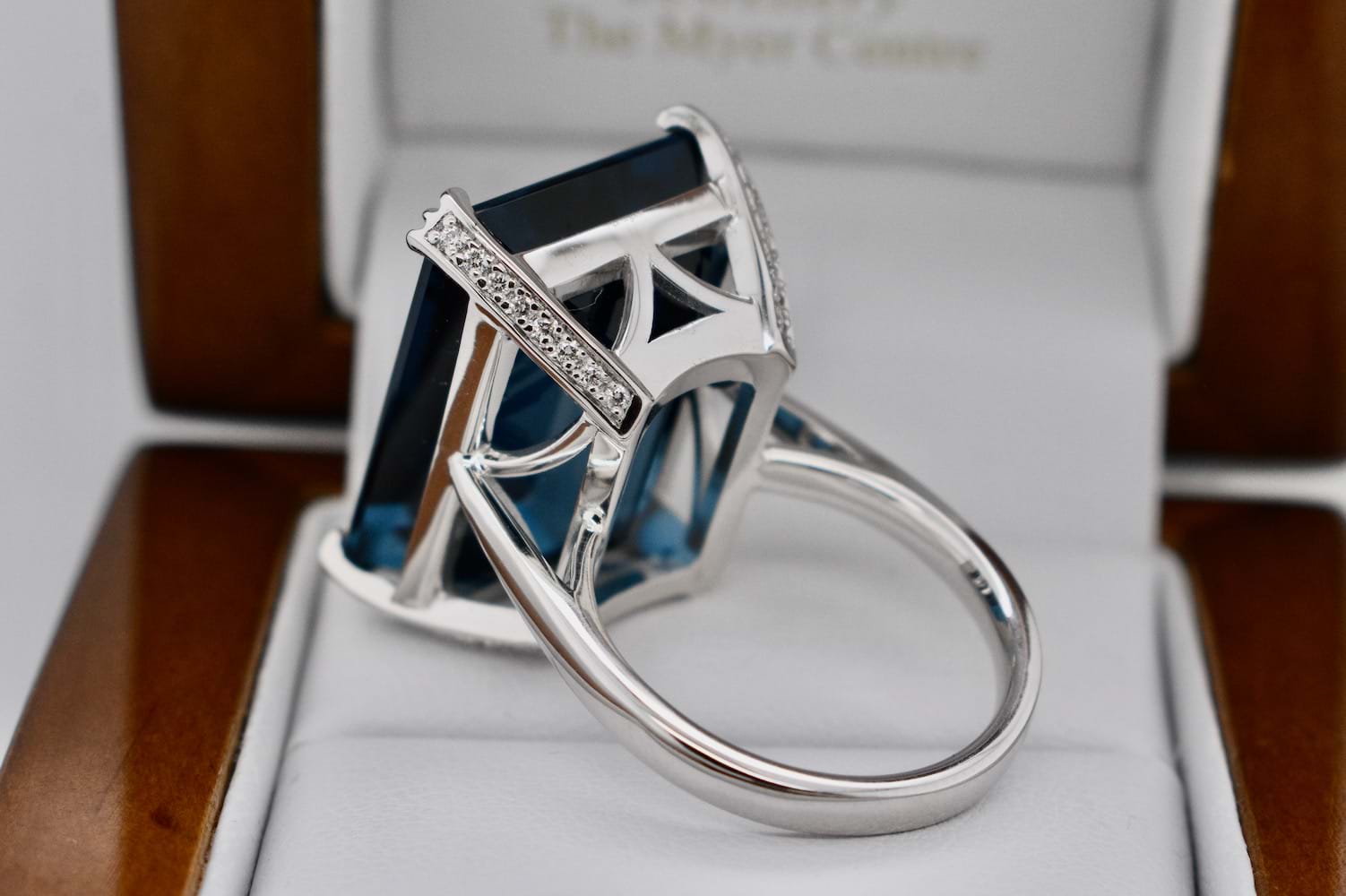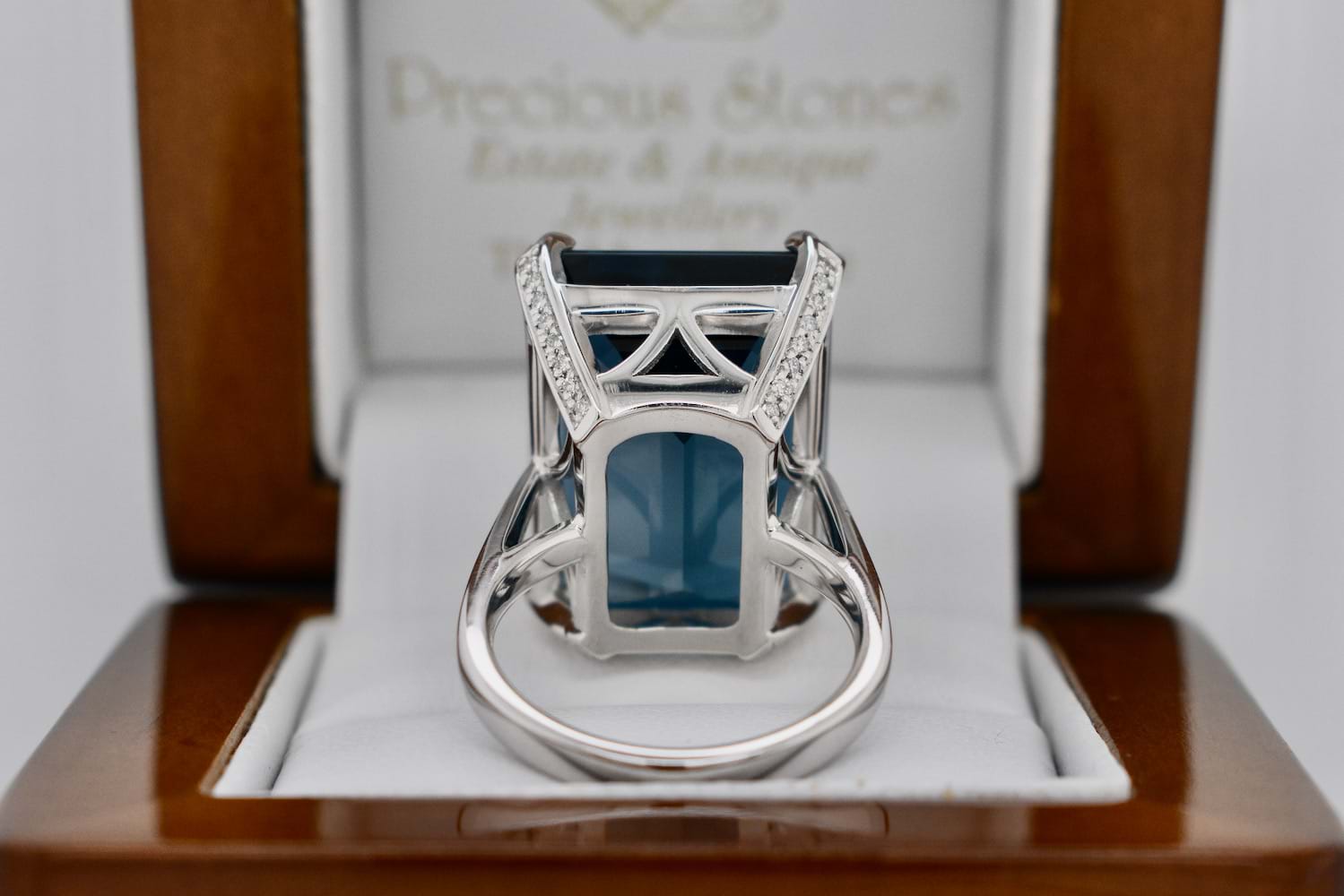 Epic and eye catching. This 36.70ct emerald cut London blue topaz has been four grooved claw set in 9ct white gold with a fancy gallery and diamonds set into the sides of the claw setting. With a plain solid band, this ring is stunning from every angle, the 32 round brilliant cut diamonds total 0.18cts FG/VS-SI. Independent Valuation Supplied.