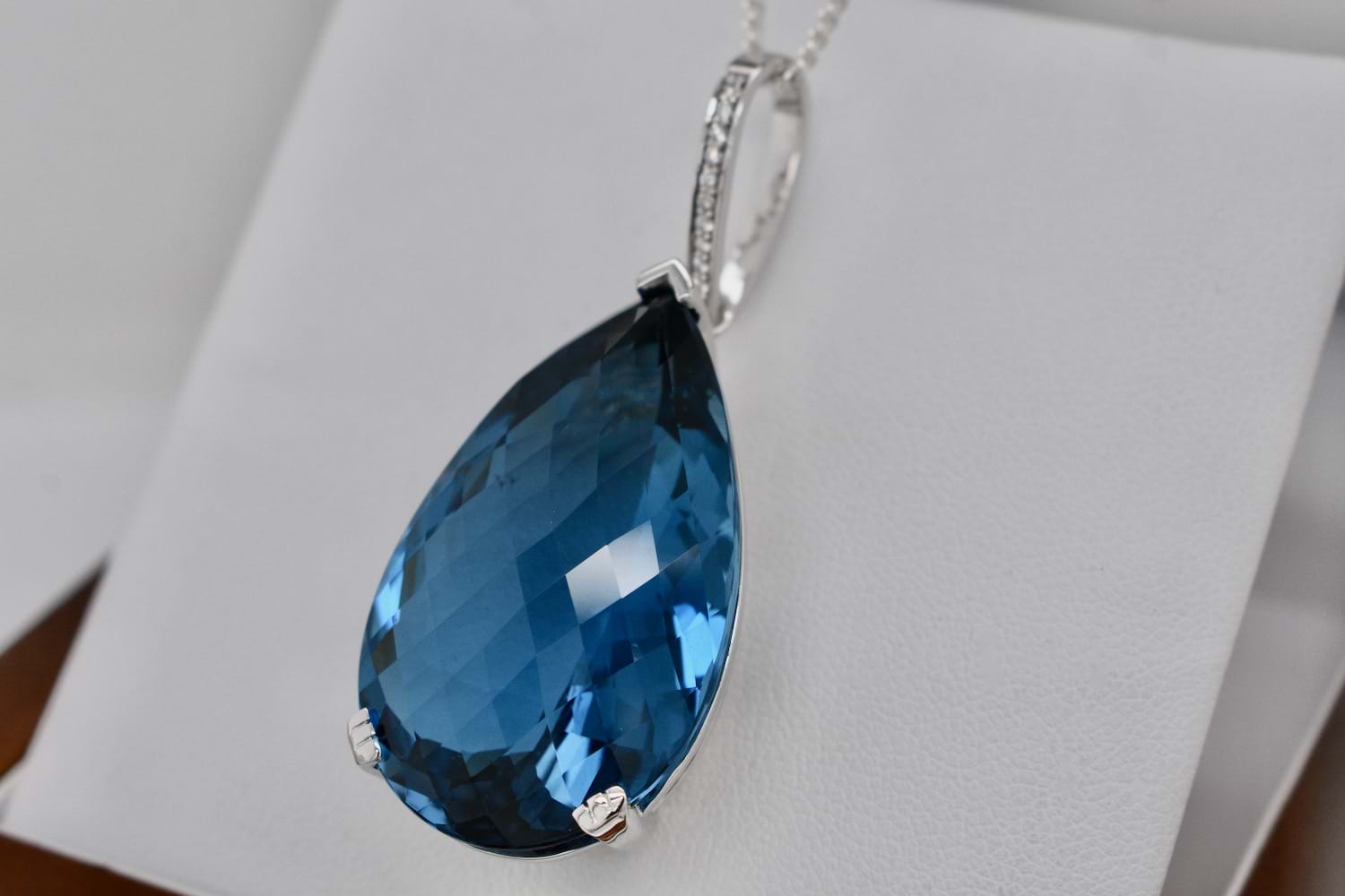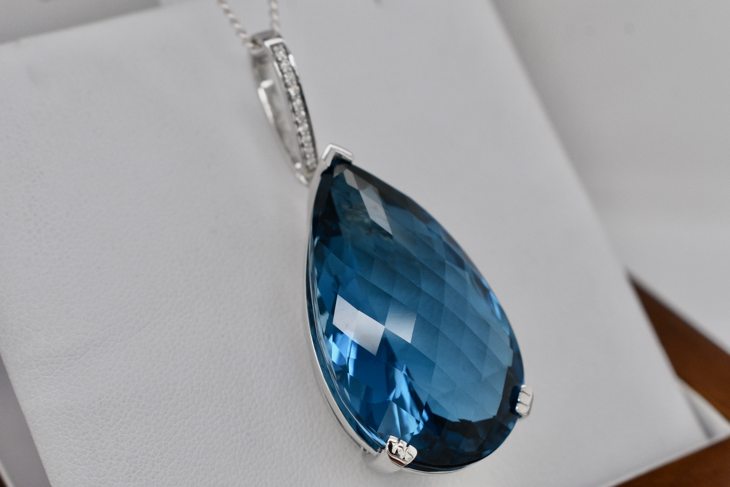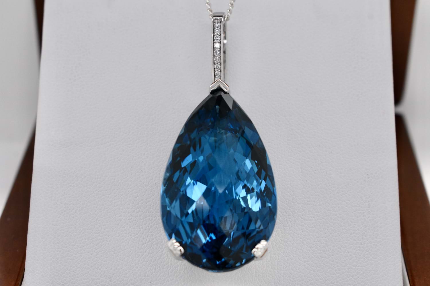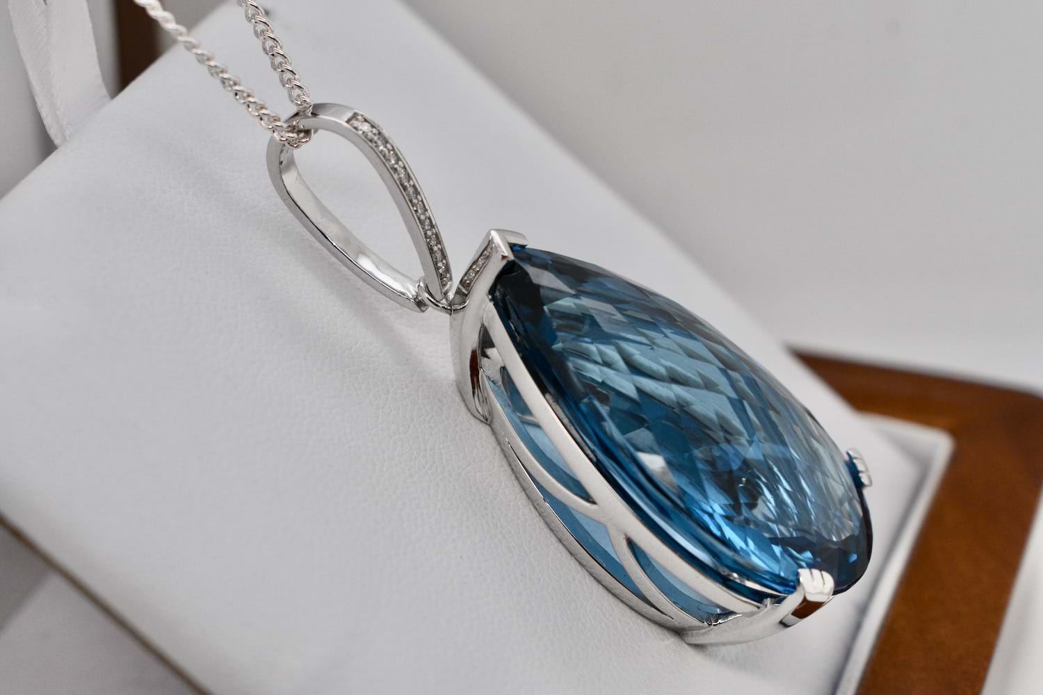 This epic faceted teardrop London blue topaz is an amazing 68.10cts measuring 36x21mm and was hand selected in store by the client to be the feature of this simple and feminine pendant. Designed to work alongside her ring crafted by the store previously, this pendant is crafted in 9ct white gold and is cap and two claw set with a scroll gallery and diamond set bale. Diamonds total 0.08cts. Independent Valuation Supplied.