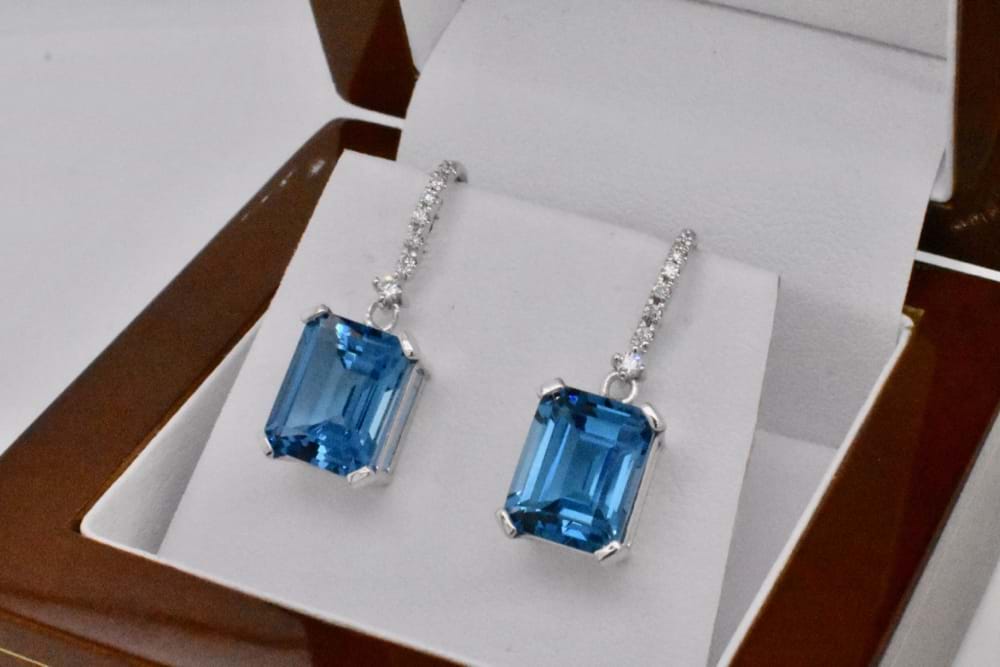 A perfectly cut and matched pair of emerald cut London blue topaz hand selected to match a previously purchased pendant. Crafted in 9ct white gold these drop earrings have an accent of sparkling diamonds and the topaz total an impressive 8.00cts. Independent Valuation Supplied. If you are inspired by this archived design contact us today to discuss how we can create something incredible for you or your loved one.