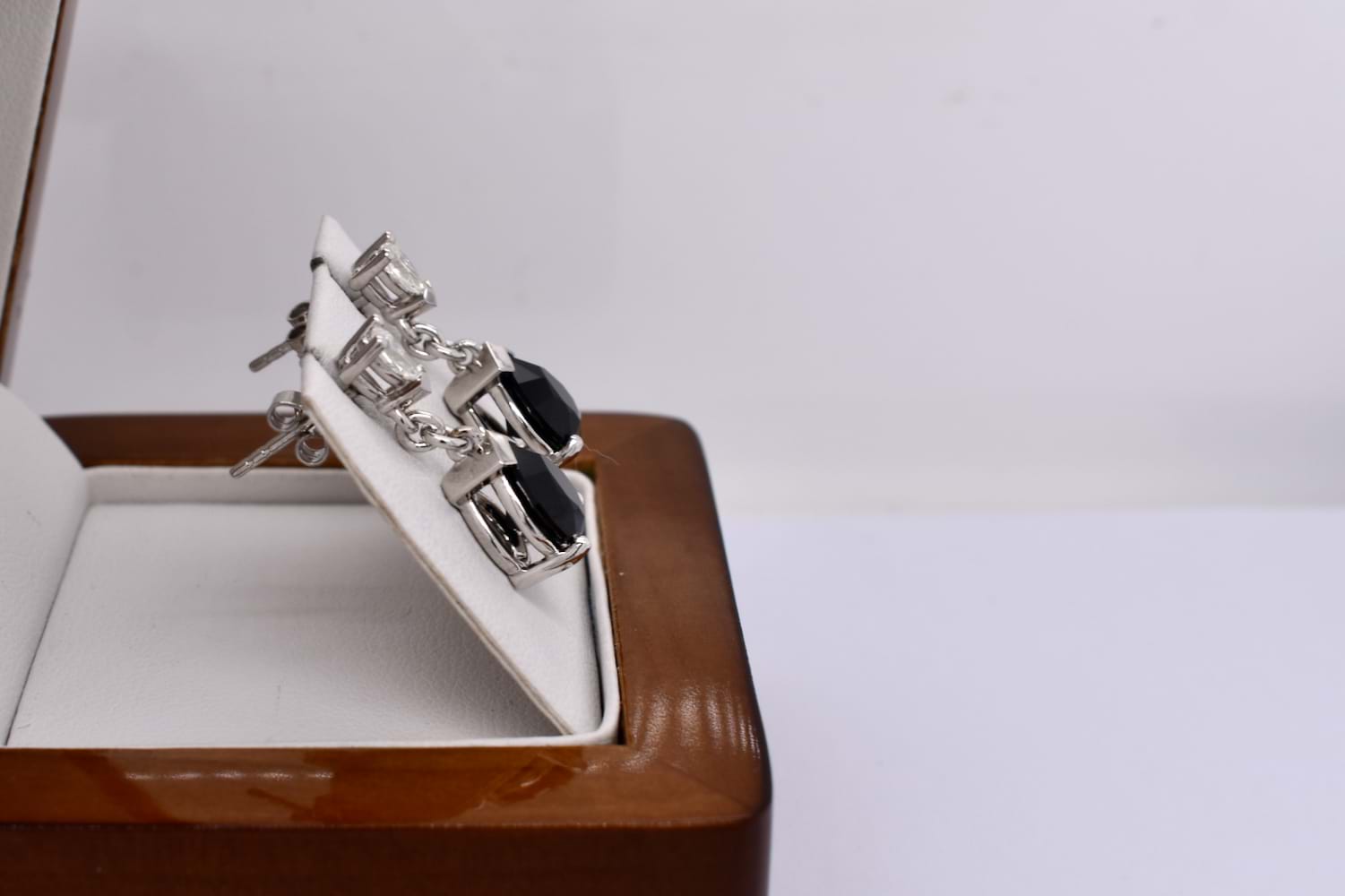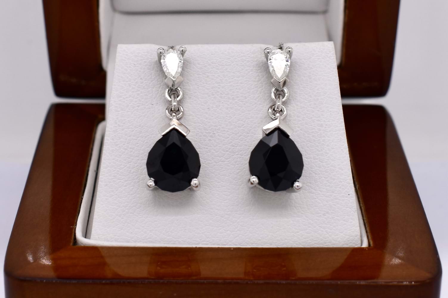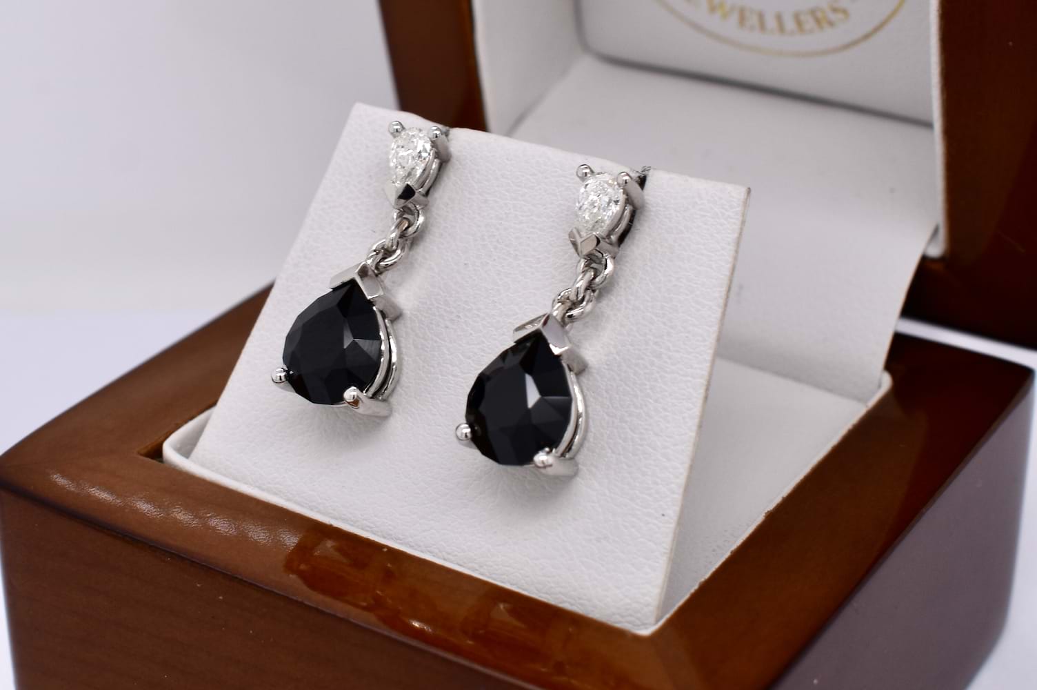 Custom made especially for our client with pearshape spinels supplied by them, these earrings are 9ct white gold and feature two pearshape diamonds two claw & cap set as the stud top with the black spinels suspended below. The total diamond content equals 0.41ct. This bespoke creation is being enjoyed by its new owner, if you are inspired by this archived design contact us today to discuss how we can create something incredible for you or your loved one