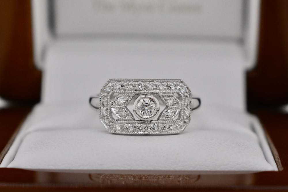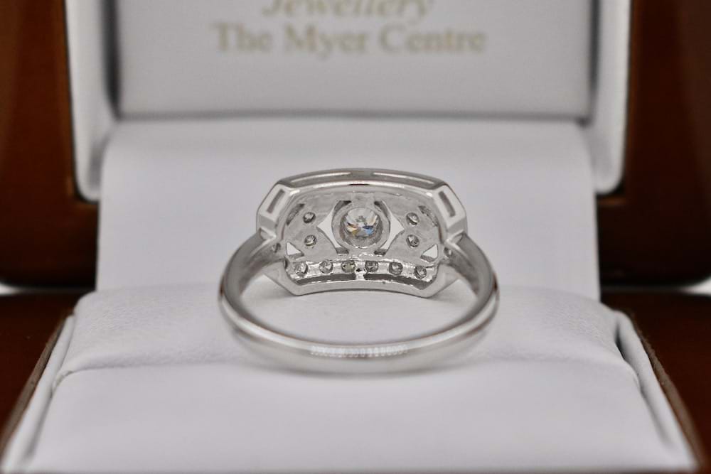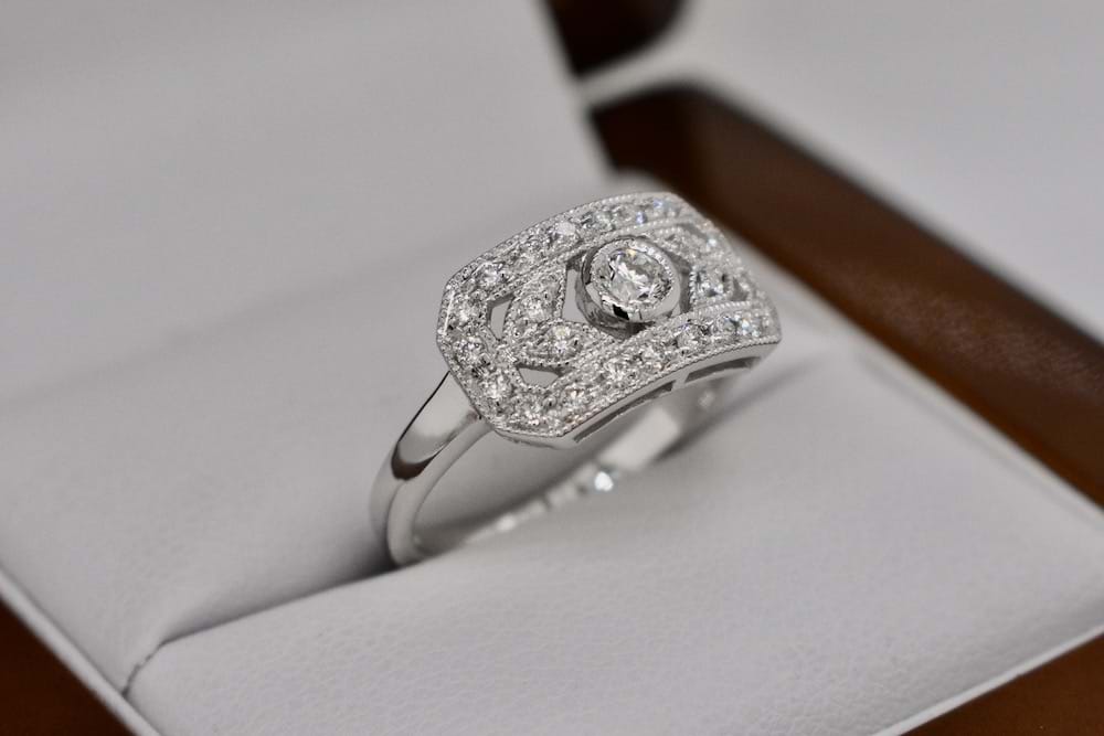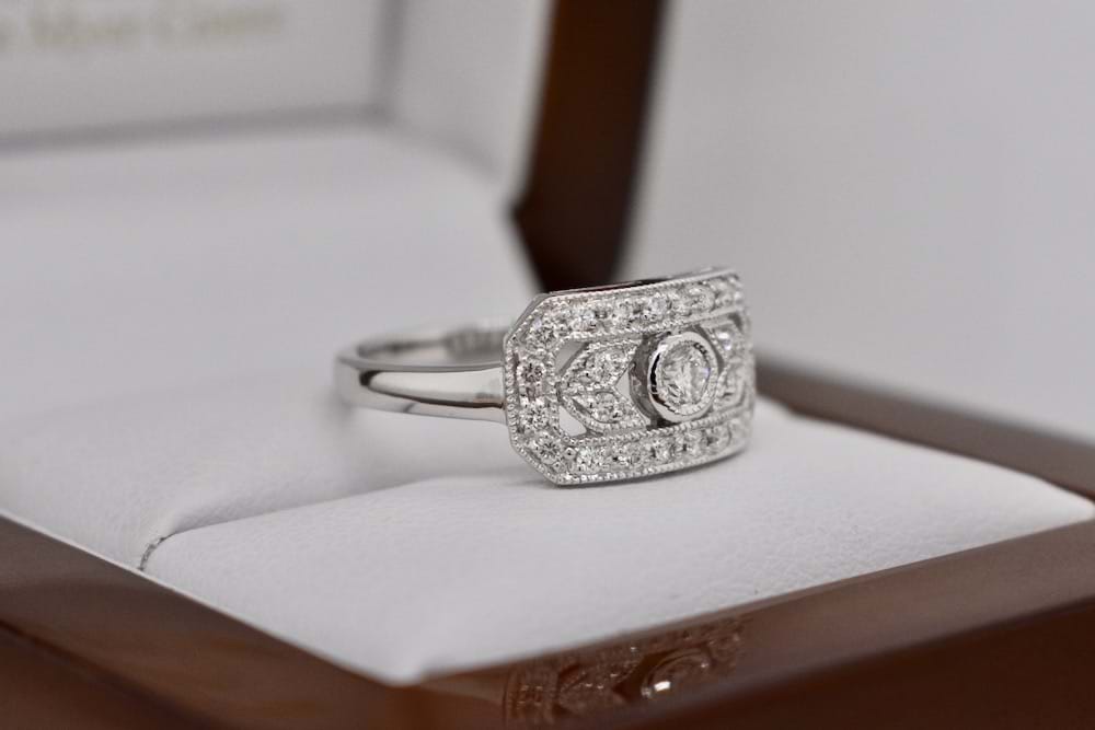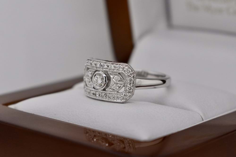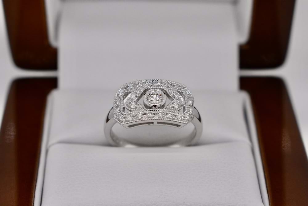 This pretty and feminine ring has been crafted in 9ct white gold in an Art Deco inspired design. Featuring 25 shimmering round brilliant cut diamonds equalling 0.36cts, the ring is designed to sit flat on the finger making it a fantastic ring to wear on its' own. Independent Valuation Supplied.