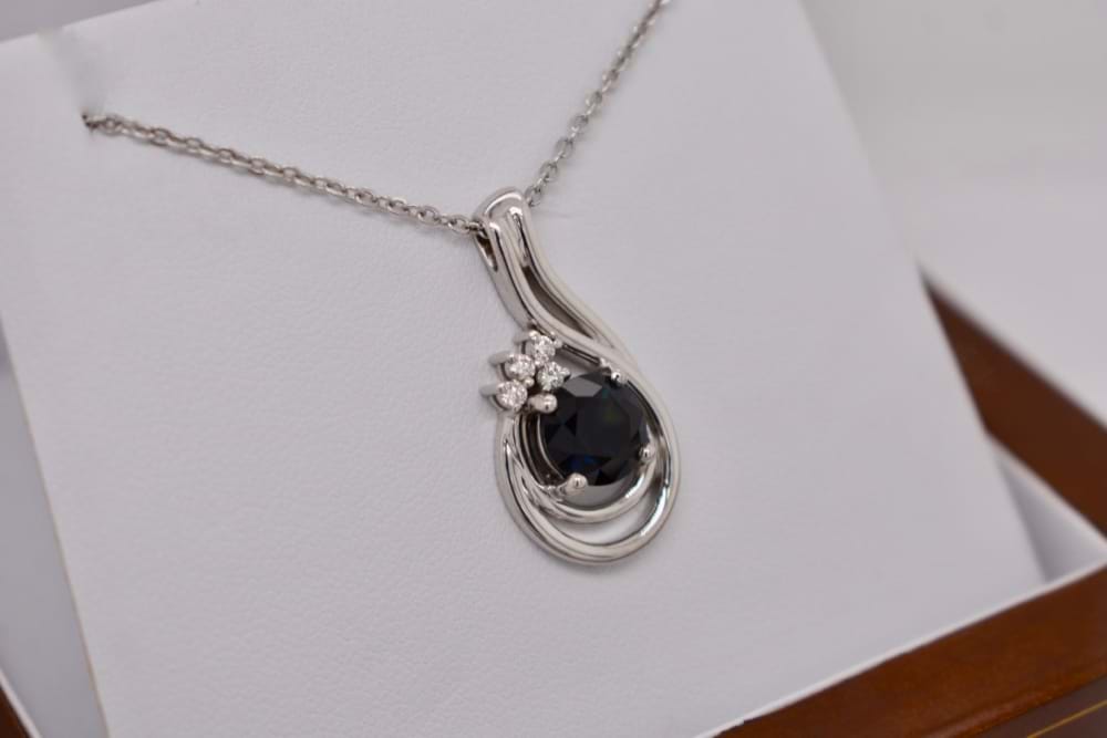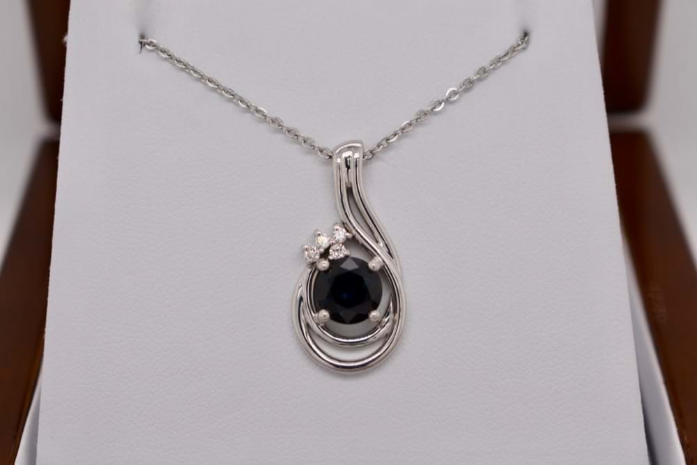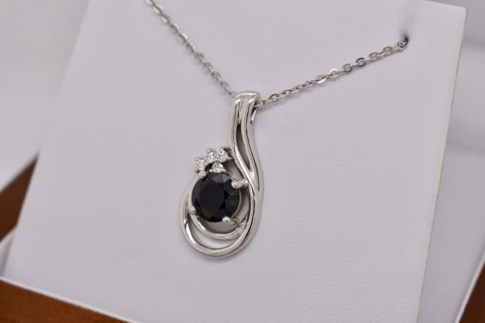 Beautiful 9ct white gold pendant in a swirl design designed for one of our customers. It has a lovely 2.04ct dark blue Sapphire in the centre and 4 round brilliant cut Diamonds totalling 0.10ct in the upper corner, on a 50cm 9ct white gold oval link chain with bolt ring clasp
