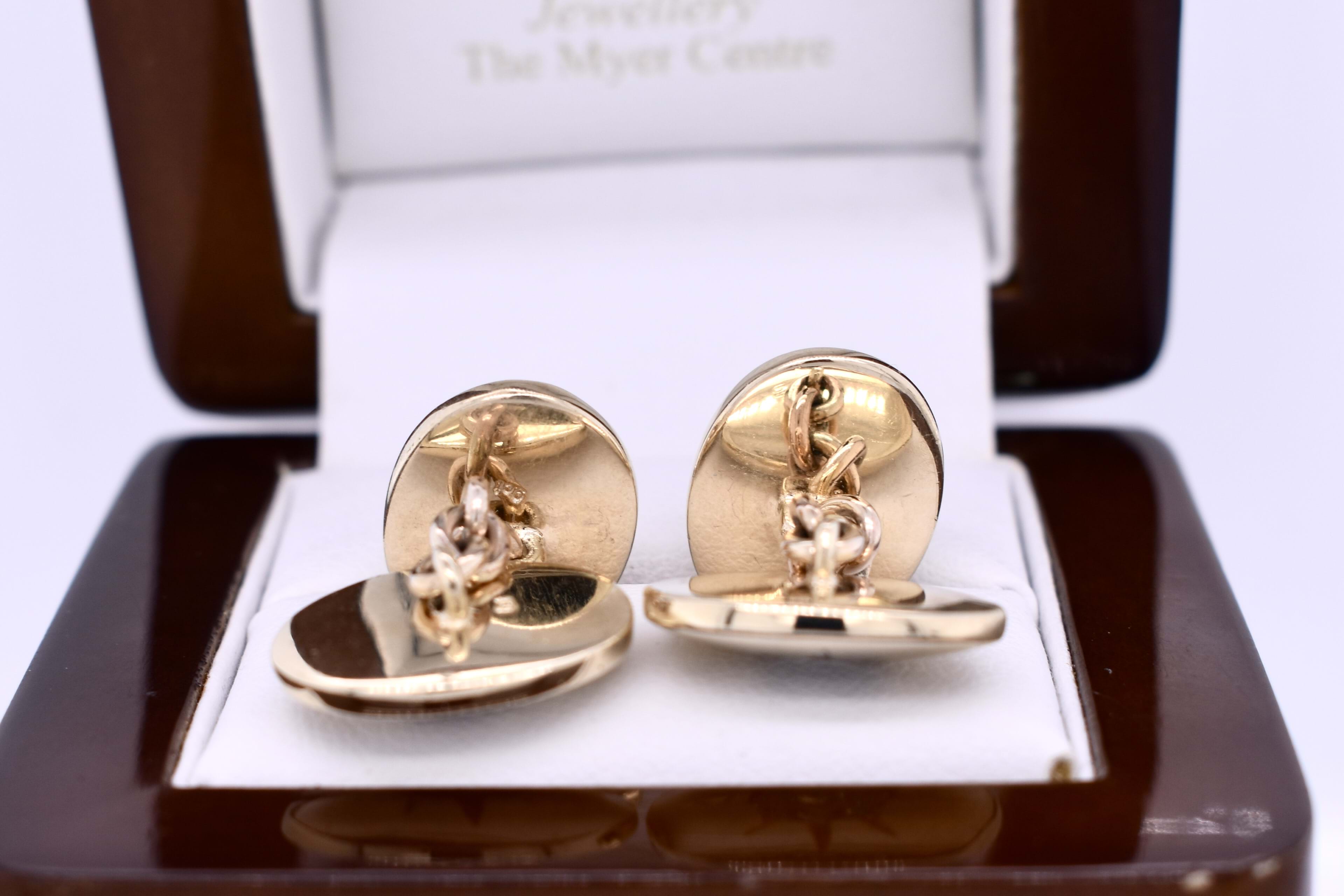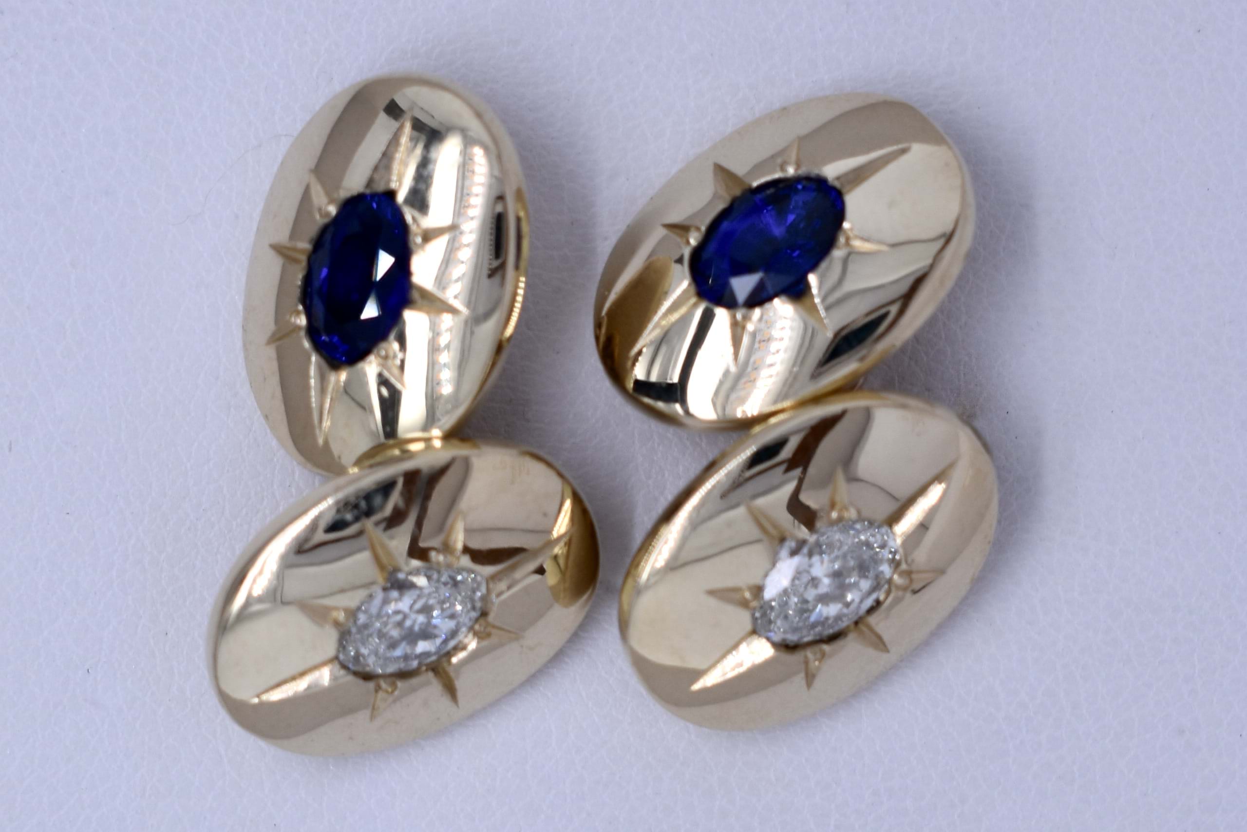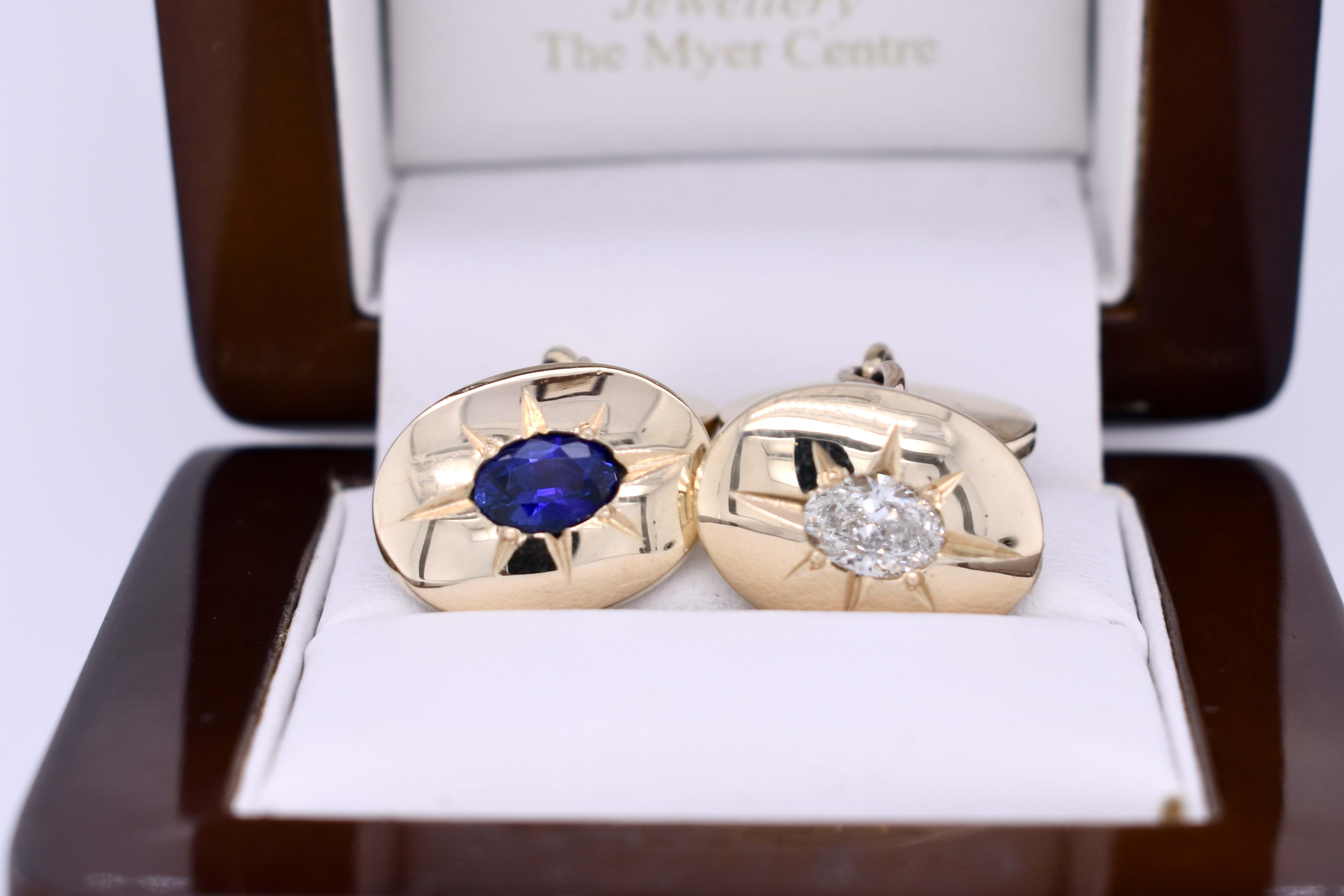 These custom made cufflinks were handmade by our goldsmith in solid 9ct yellow gold. Each pair features a star set oval bright, dark blue, sapphire and a star set oval natural diamond. The stunning sapphires total 1.97cts and the two diamonds are GIA certified H colour, SI2 clarity and total 1.71cts. These cufflinks can made to suit different budgets, and using stones of your preference. Independent Valuation Supplied.