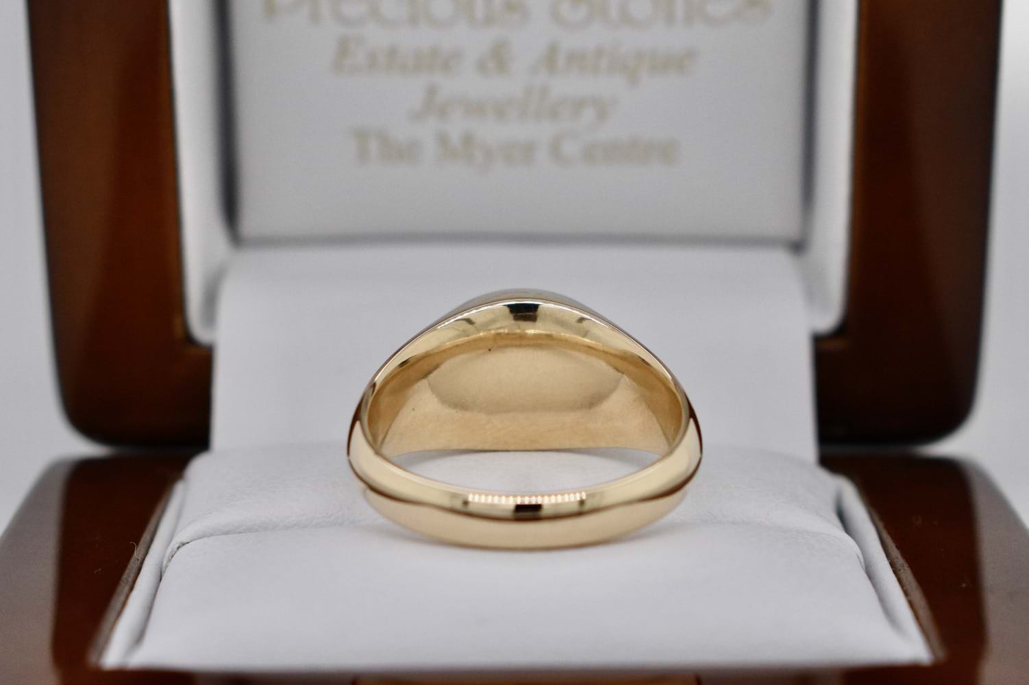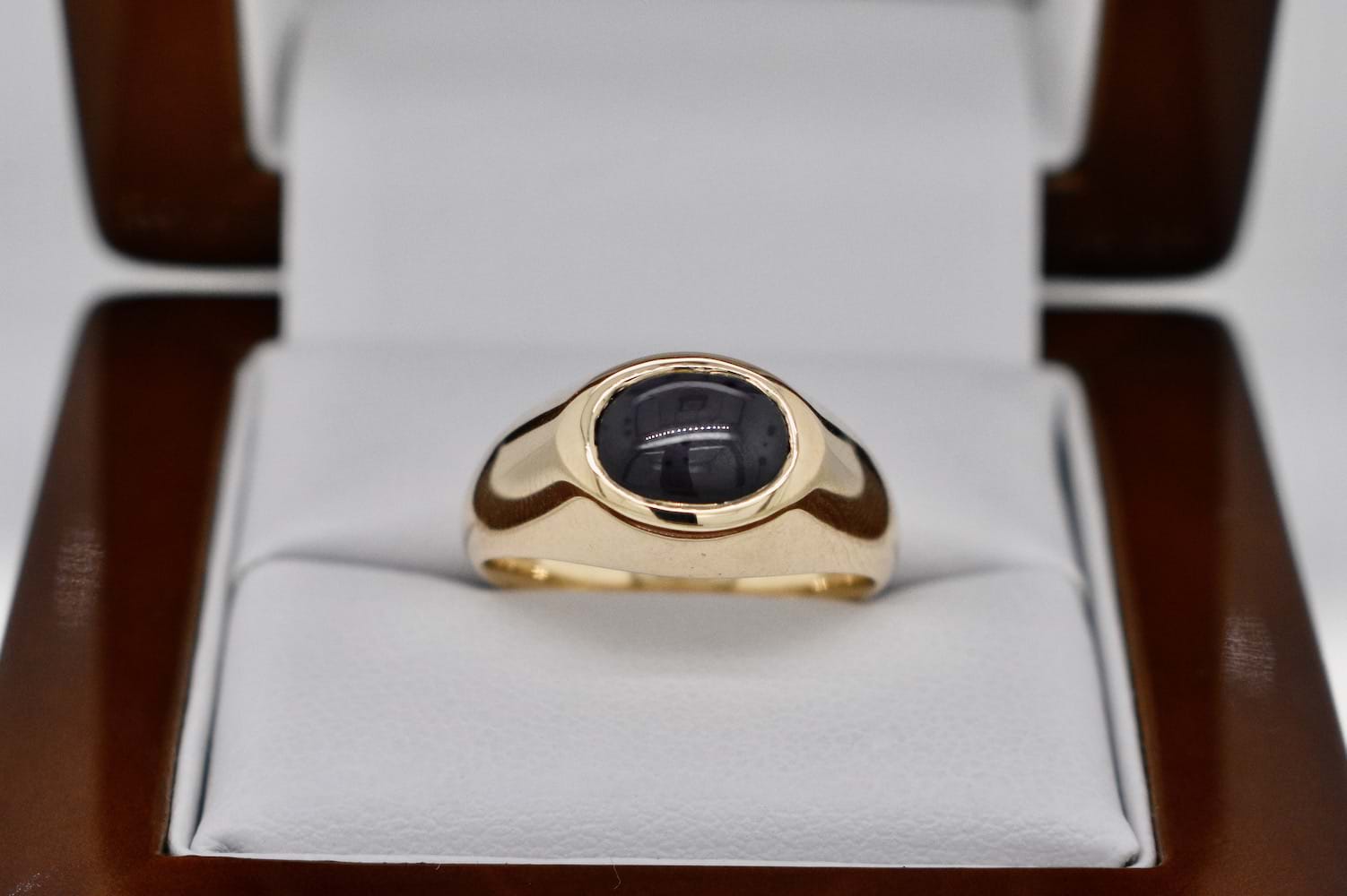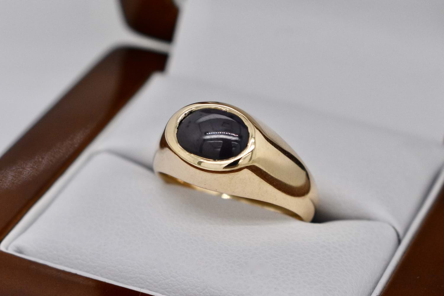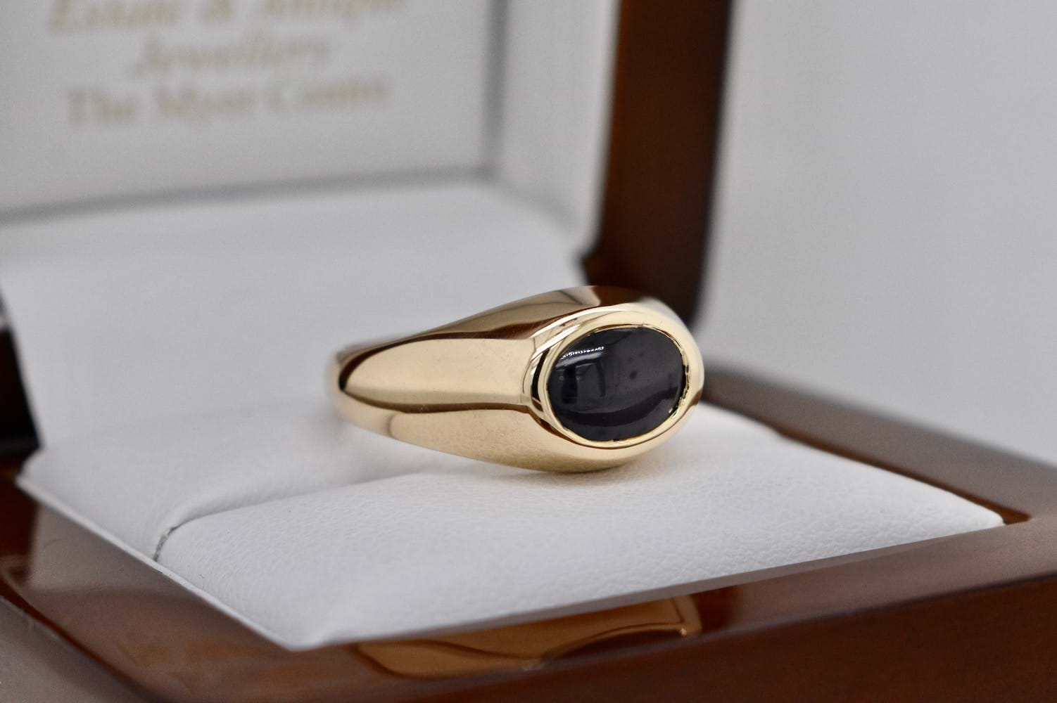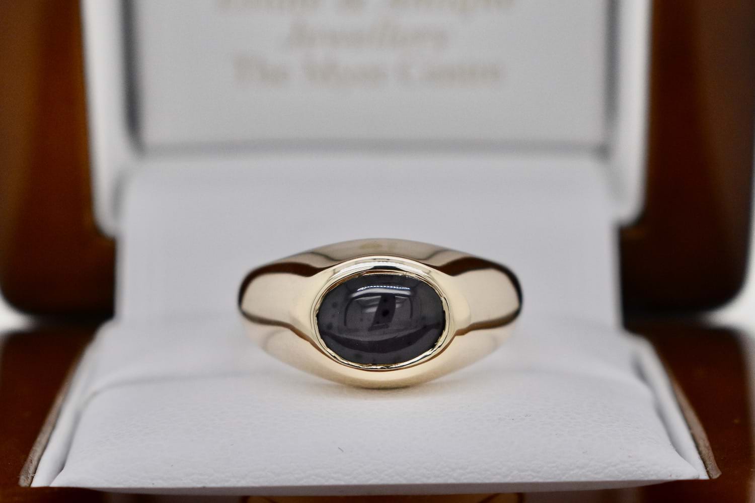 This rare and unusual spotted spinel is 2.31cts and has been bezel set into a classic mens ring crafted in 9ct yellow gold.
