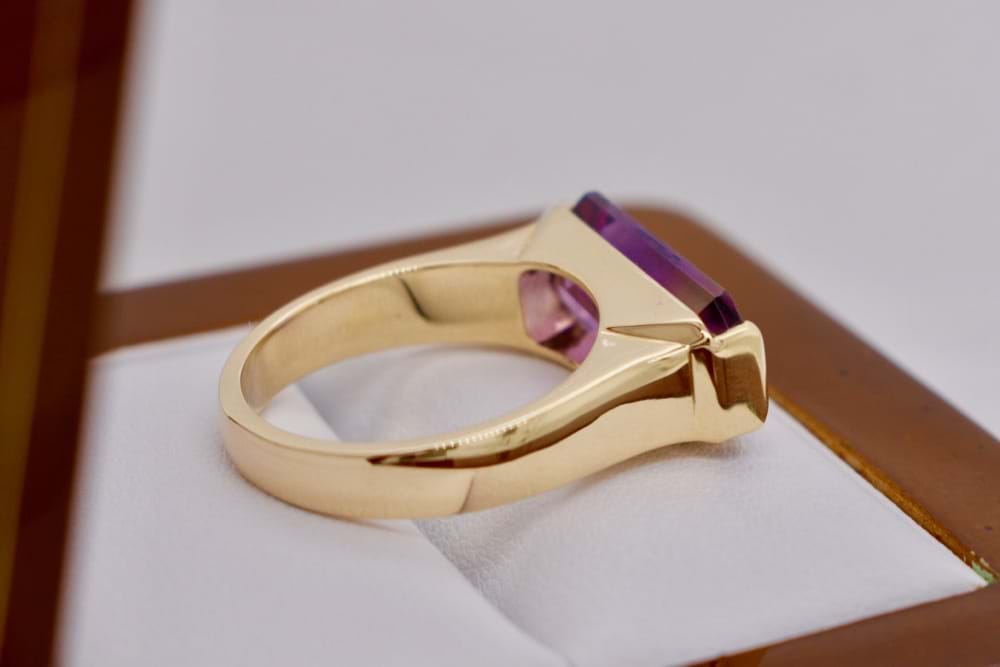An emerald cut 5.00ct ametrine set into a modern design 9ct yellow gold end cap setting with swept up shoulders. Independent Valuation Supplied. If you are inspired by this archived design contact us today to discuss how we can create something incredible for you or your loved one.