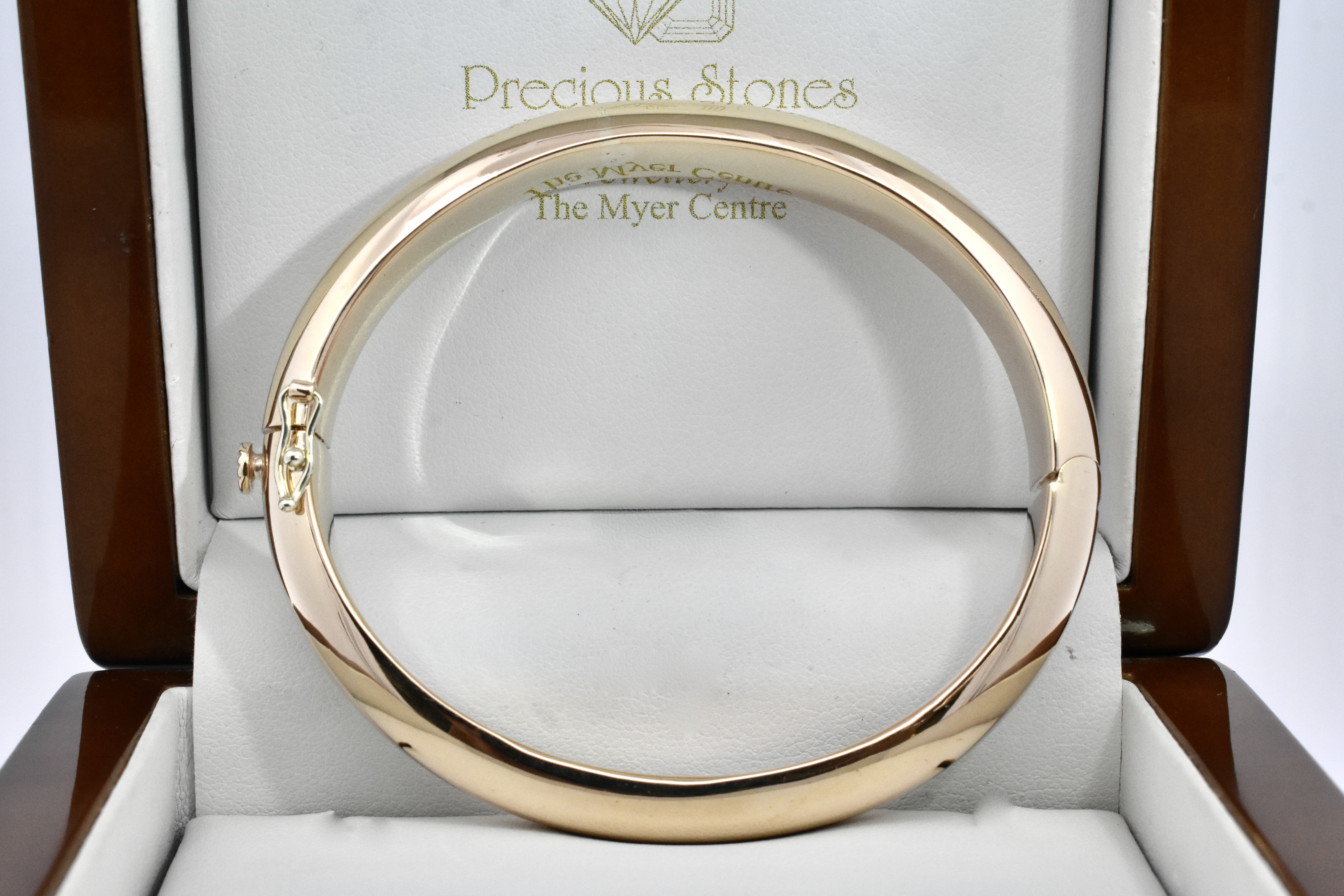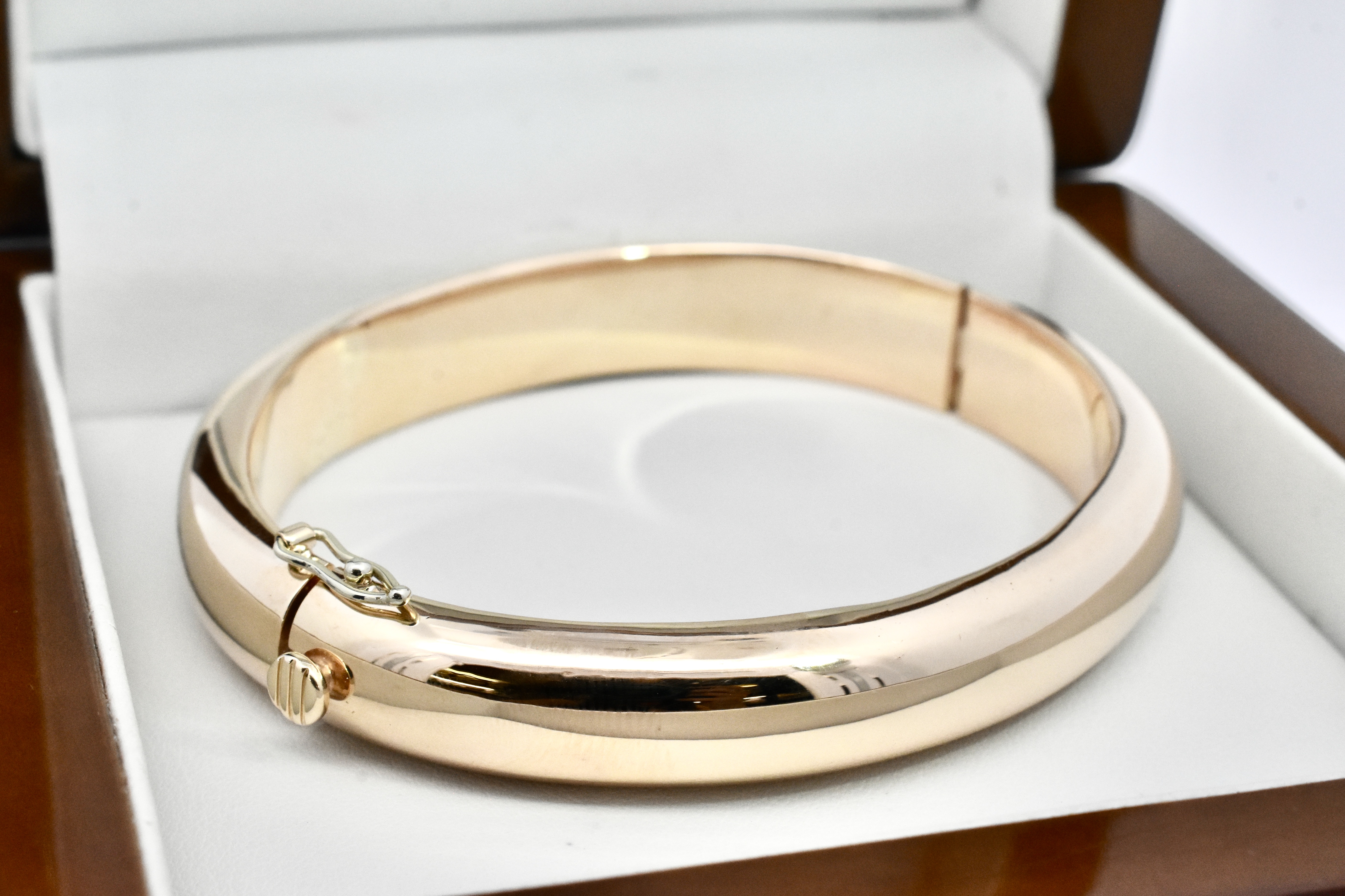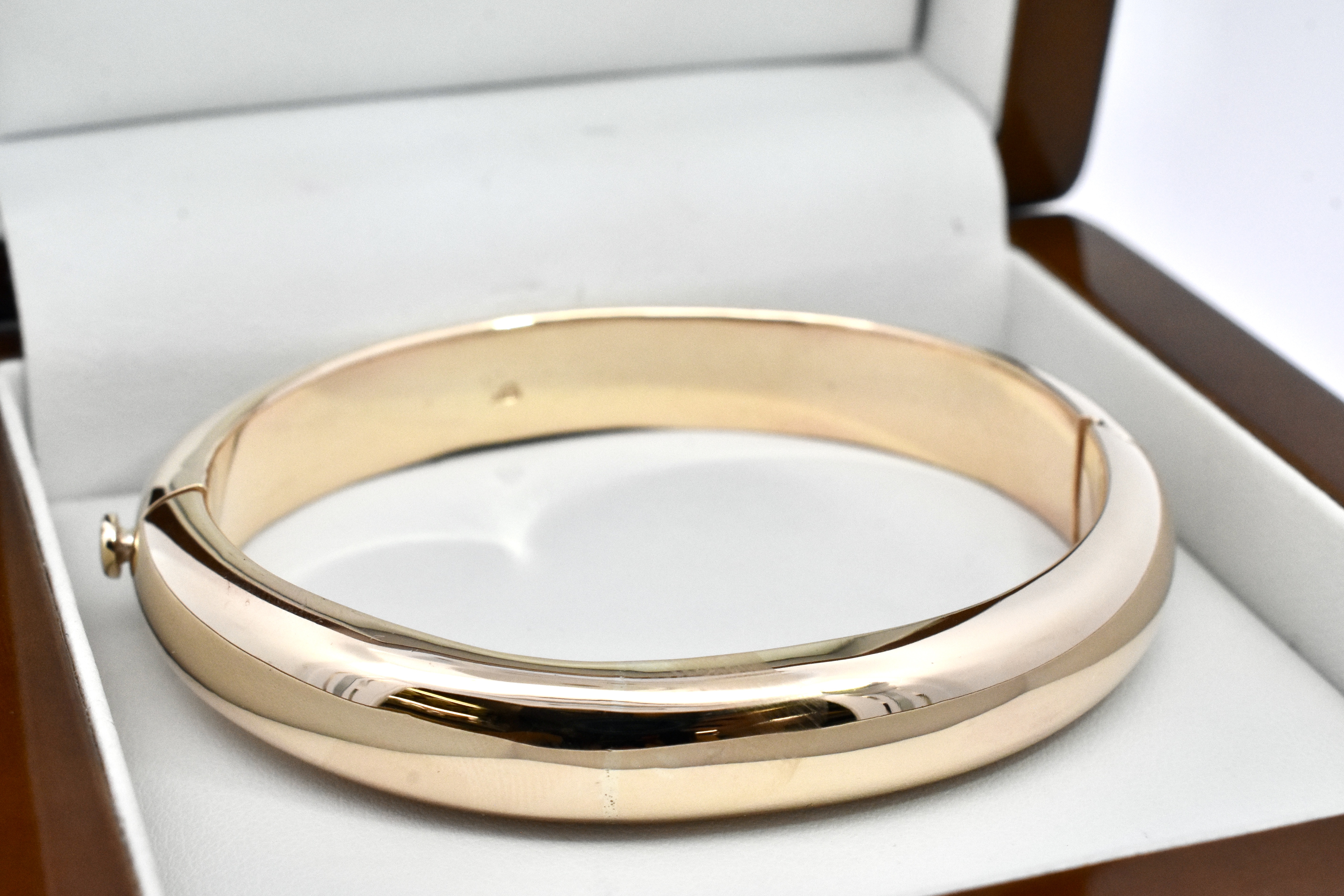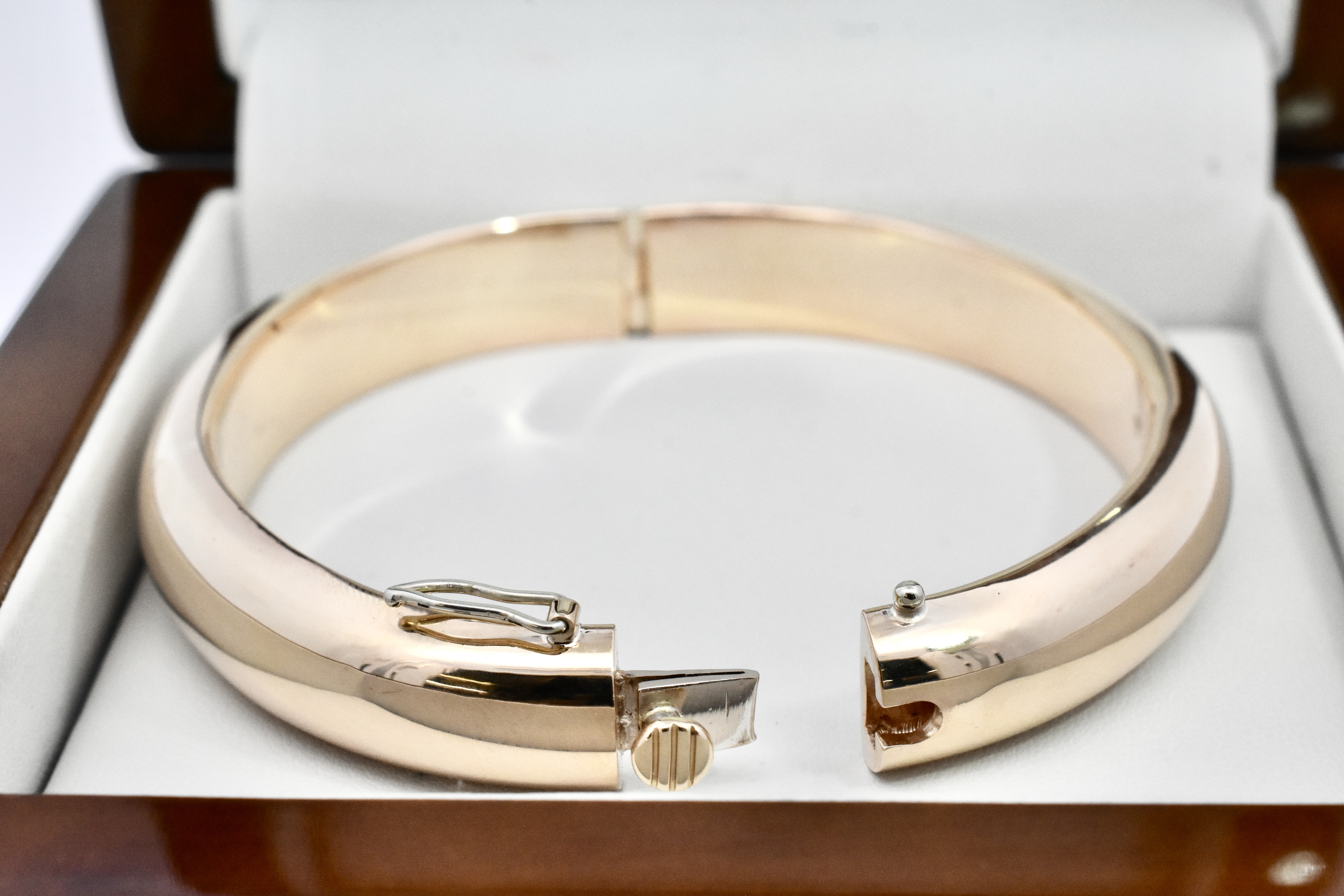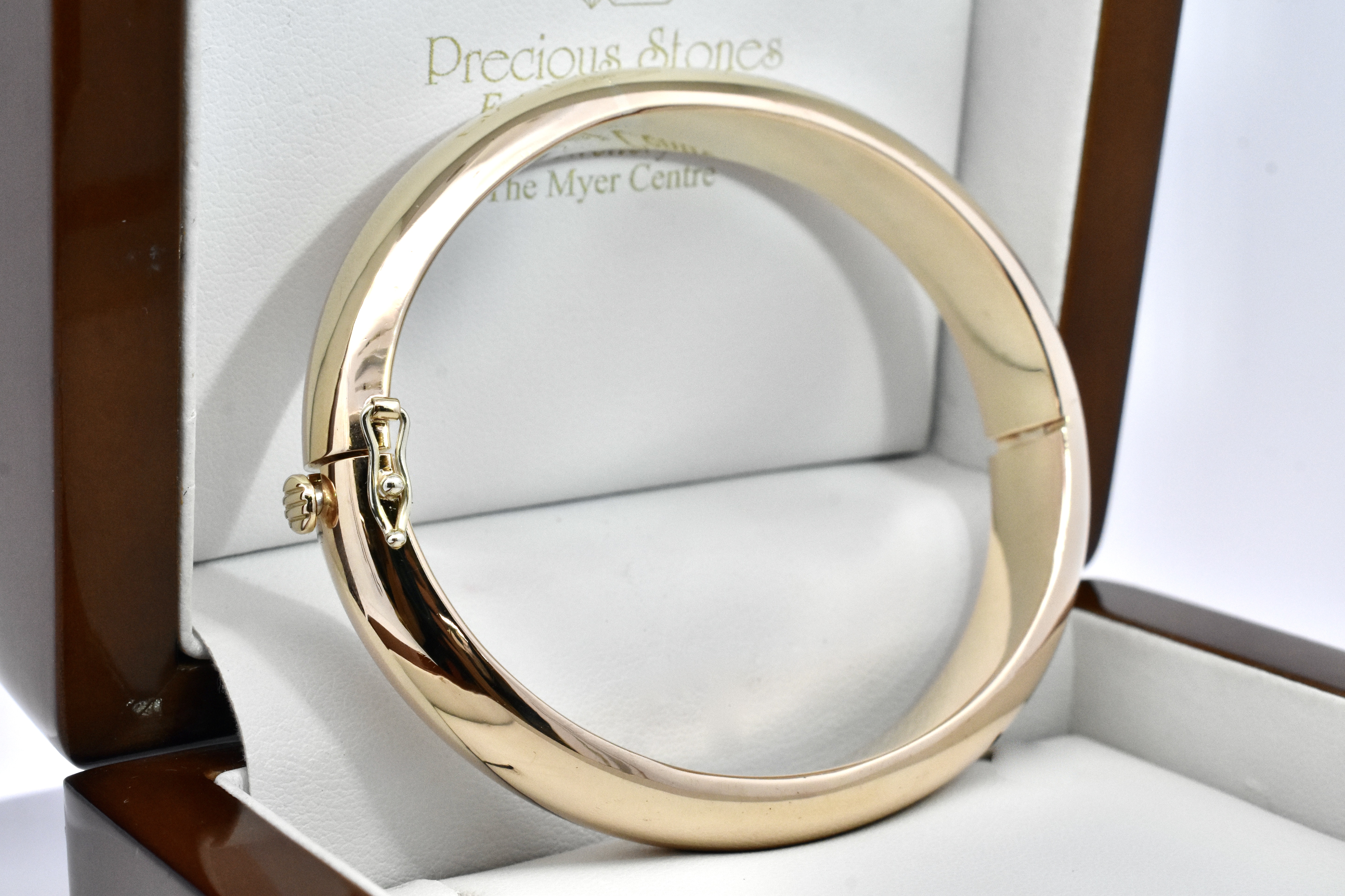 An epic, solid, 90.10gram 9ct yellow gold bangle handmade by our goldsmith, and a hinge handmade by our jeweller to perfectly fit our clients wrist and criteria. Bangle is 10mm wide and 5.9mm deep.