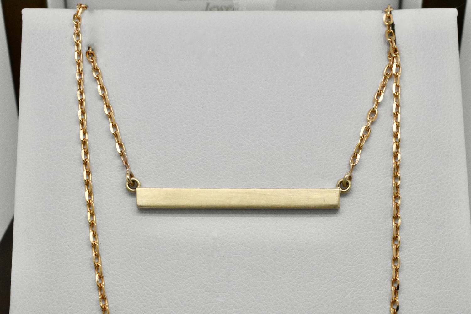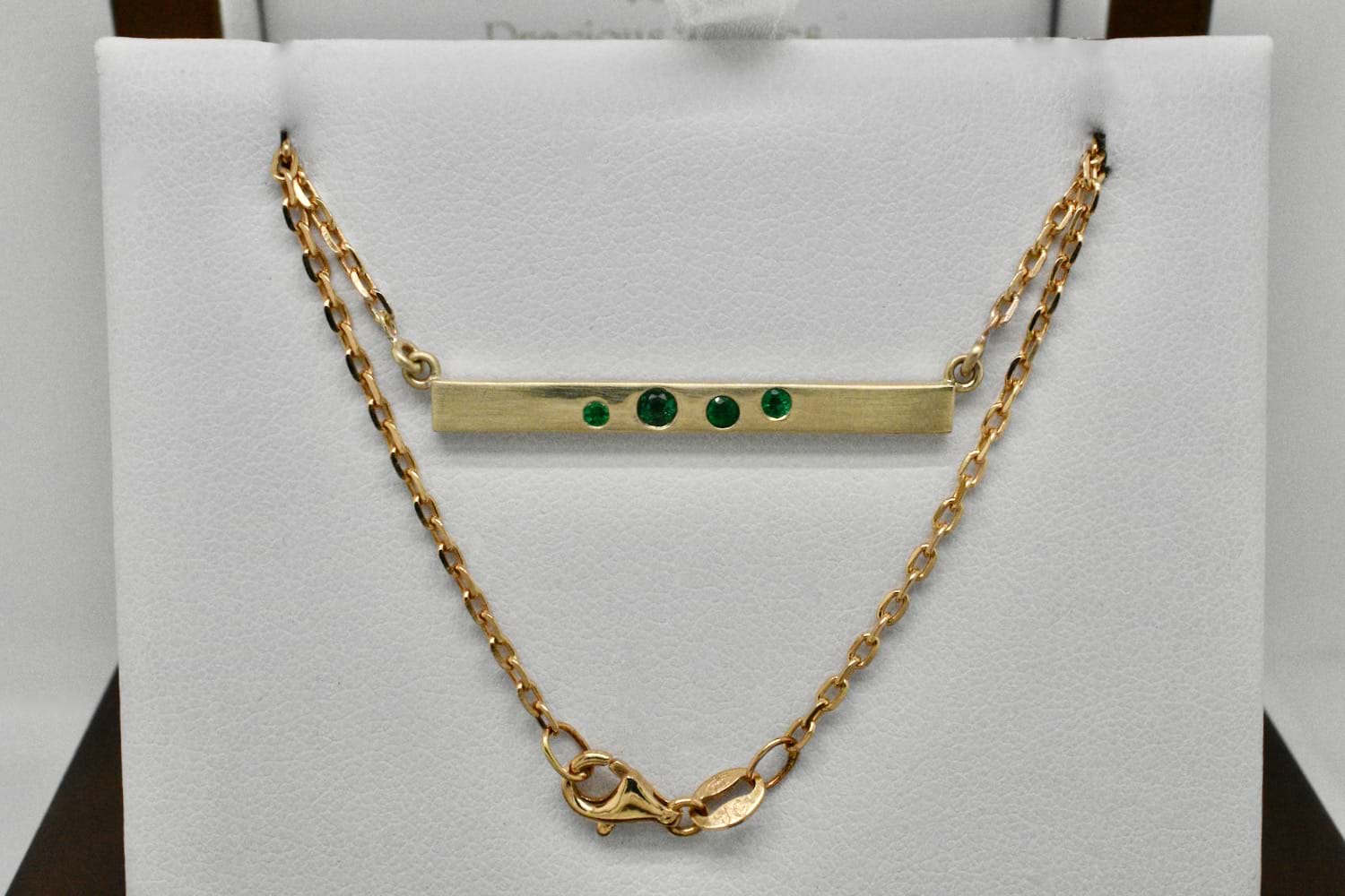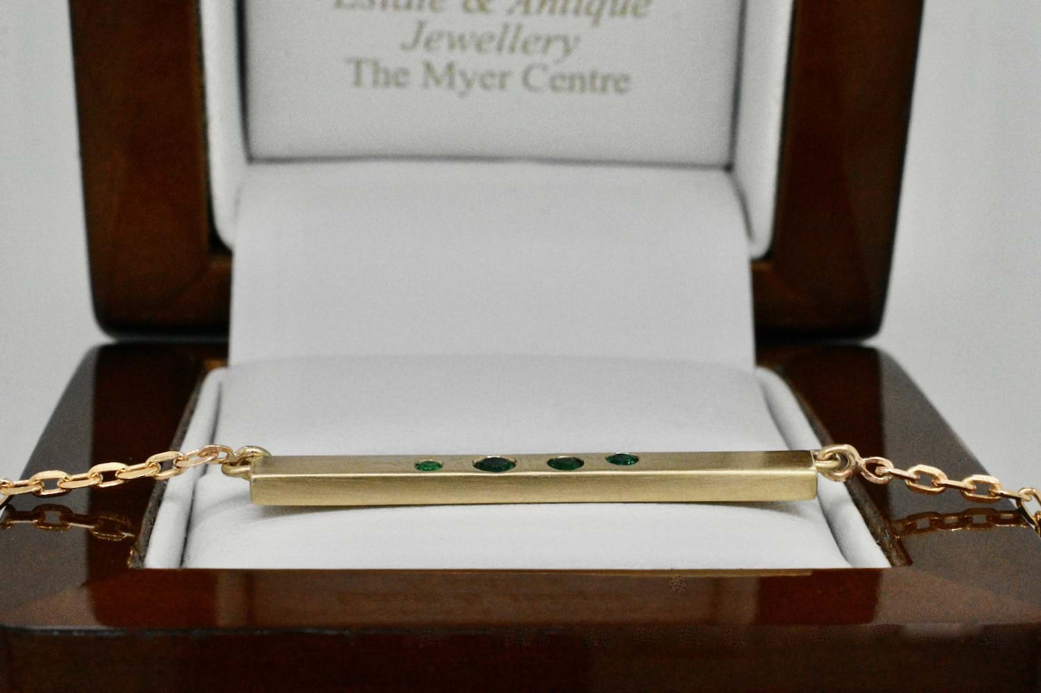 This solid 9ct yellow gold bar has been pressure set with four varying size emeralds and a matte finish. The bar has been attached to a delicate cable link chain measures 45cm.