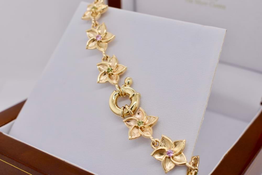 Archived 9ct Yellow Gold Green & Pink Sapphire Frangipani Bracelet