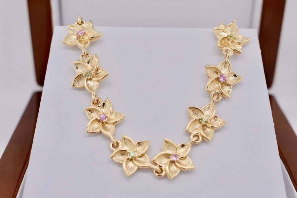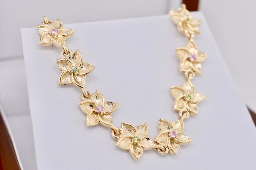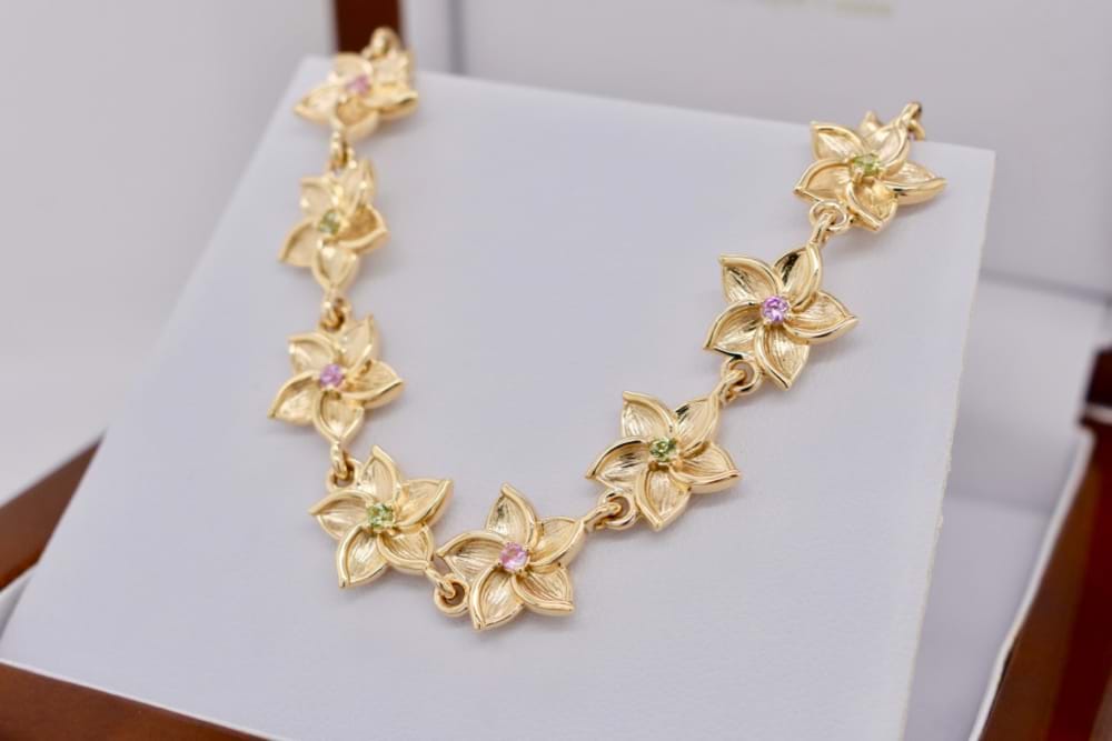 A beautiful and unique design brought to us by our client to create a feminine and pretty gold bracelet that embodied the beauty of frangipanis. Crafted in solid 9ct yellow gold each individual frangipani flower link has an alternating green or pink sapphire claw set in the center and the bracelet has a bolt ring clasp end. Seven green sapphires total 0.30cts and six pink sapphires total 0.25cts. Independent Valuation Supplied. If you are inspired by this archived design contact us today to discuss how we can create something incredible for you or your loved one.