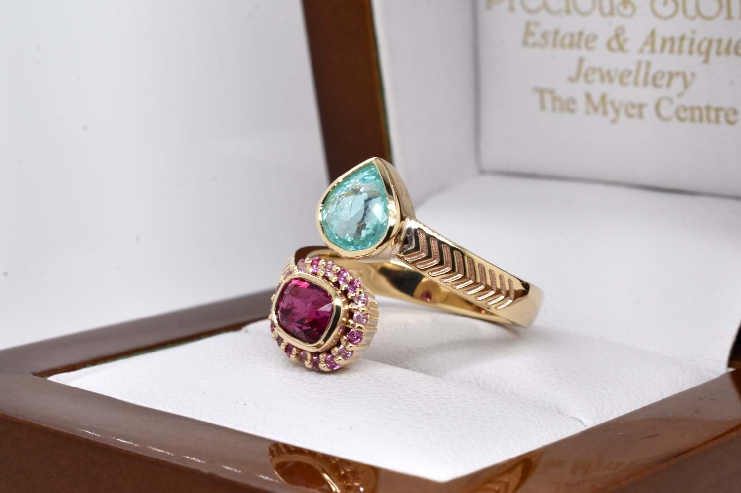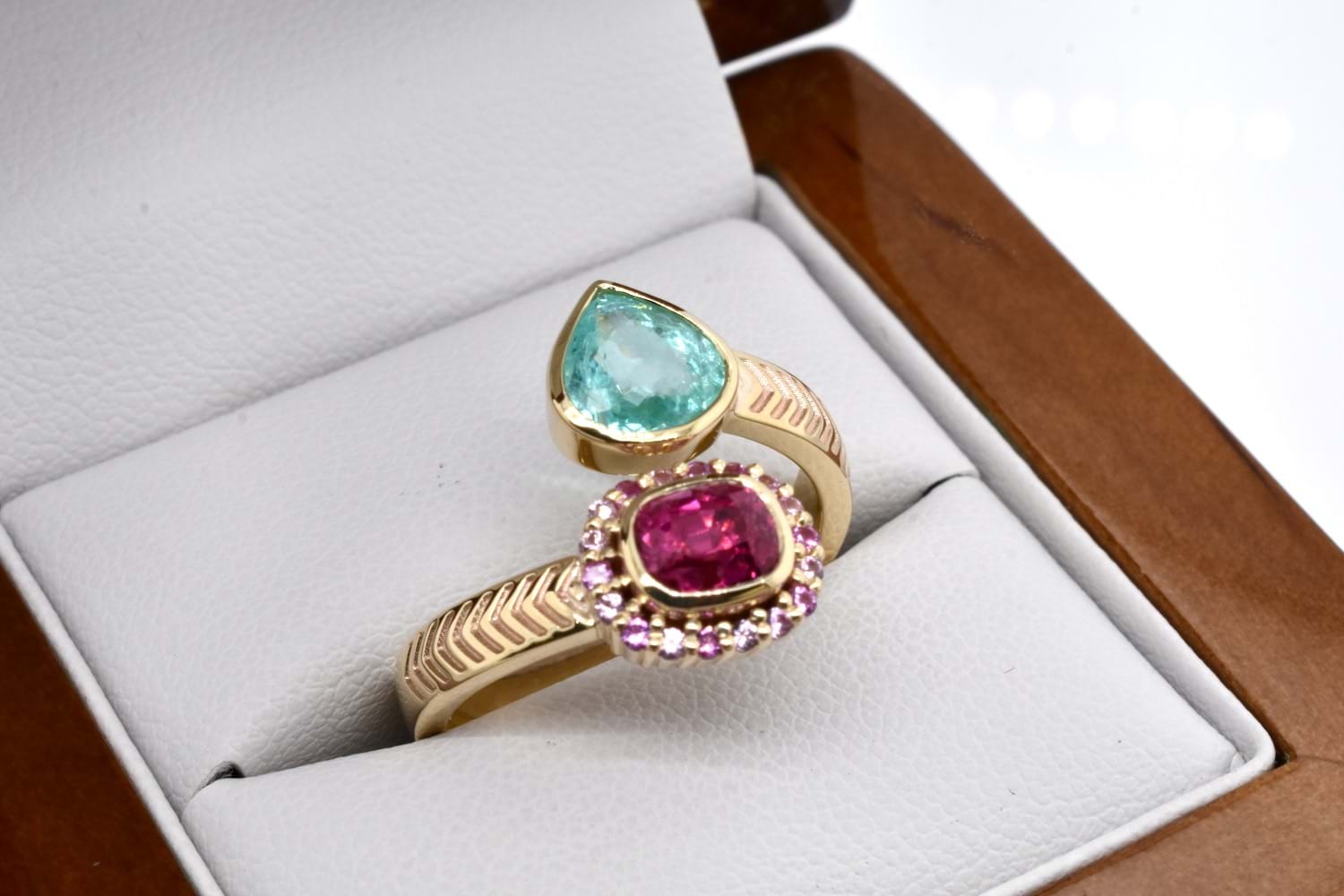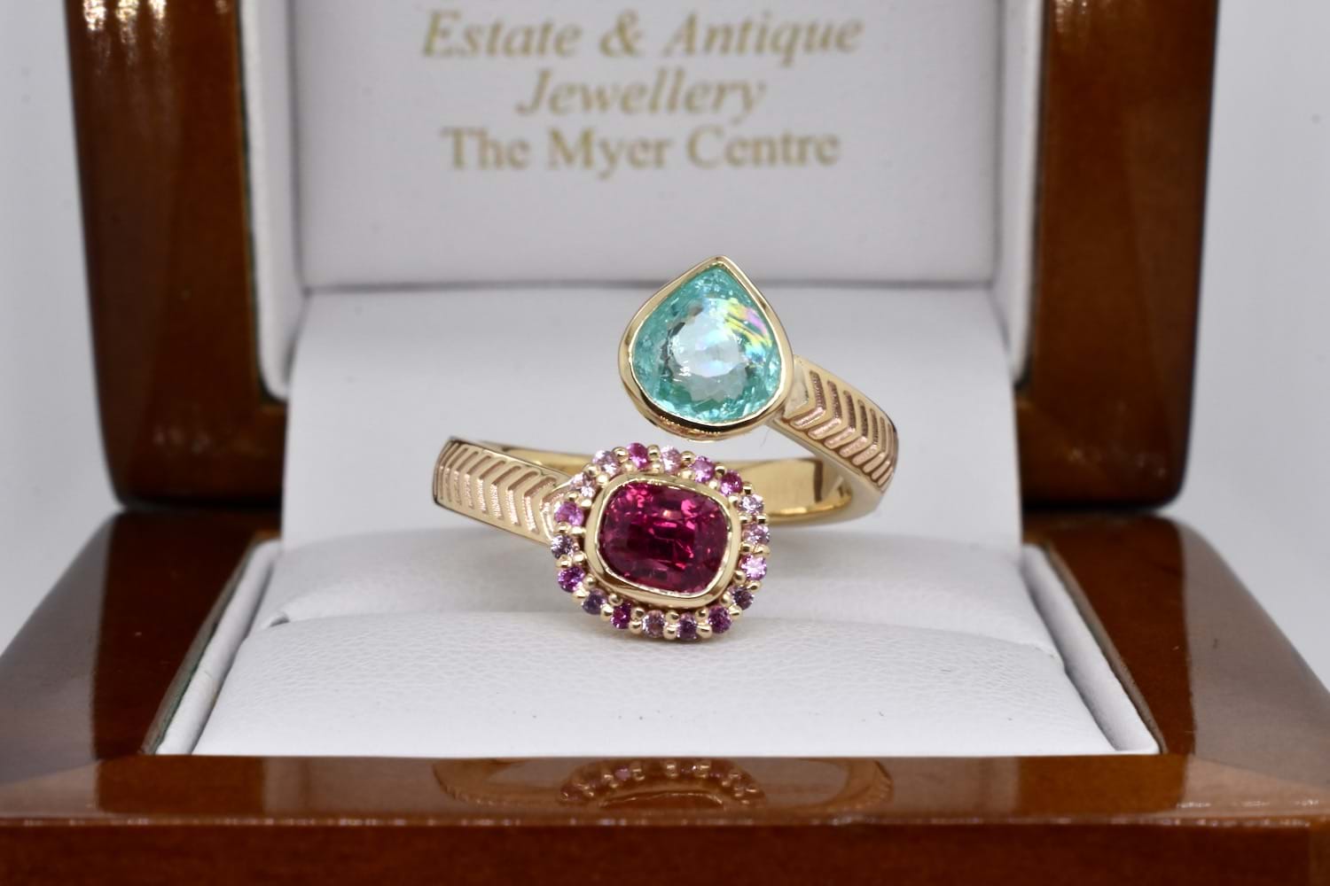 A stunning combination of complementary colours, this client's stones have been designed into a toi-et-moi ring reminiscent of vibrant Egyptian style, crafted in 9ct yellow gold and set with a bezel set pear shape paraiba tourmaline and cushion cut hot pink spinel, set with an outer ring of smaller, round pink sapphires, with a beautiful twisted band and chevron engraved shoulder detail. Independent Valuation Supplied