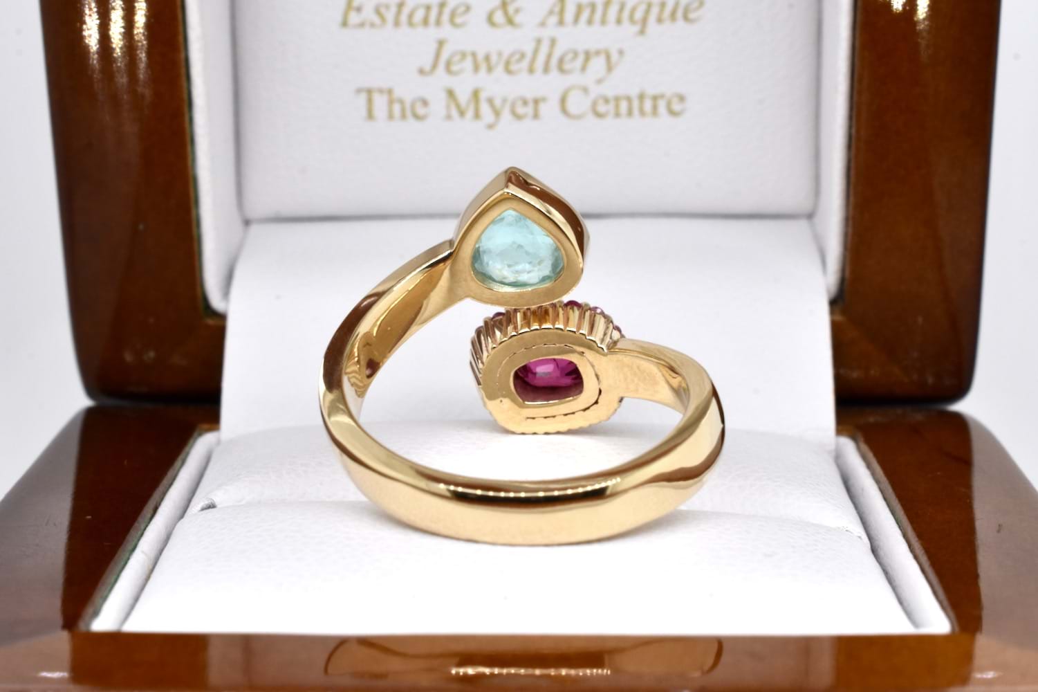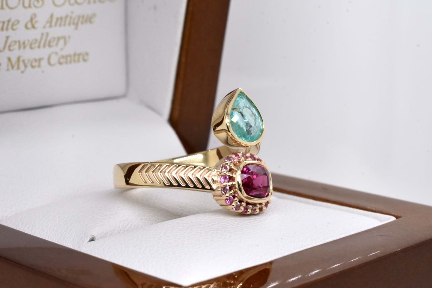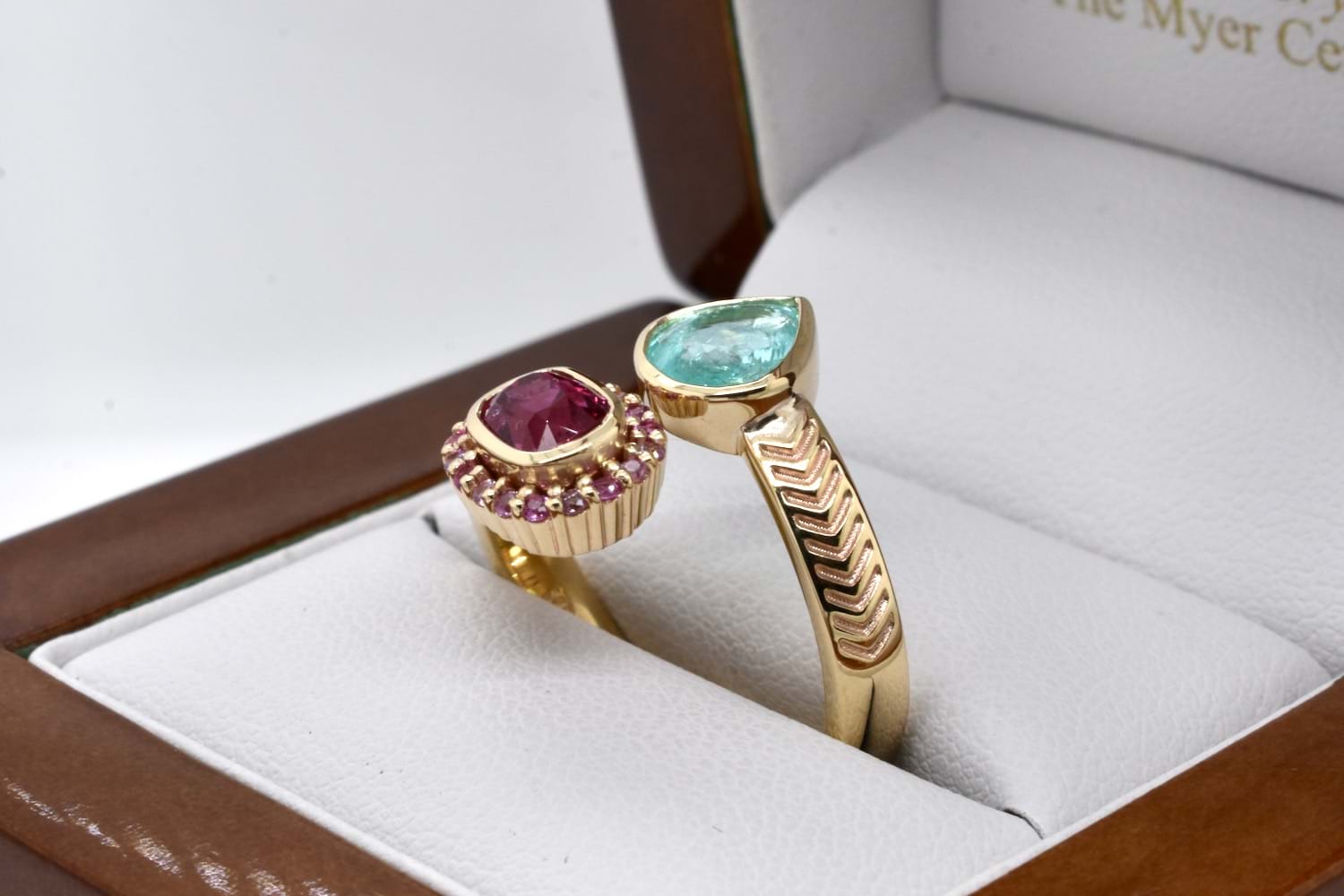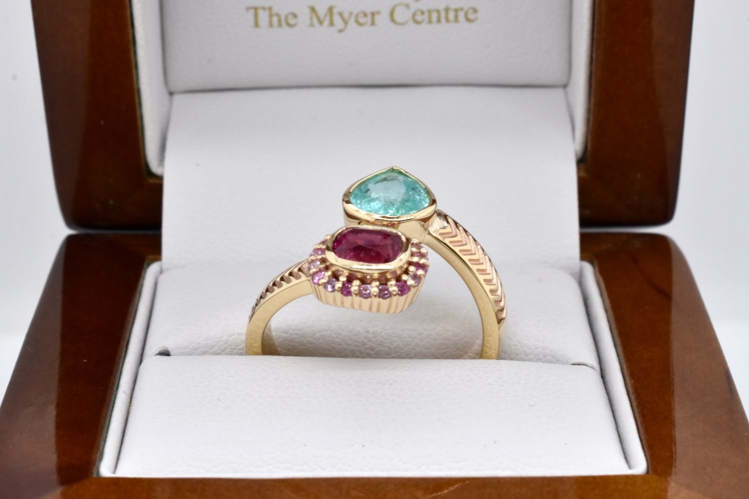 A stunning combination of complementary colours, this client's stones have been designed into a toi-et-moi ring reminiscent of vibrant Egyptian style, crafted in 9ct yellow gold and set with a bezel set pear shape paraiba tourmaline and cushion cut hot pink spinel, set with an outer ring of smaller, round pink sapphires, with a beautiful twisted band and chevron engraved shoulder detail. Independent Valuation Supplied