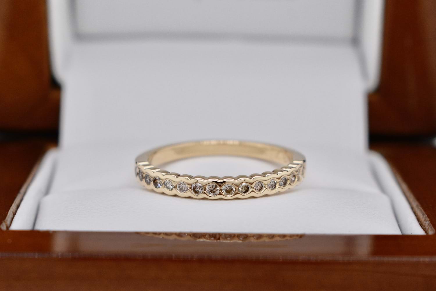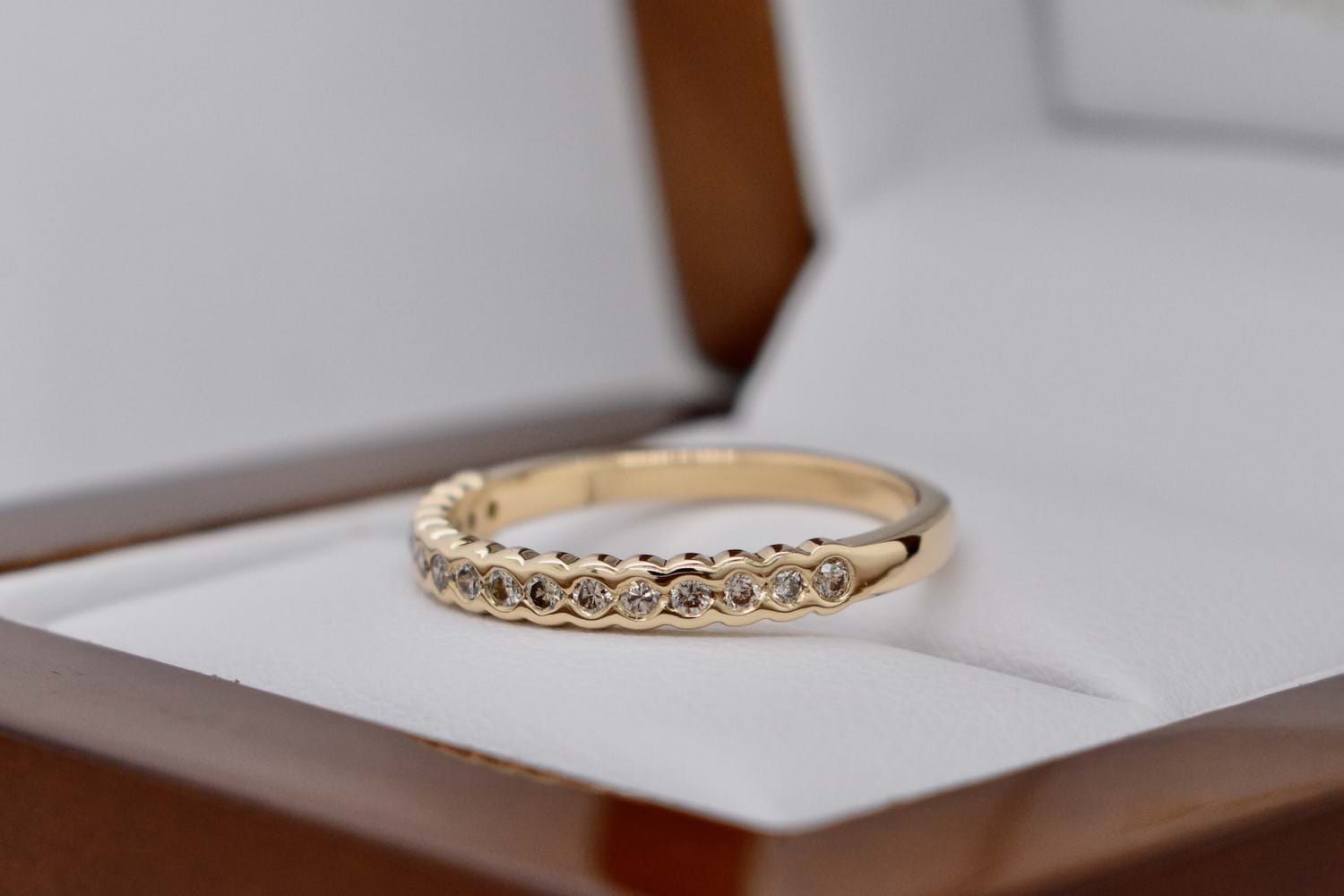 This 9ct yellow gold band was made using sentimental diamonds supplied by our client, she chose this simple and pretty semi-bezel set design to suit her other rings. Independent Valuation Supplied.