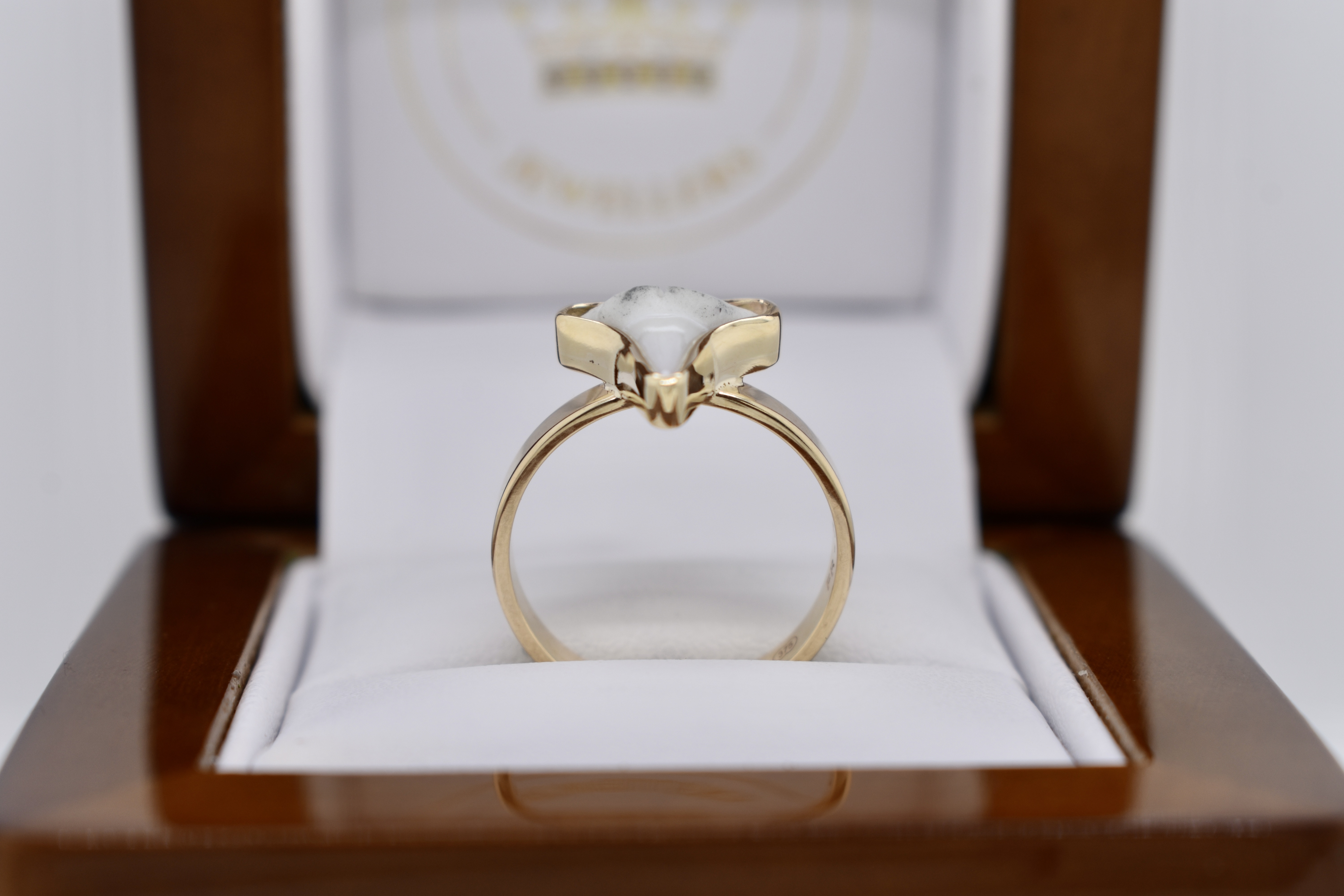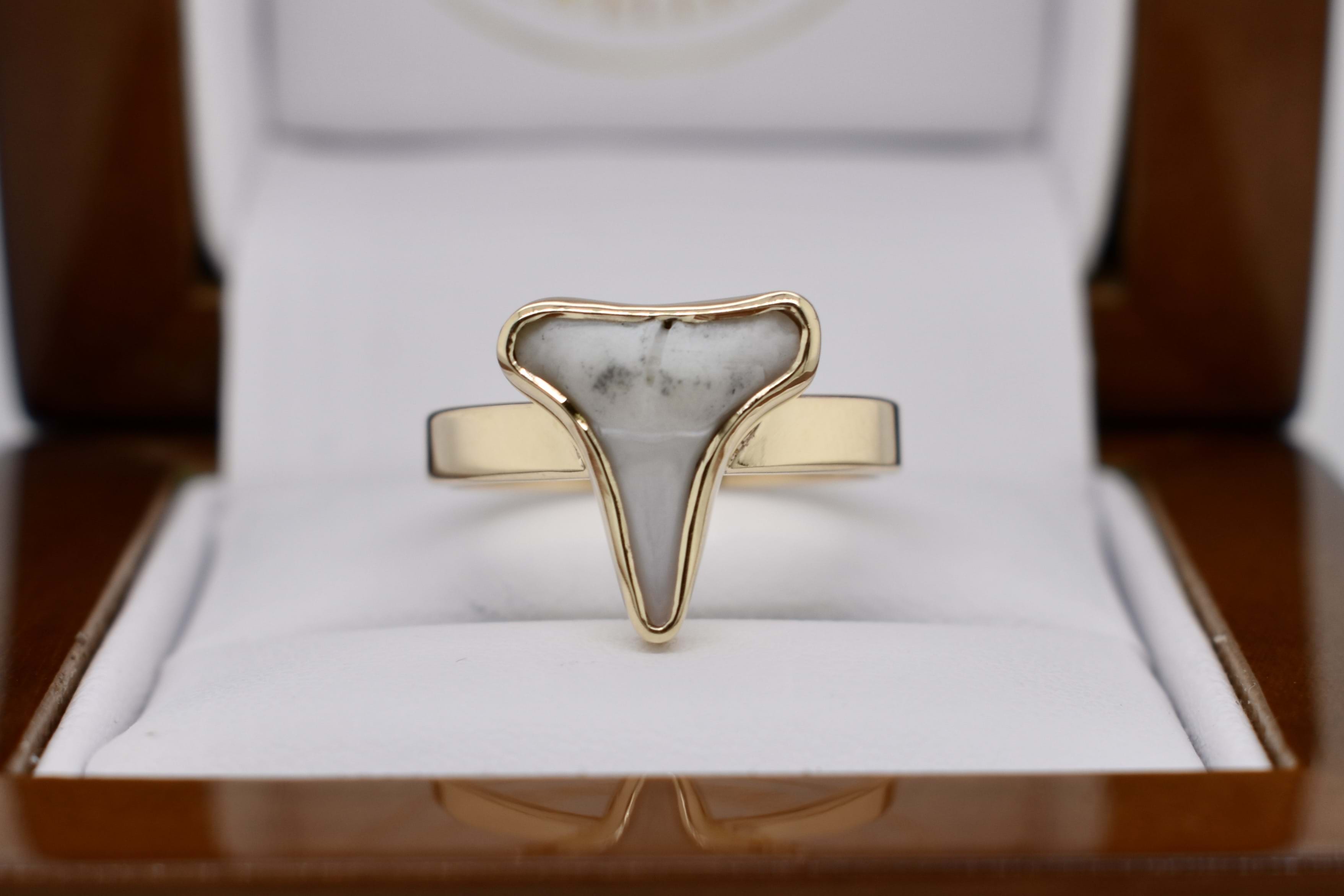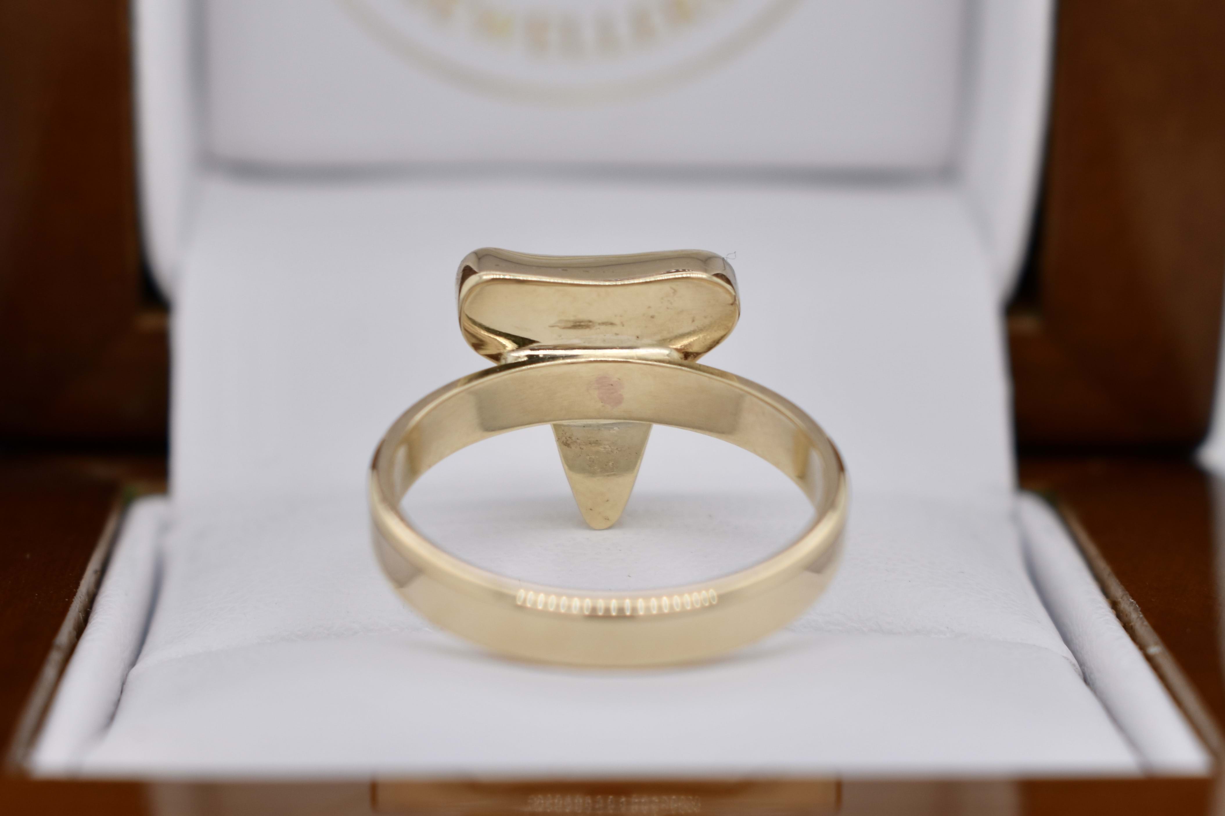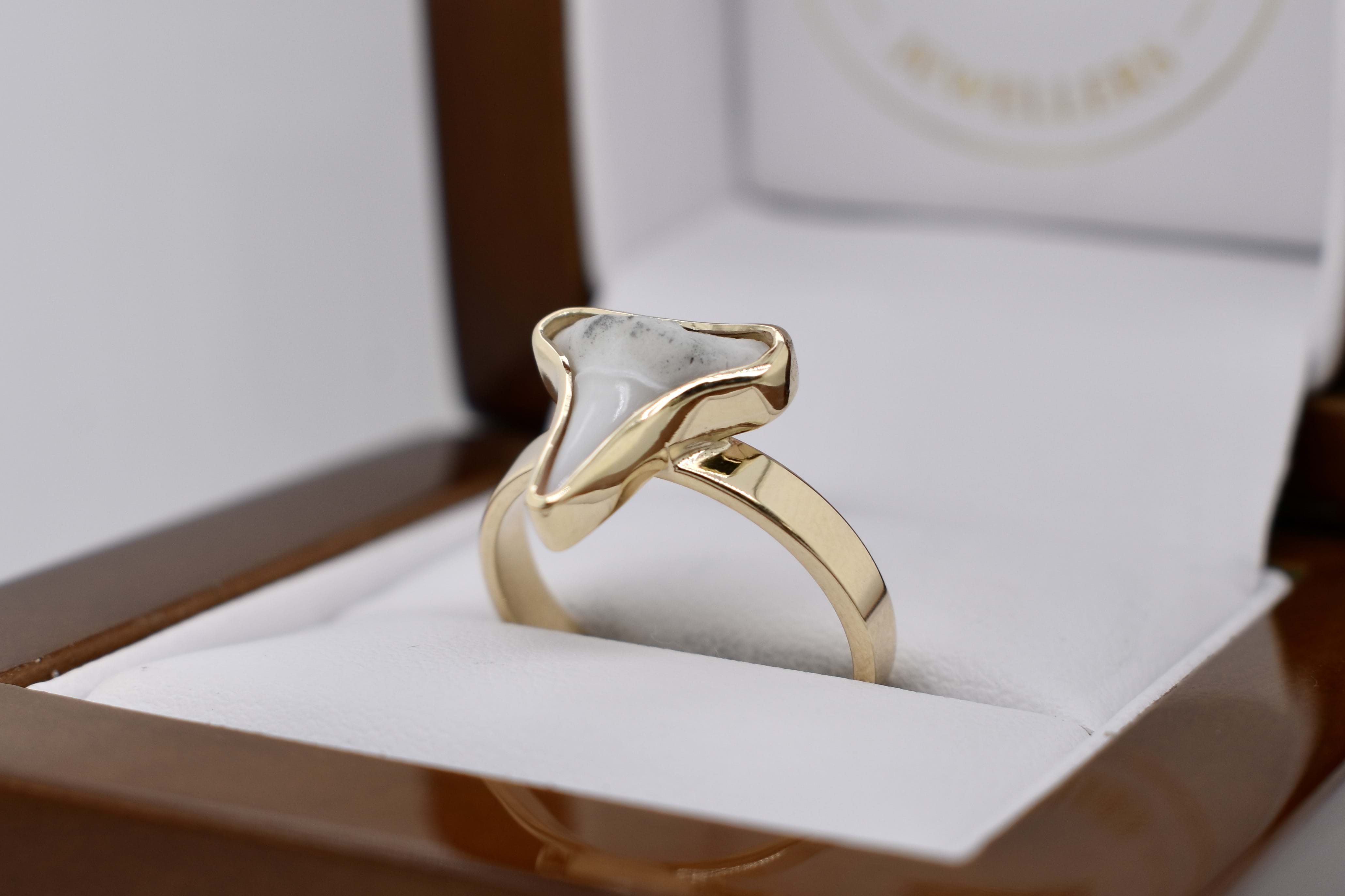 A very unusual and cool ring crafted for our client who had a shark tooth to showcase! Crafted in 9ct yellow gold, this freeform ring was custom made to encase the tooth with a plain band.