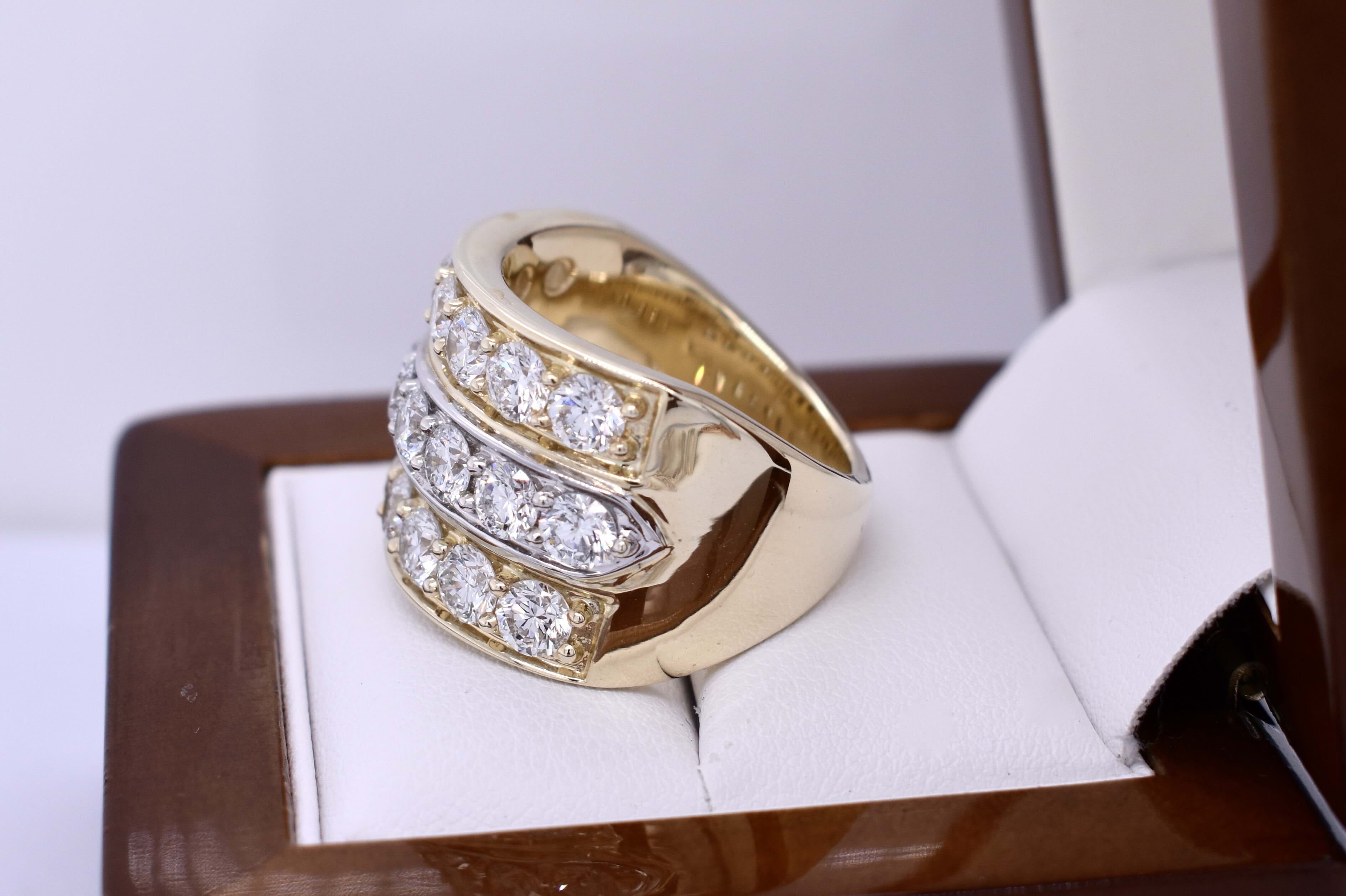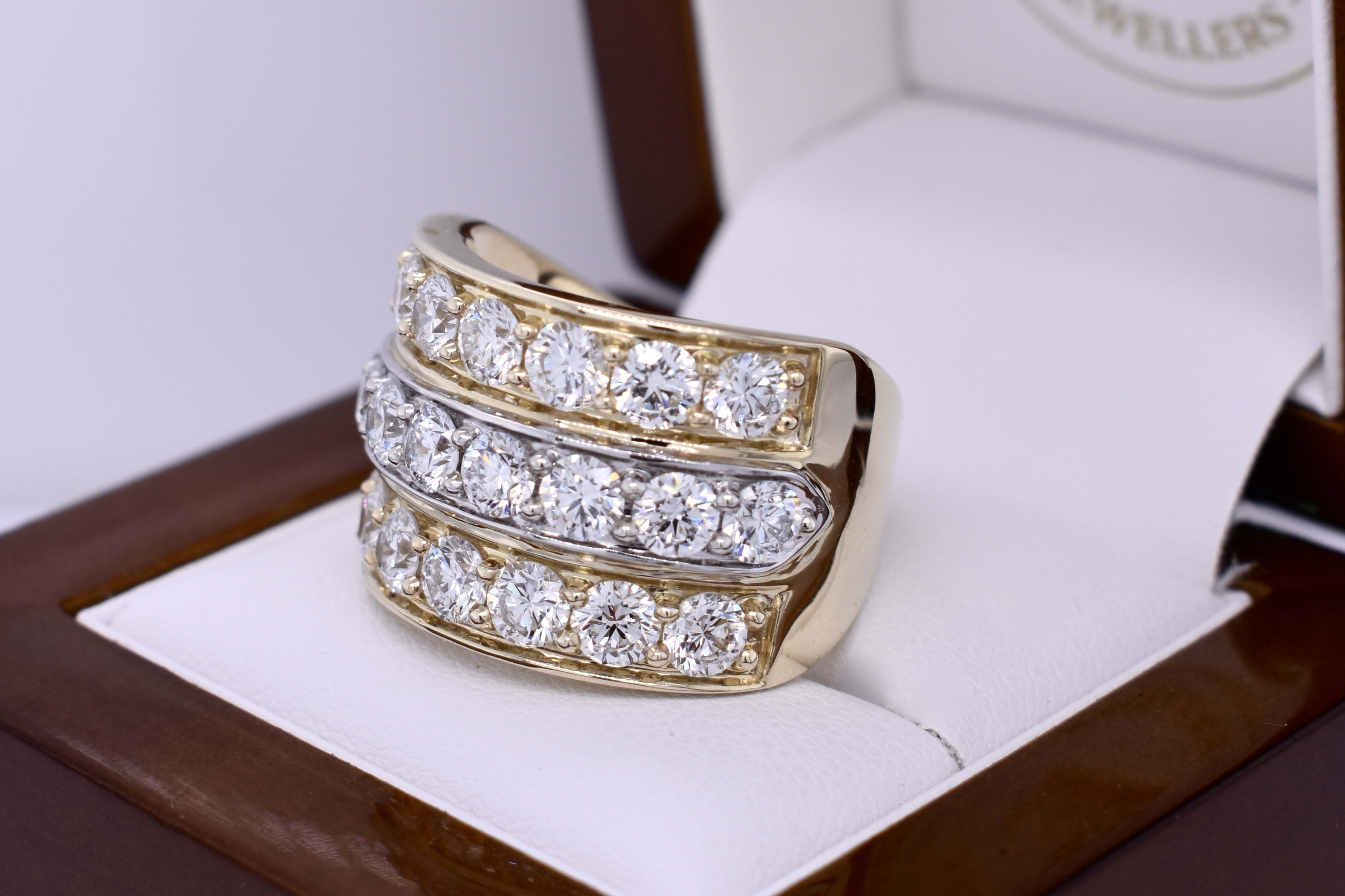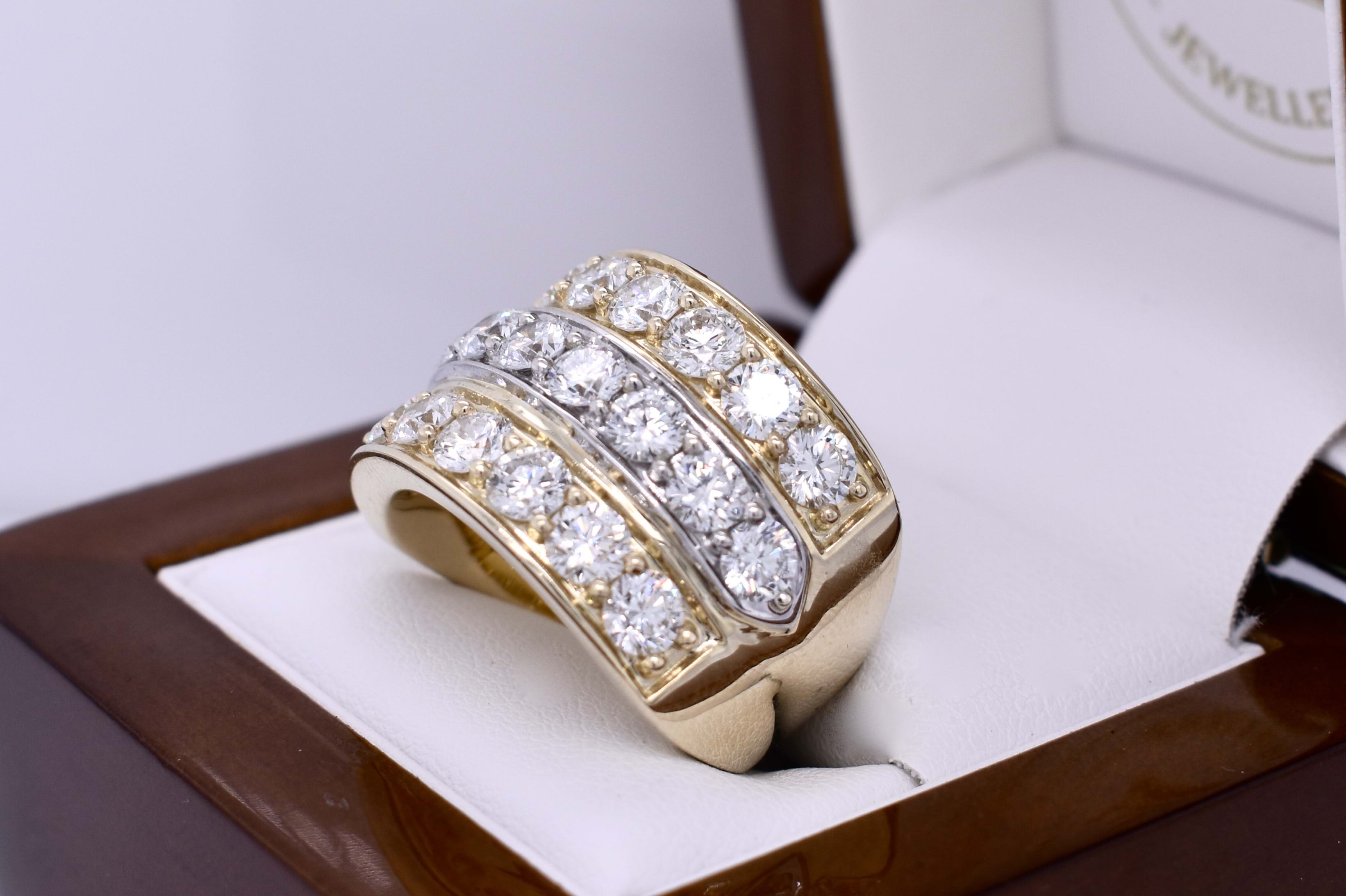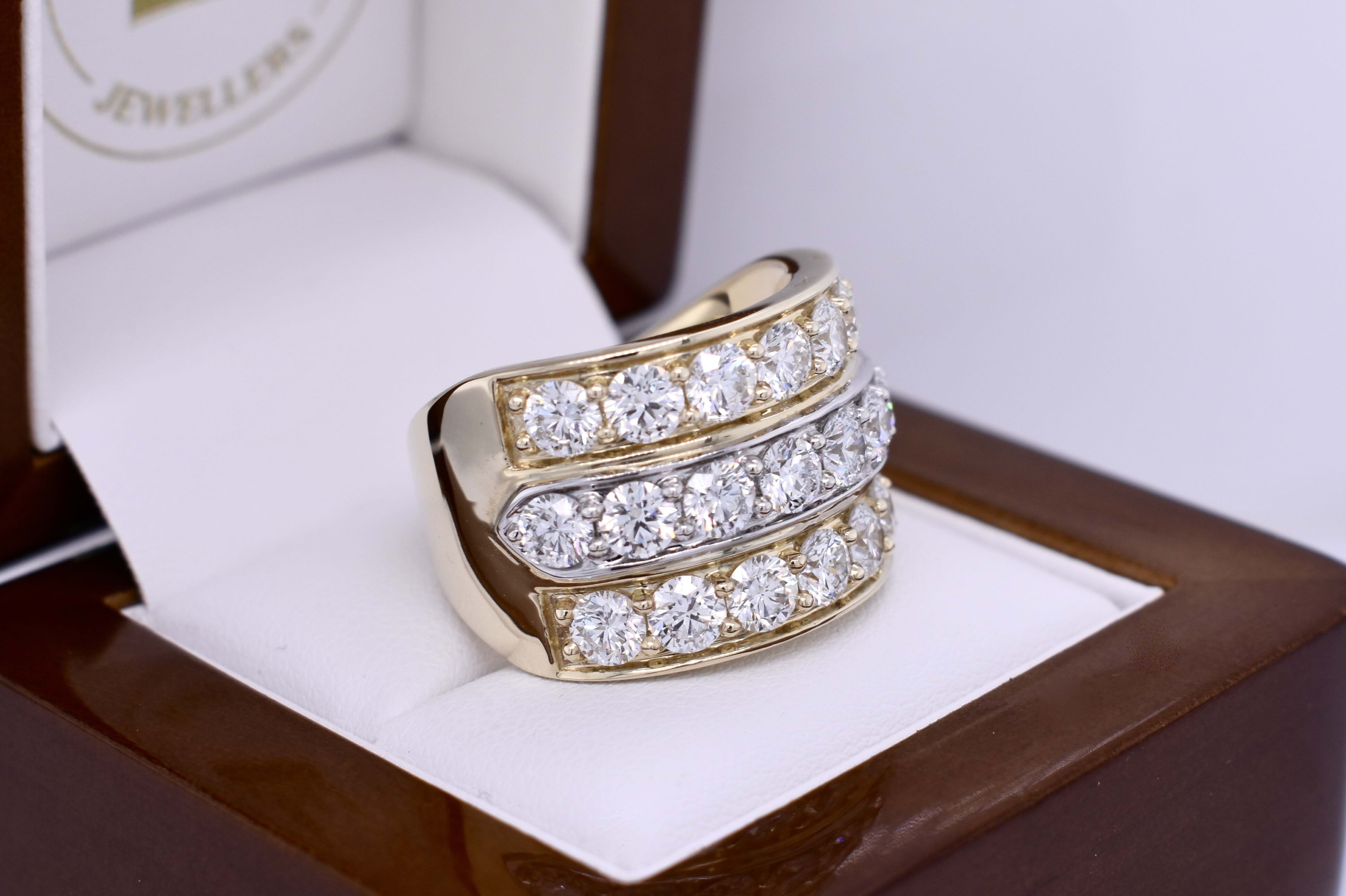 This epic showstopper was crafted reusing diamonds from a previous creation, and has been crafted in two tone 9ct yellow and white gold and is an impressive 17mm wide. The top and bottom row has seven round brilliant cuts grain set and the centre row has eight round brilliant cuts, with a combined total weight of 5.69cts.