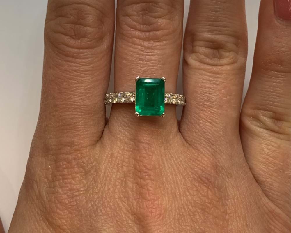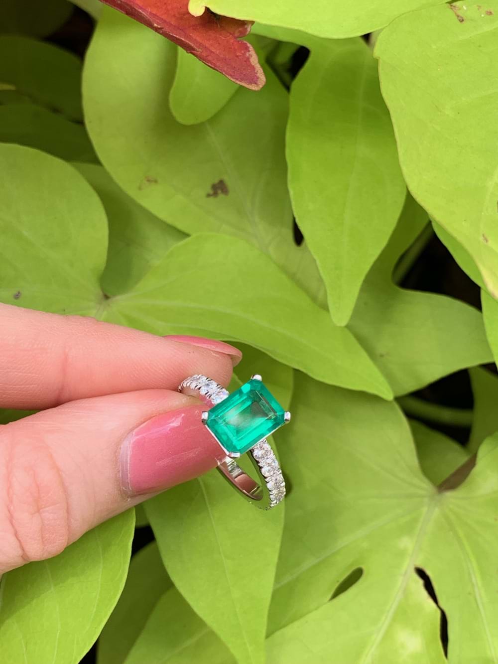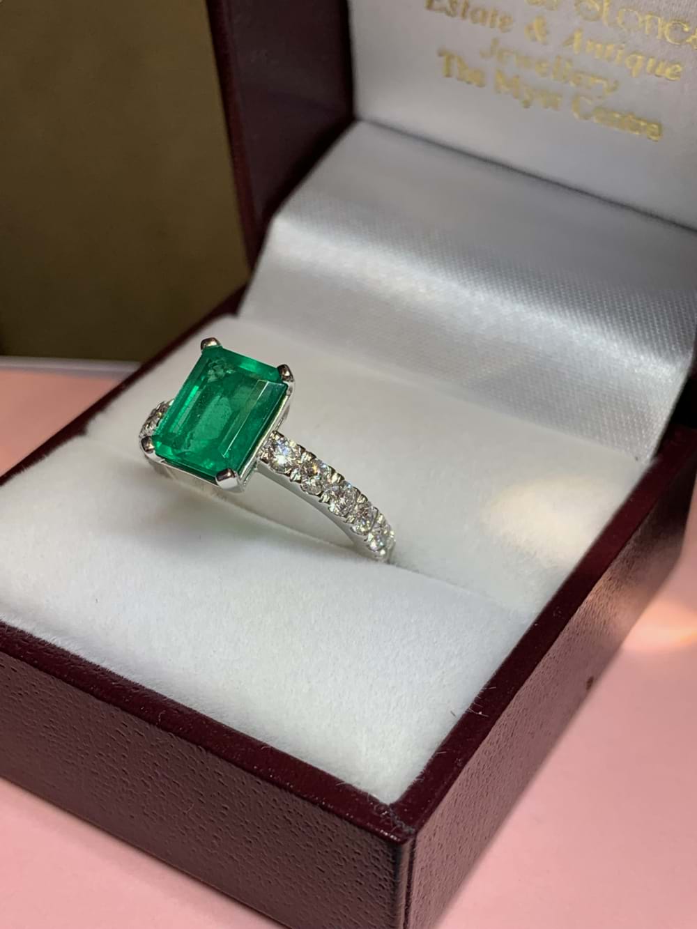 This spectacular natural 1.87ct emerald cut Brazilian emerald was both sourced and hand selected for our client to be the focus of this simple and elegant dress ring. Expertly crafted in our workshop in 18ct white gold, the emerald is set with four tapered tallon claws and has eight scintilating round brilliant cut diamonds cut down claw set down each shoulder. With a total of 16 diamonds totalling 0.96cts they provide the perfect crisp white contrast to the rich green emerald colour. Independent Valuation Supplied. If you are inspired by this archived design contact us today to discuss how we can create something incredible for you or your loved one.
