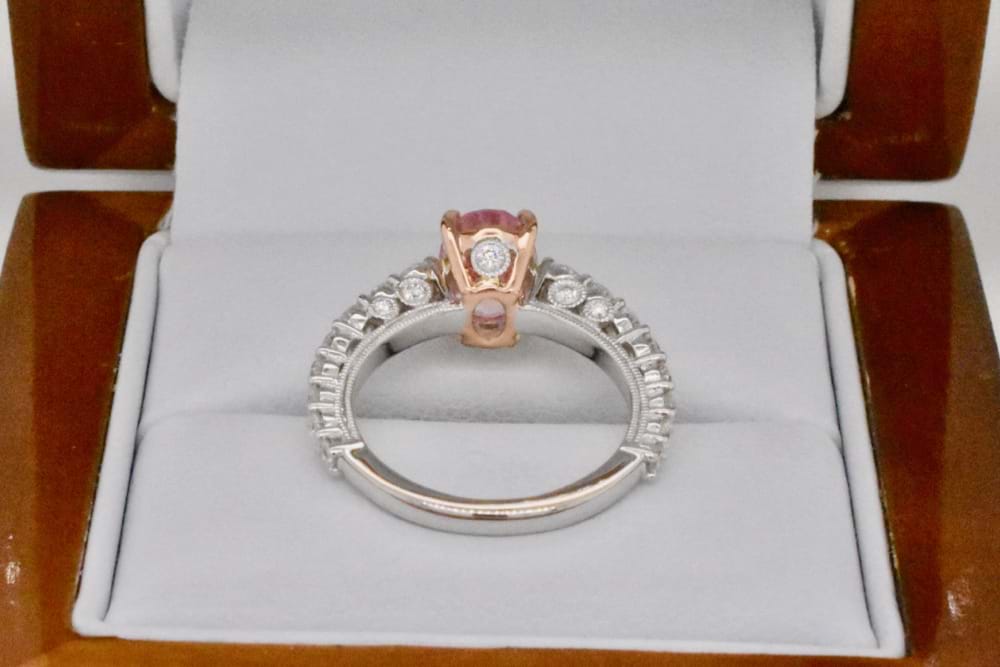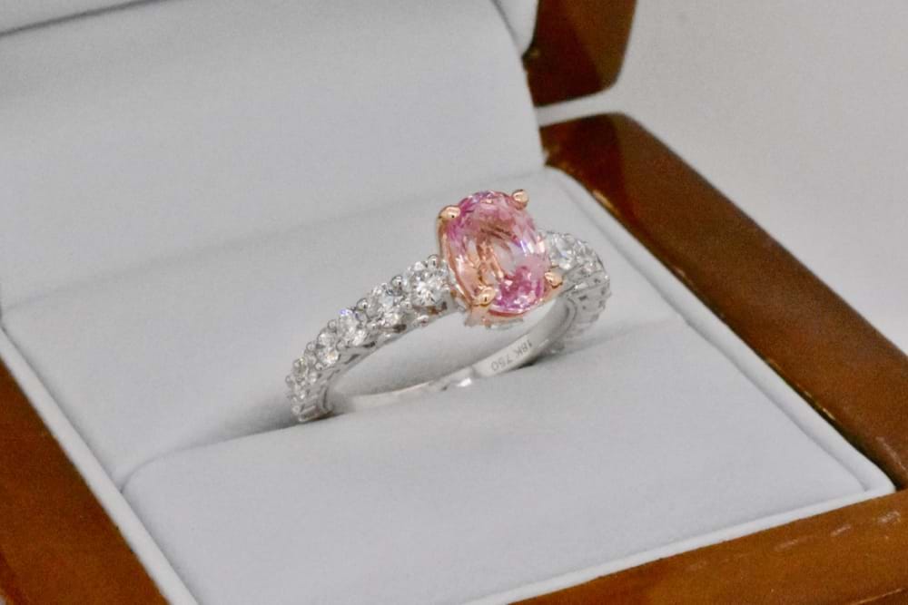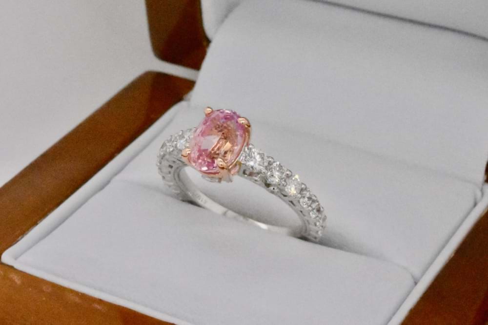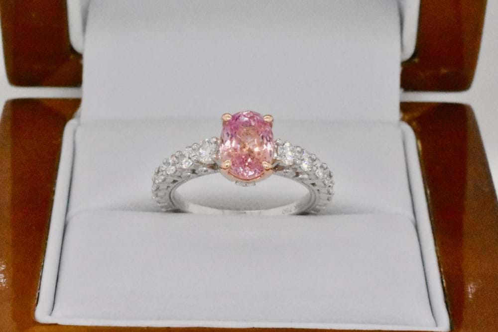 Our client hand chose this beautifully feminine orangey/pink sapphire to be the focus of this stunning, sparkling dress ring. With the sapphire certified unheated and 2.12cts it is perfectly enhanced by the 18ct rose gold setting and the premium quality white diamonds set into white gold down the shoulders. Total diamond content 0.92cts. Independent Valuation Supplied.