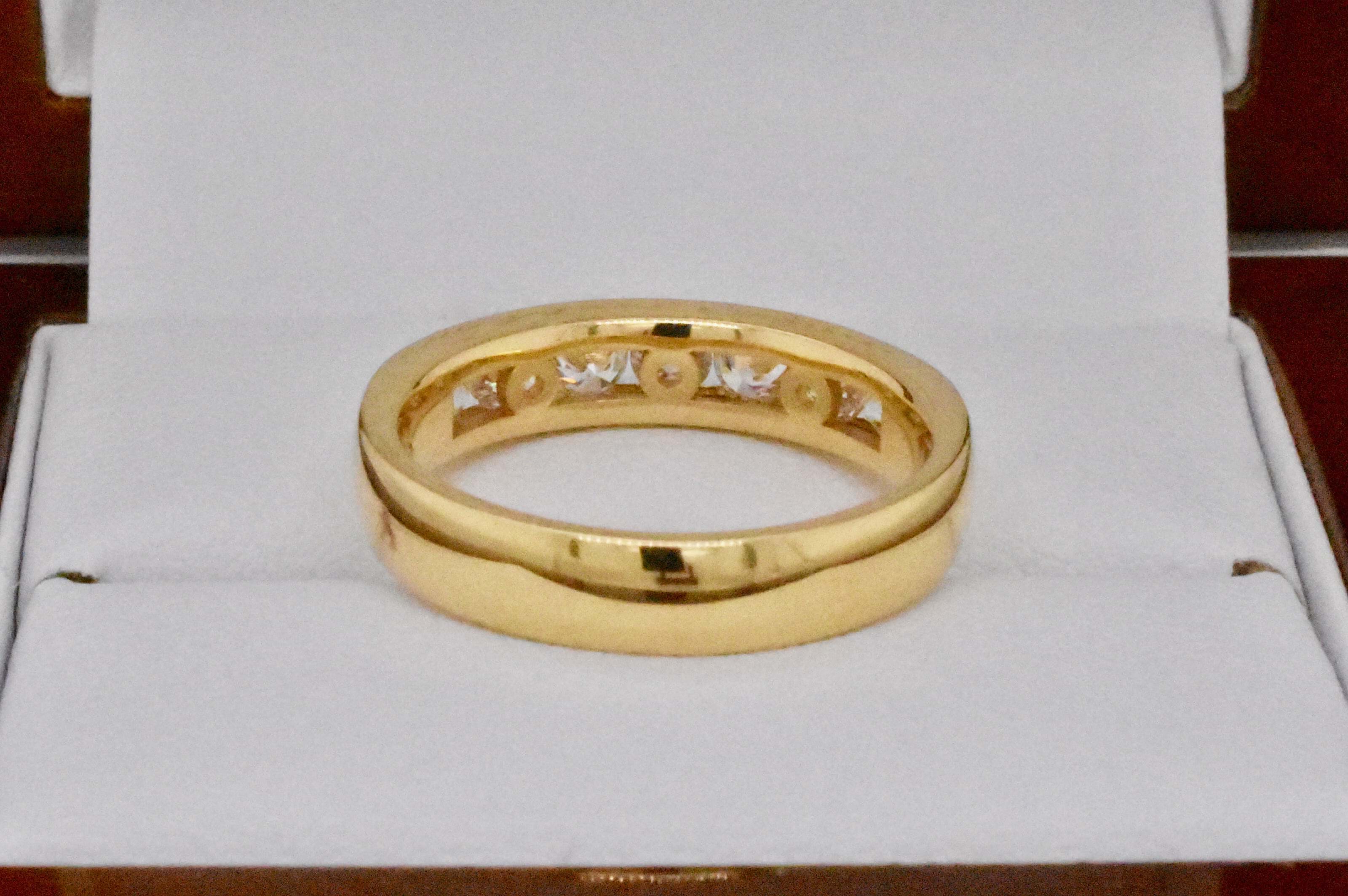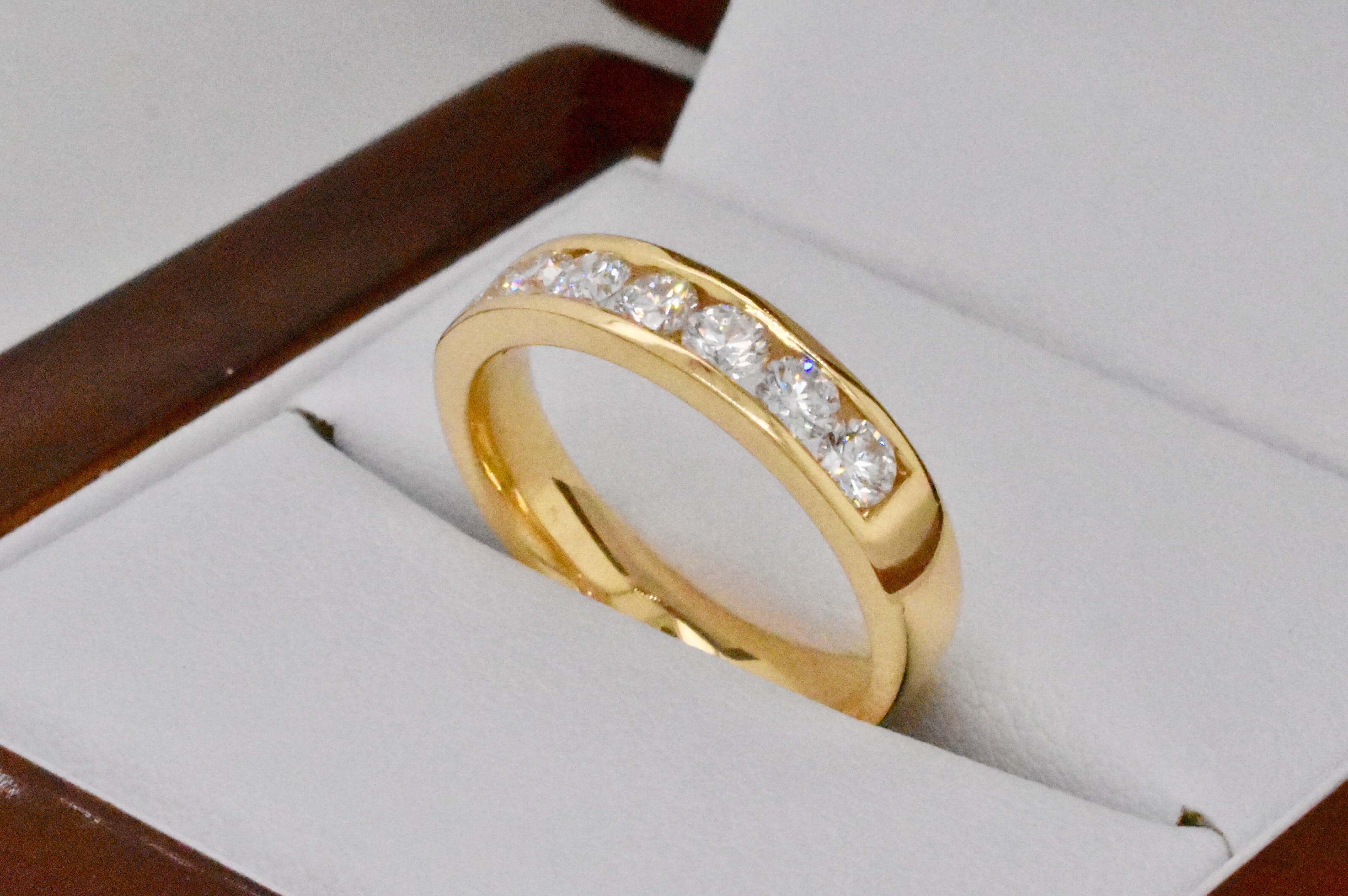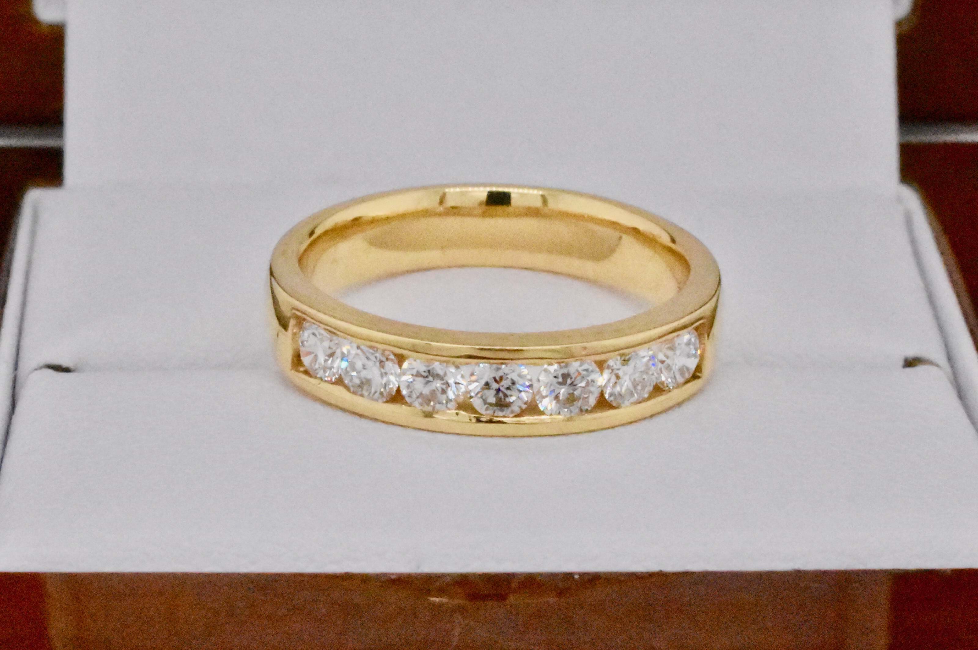 With each diamond carefully hand selected for matching size, quality and scintilation this expertly crafted 18ct yellow gold channel set band contains seven round brilliant cut diamonds totalling 0.74ct. Independent Valuation Supplied. If you are inspired by this archived design contact us today to discuss how we can create something incredible for you or your loved one.