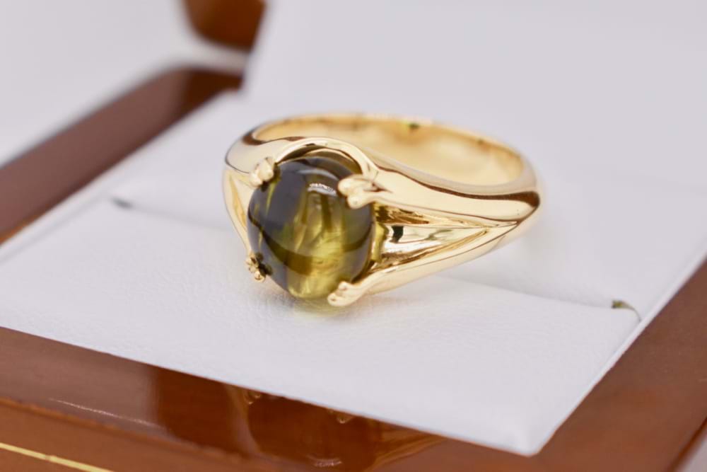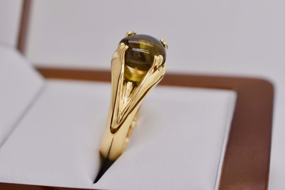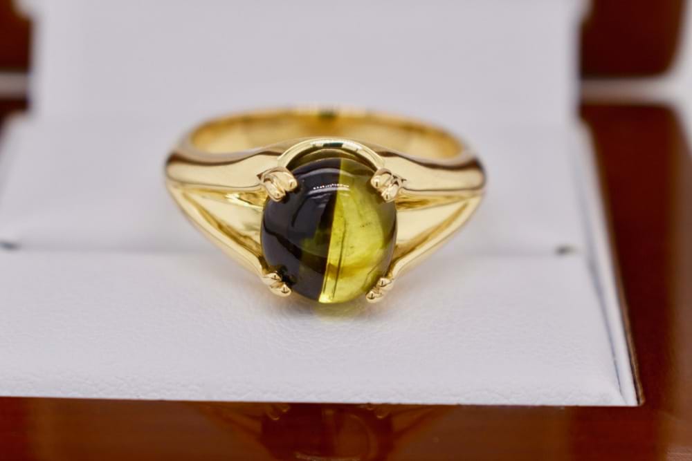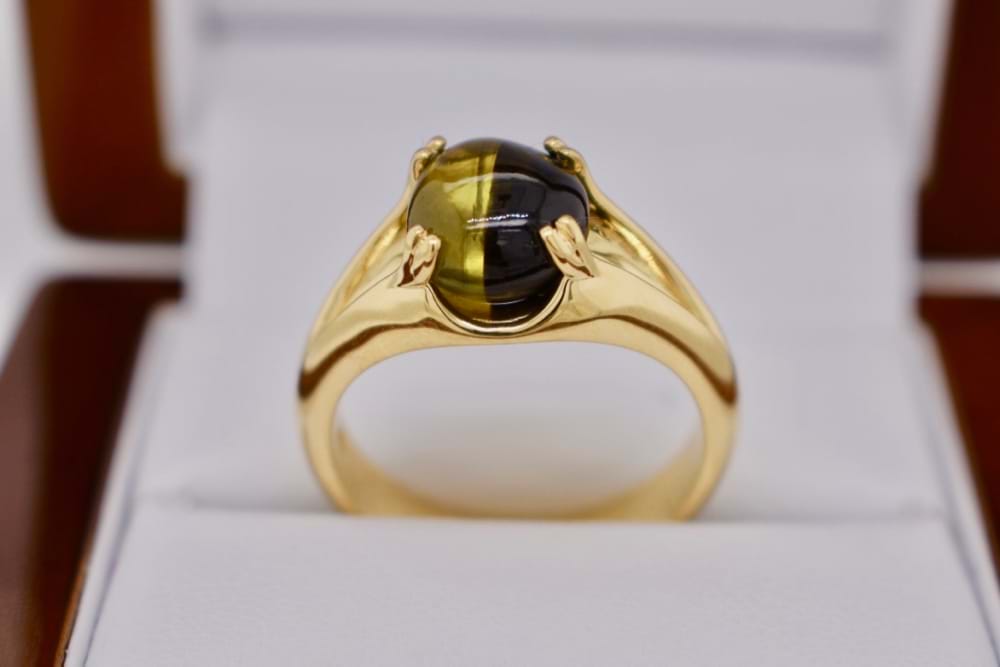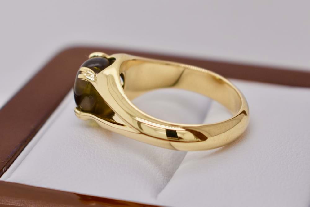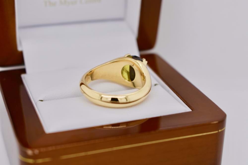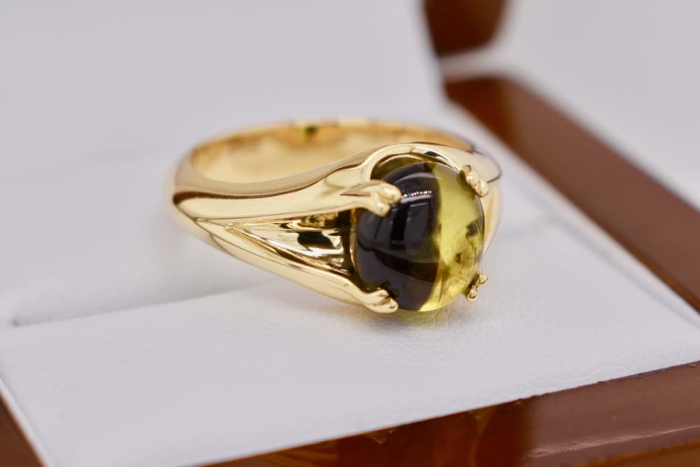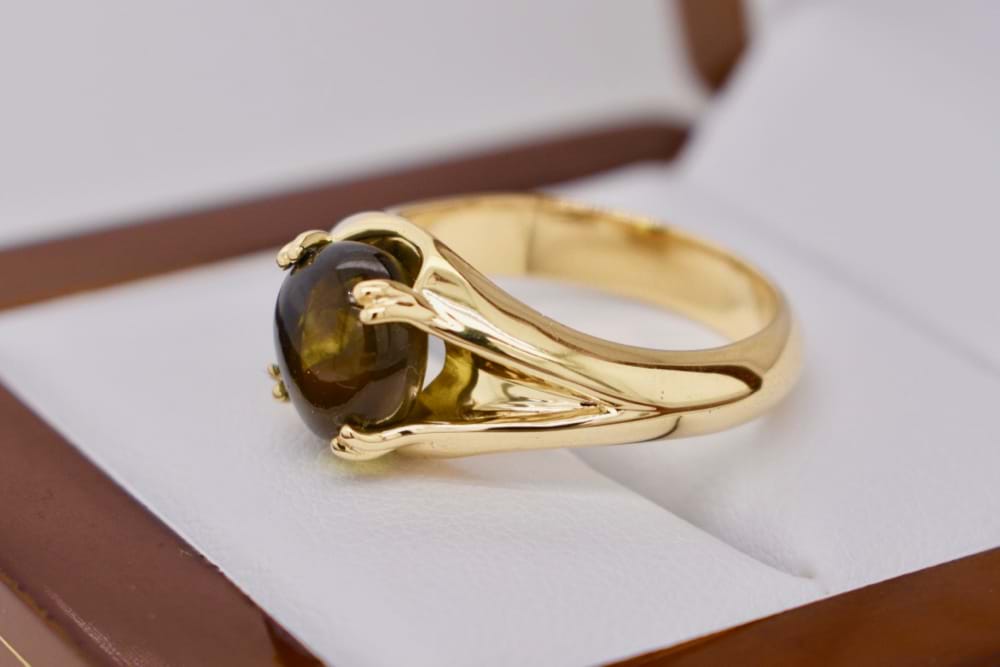 A unique and striking ring design to accompany and compliment a rare and unusual gemstone. This bicolor sapphire originates from Bedford Hill in Australia and displays two distinct colours of yellow and brown which do not blur together. This alone would be a cool and collectable discovery but with the addition of an asterism visible on the side of the cabochon this sapphire truly is a rarity. The sapphire is 5.96cts and has been set into a bespoke designed 18ct yellow gold double talon upswept gypsy ring, allowing the stone to be view from all angles. Independent Valuation Supplied. If you are inspired by this archived design contact us today to discuss how we can create something incredible for you or your loved one.
