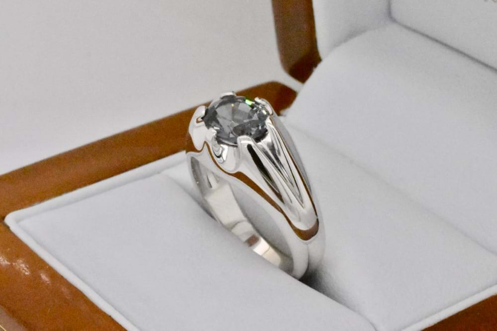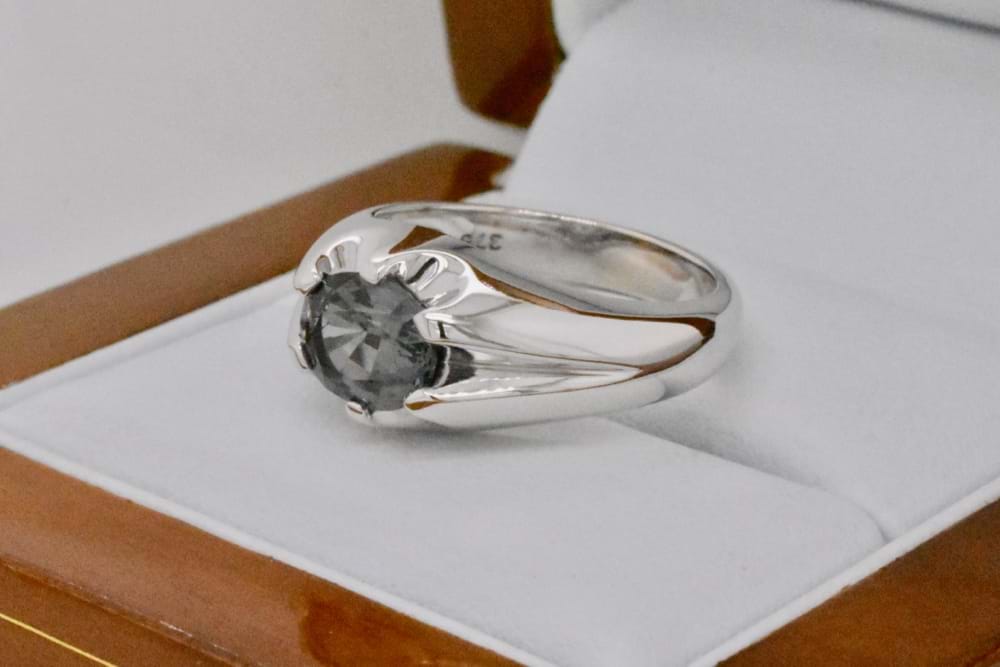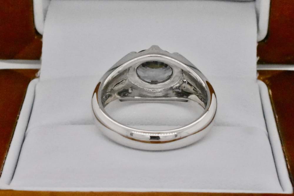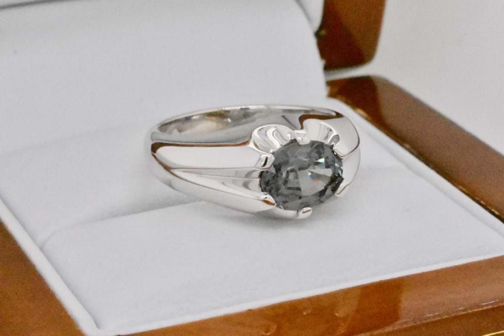 This spectacular grey spinel originates from Man Sin Burma and is 1.88cts, chosen by our client to be the focus of a simple and timeless gents gypsy style ring. Crafted in 9ct white gold this ring is a clean and crisp design that effectively showcases the spinel. Independent Valuation Supplied.