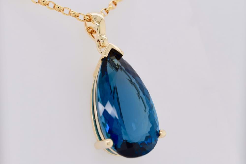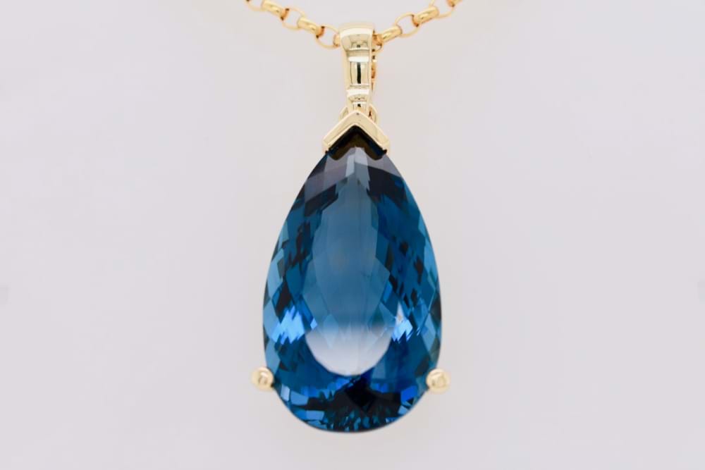 This epic 94.76ct teardrop London blue topaz was selected as a loose gemstone to be the feature of this bespoke 9ct yellow gold pendant. Independent Valuation Supplied.