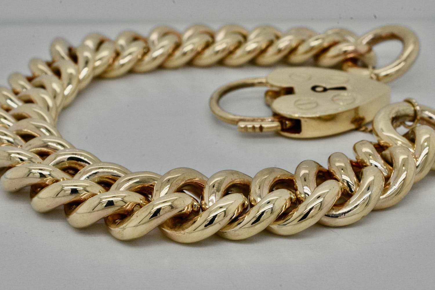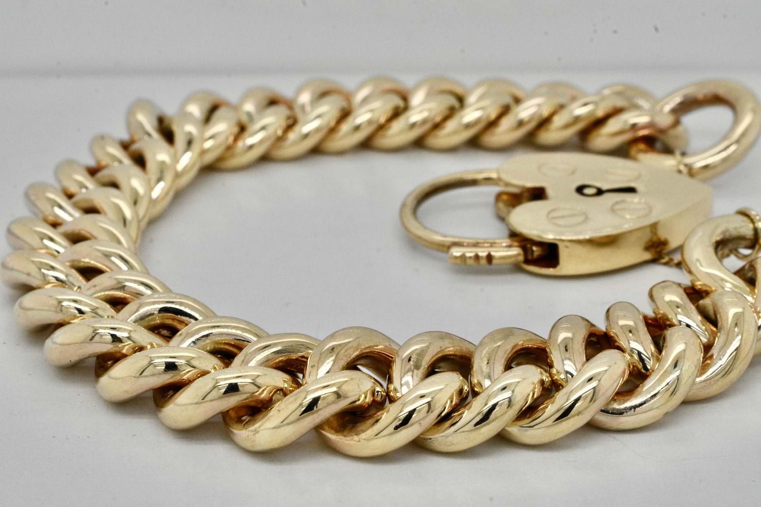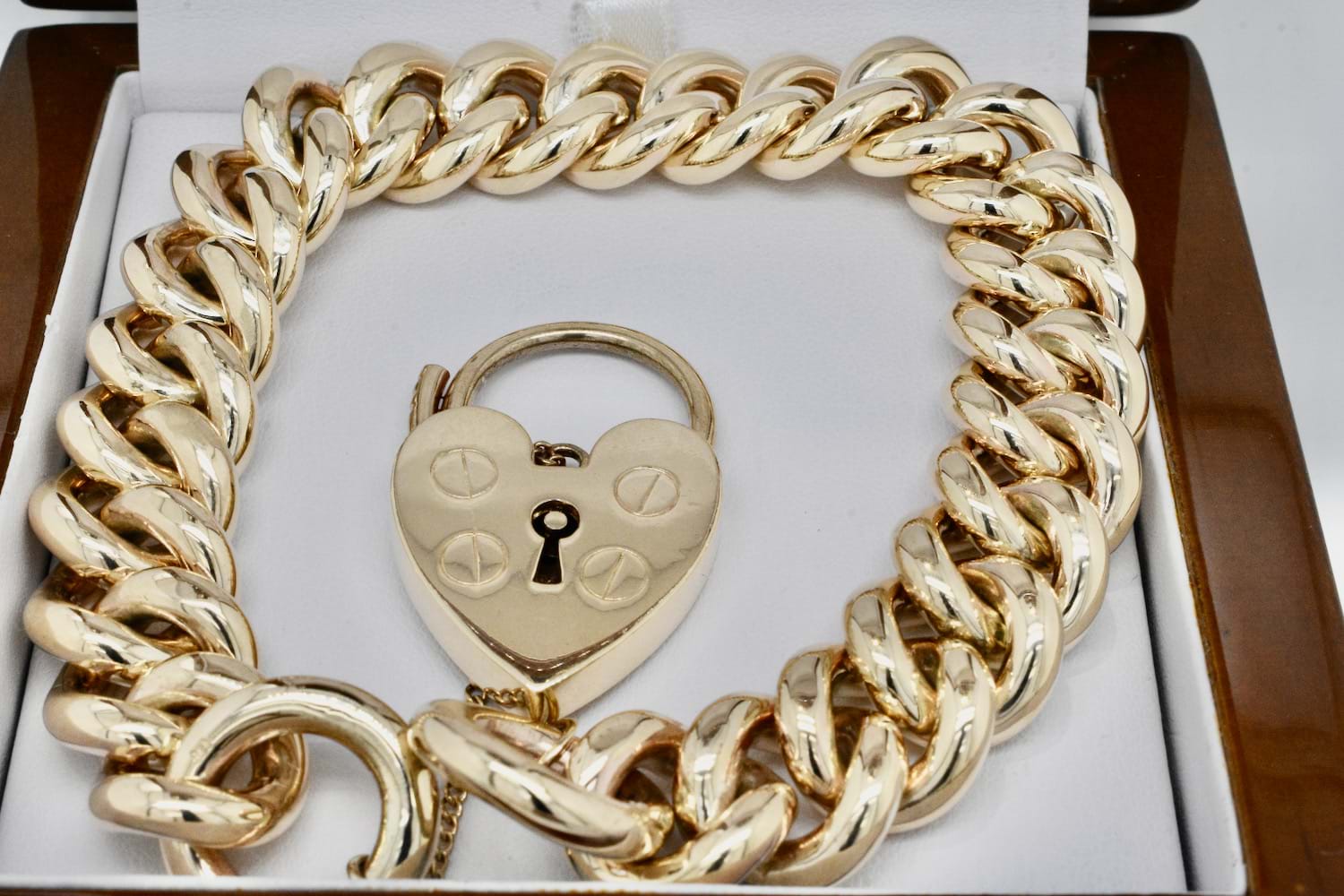 This stunning and solid 142gram curb link bracelet was handmade by our talented goldsmith using our clients unwanted and no longer worn jewellery. Our client now enjoys wearing this stunning 9ct yellow gold bracelet with stunning large heart padlock and safety chain.