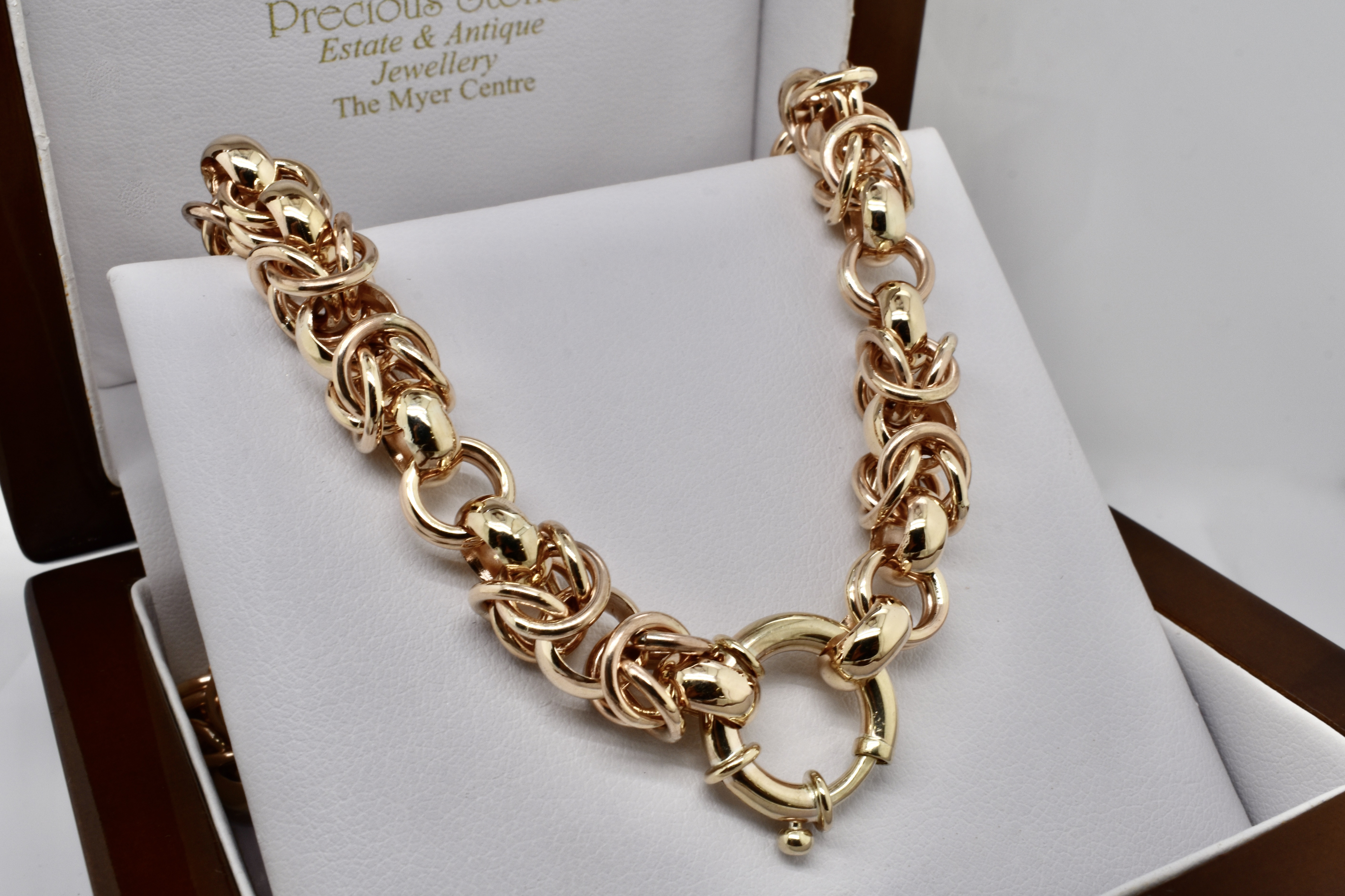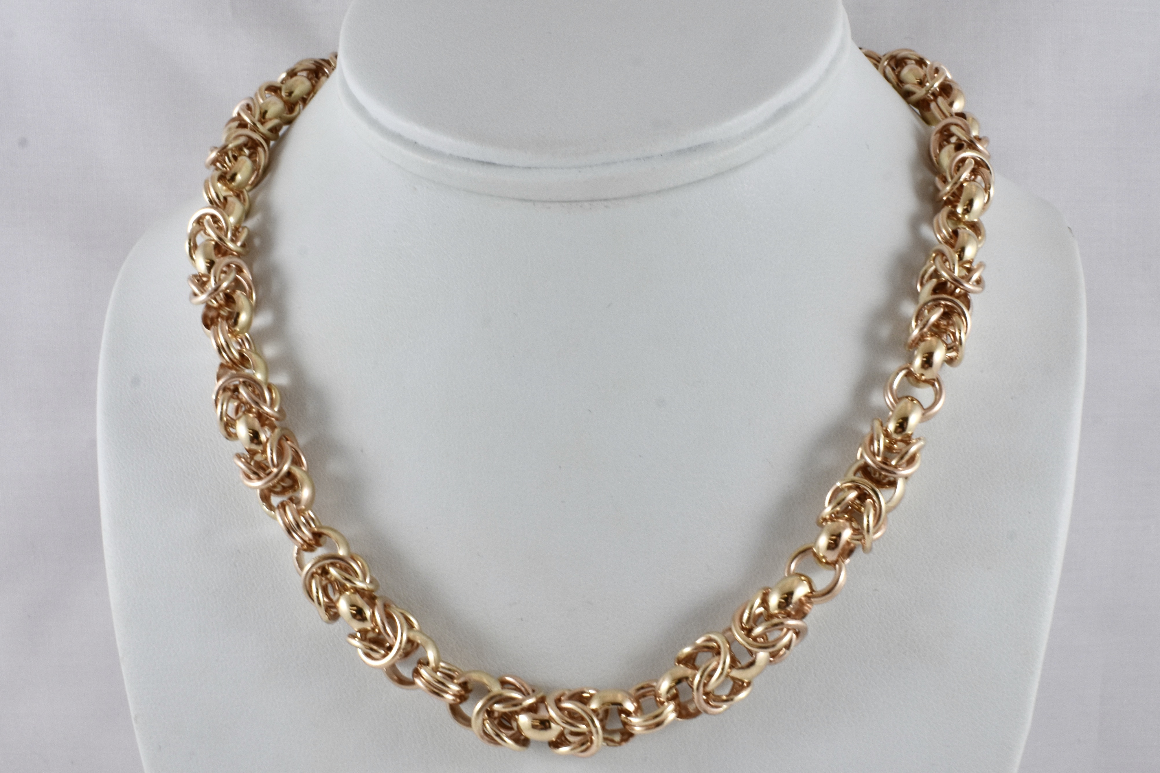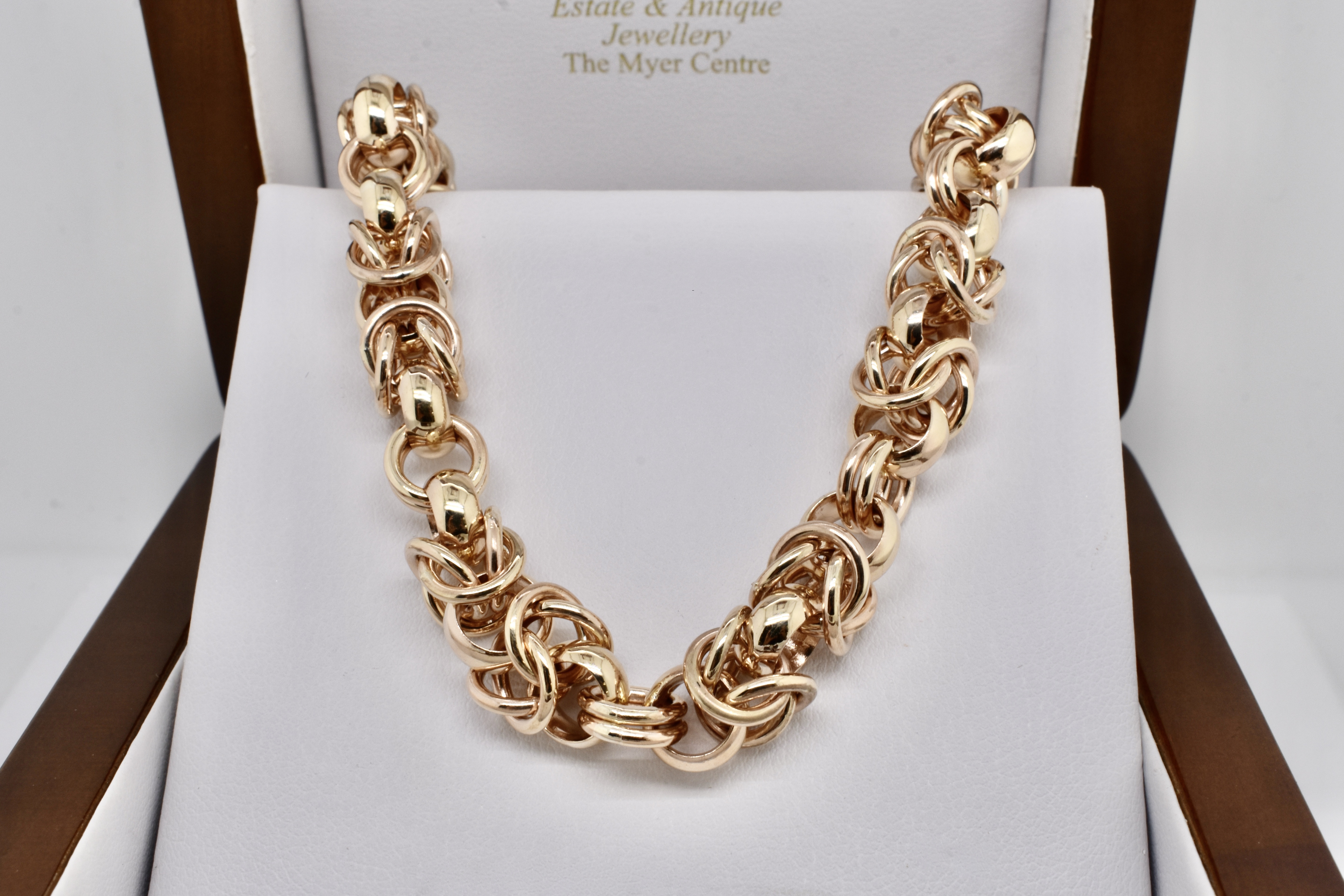 Exquisitely handmade by our goldsmith this Byzantine link is one of the most technically challenging and time consuming links that can be handmade. This stunning example was made in 9ct yellow gold for our client and is 46cm with a European boltring clasp and weighs 96.69grams.