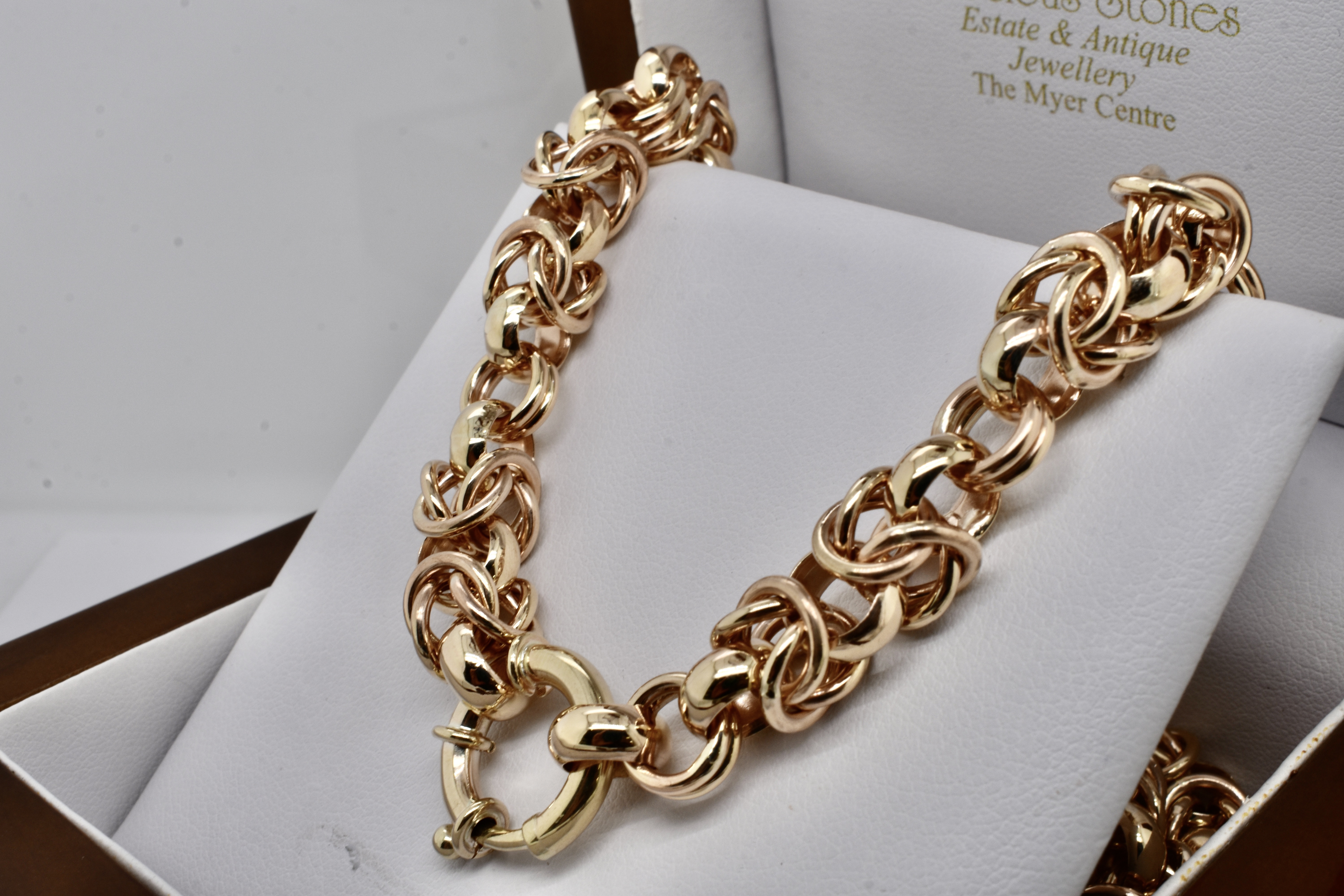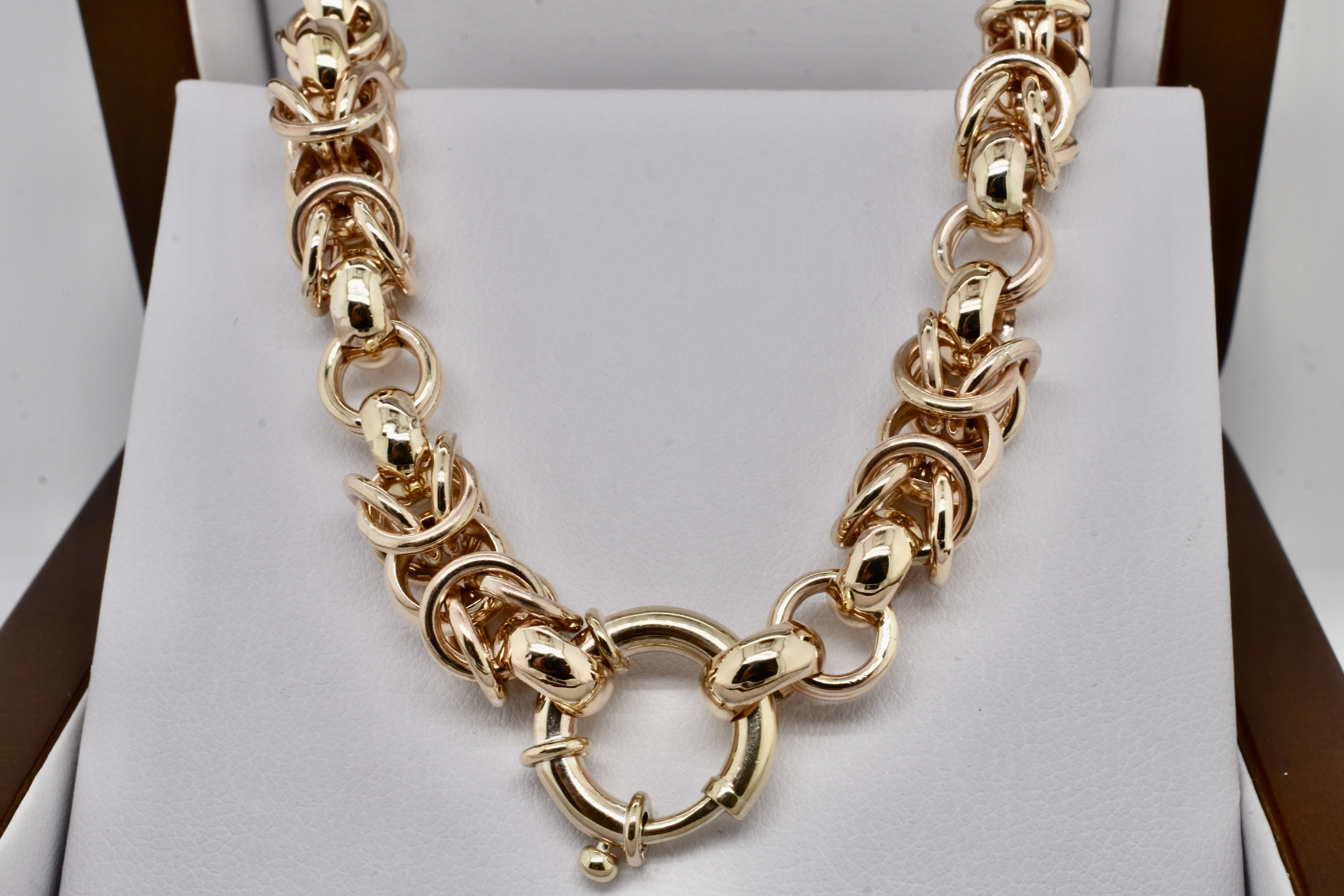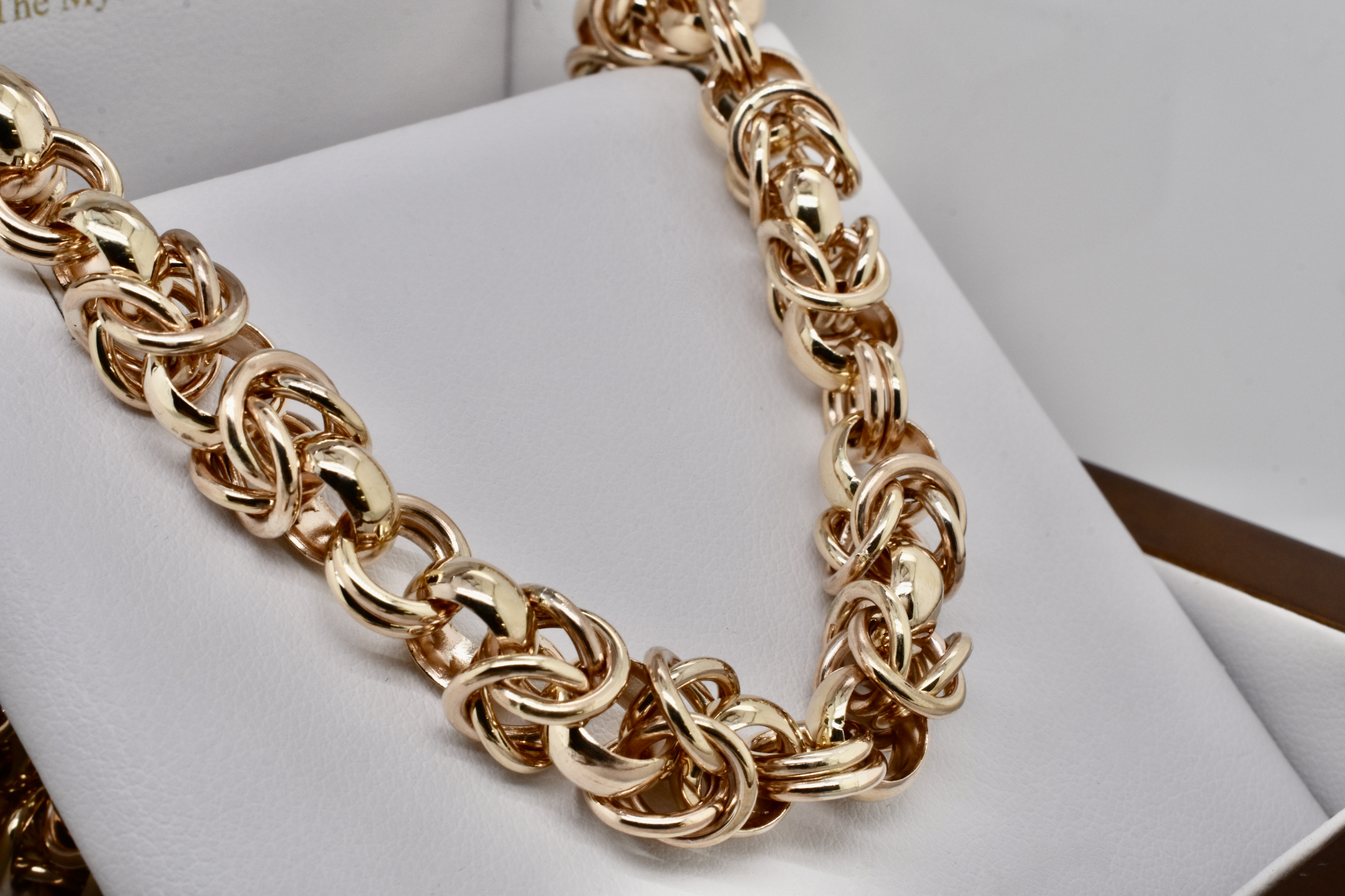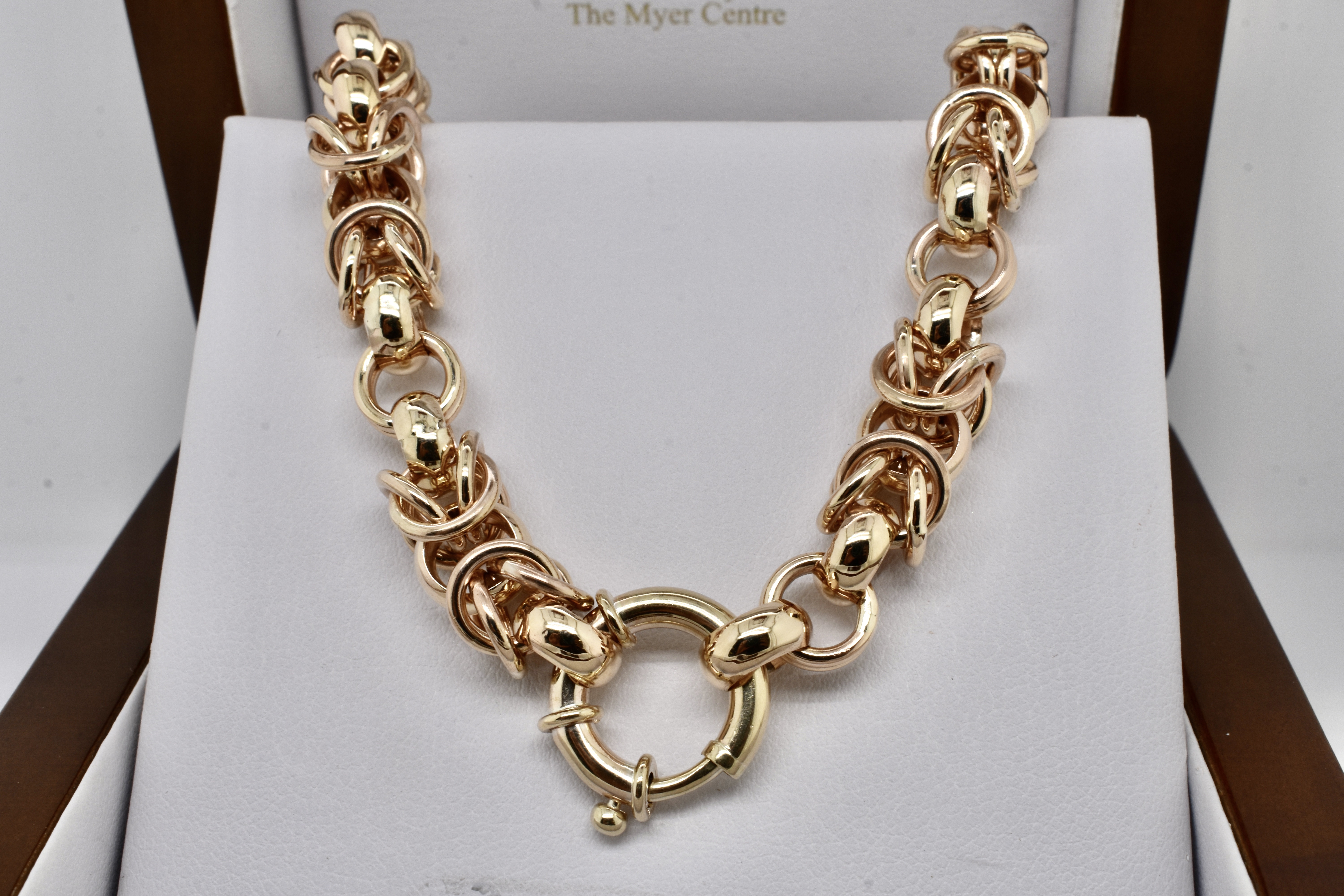 Exquisitely handmade by our goldsmith this Byzantine link is one of the most technically challenging and time consuming links that can be handmade. This stunning example was made in 9ct yellow gold for our client and is 46cm with a European boltring clasp and weighs 96.69grams.