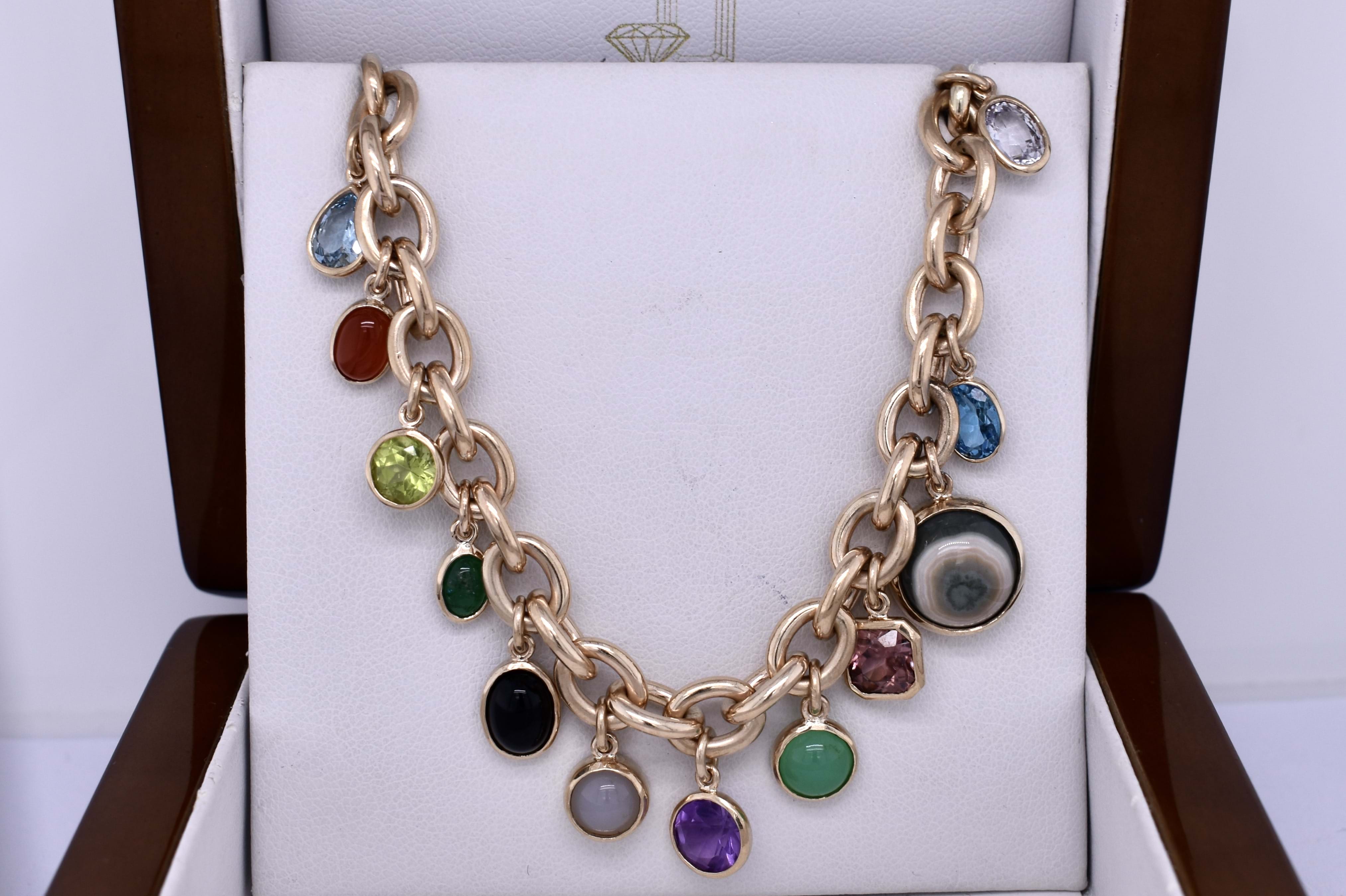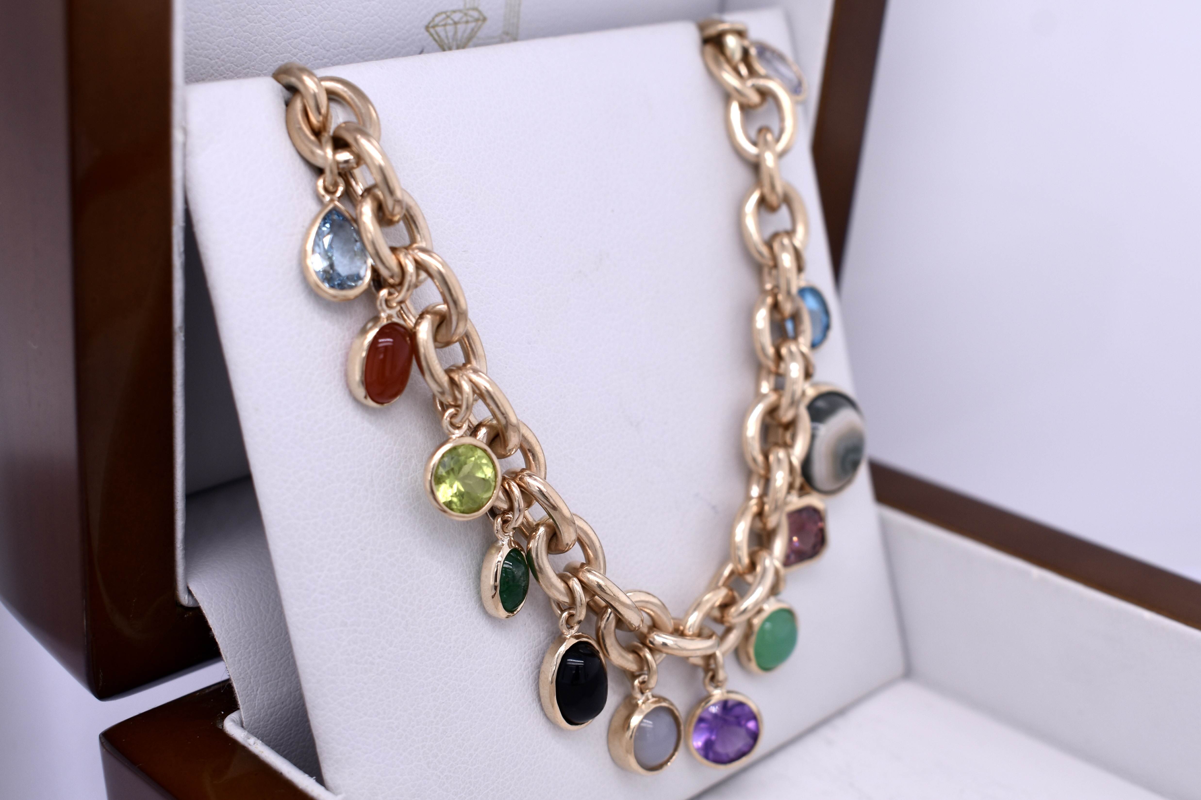Our goldsmith handmade this 9ct yellow gold cable link bracelet with a view to being the vessel to hold twelve, specially sourced, assorted gemstones in bezel settings. The stones represent the twelve stones of the Bible and include: Jasper, Carnelian, Chalcedony, Emerald, Peridot, Aquamarine, Blue Topaz, Amethyst, Onyx, White Sapphire & Zircon.