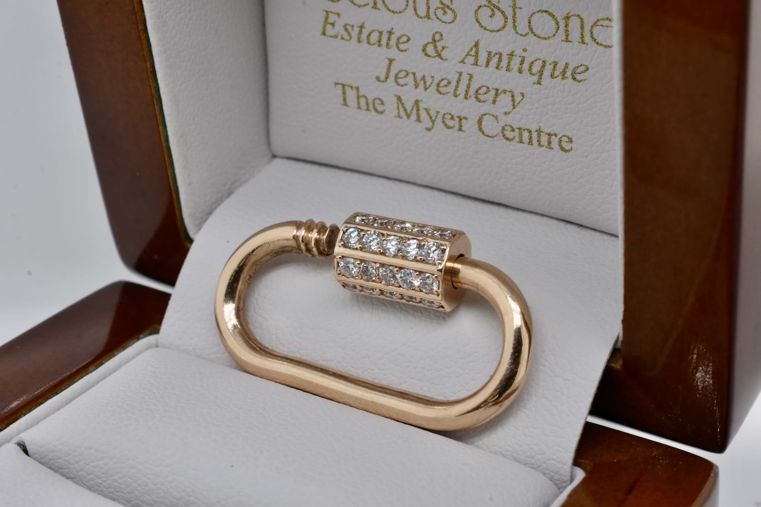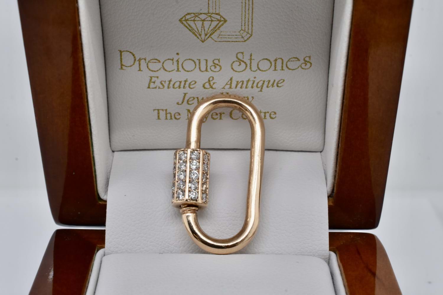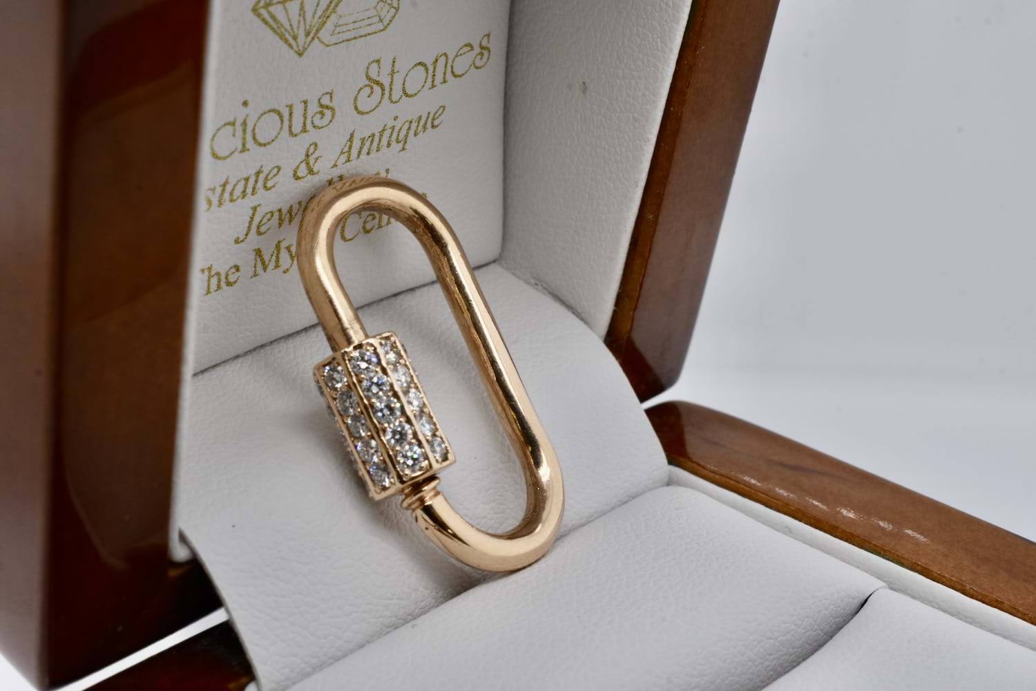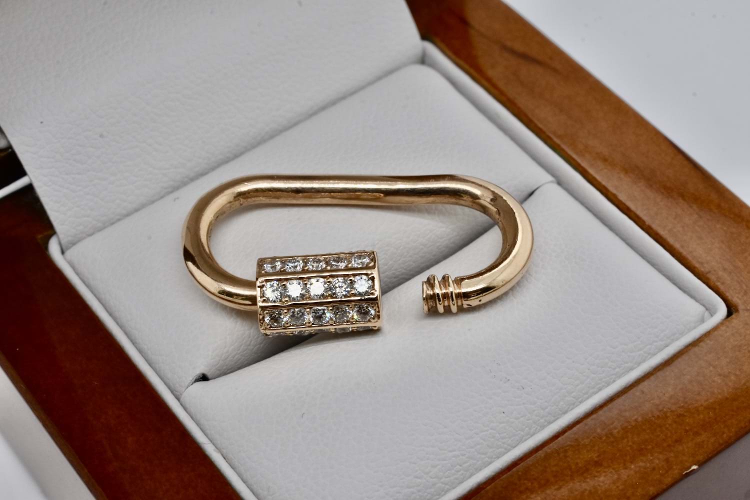 A contemporary design with a touch of sparkle, this handmade carabiner is a versatile piece which can be used as a clasp, charm or pendant. Handmade in 9ct yellow gold, it is in a rounded rectangle shape with the screw lock encrusted with a total of forty diamonds equalling 0.91ct GH/SI set in vertical lines to each side of the screw, which opens by hand. Independent Valuation Supplied