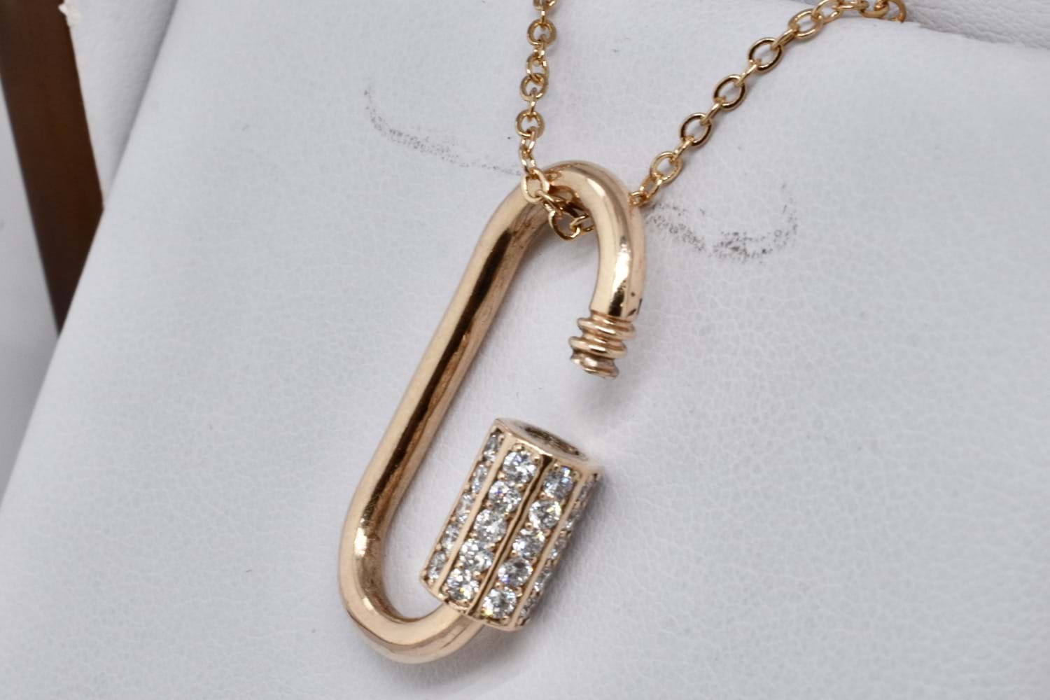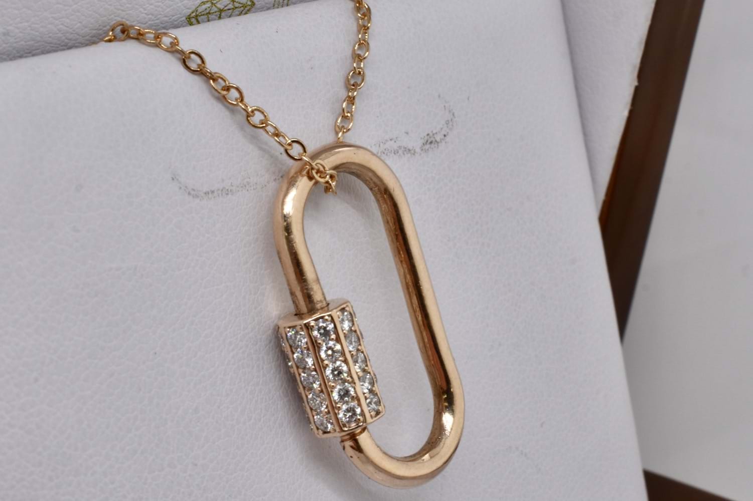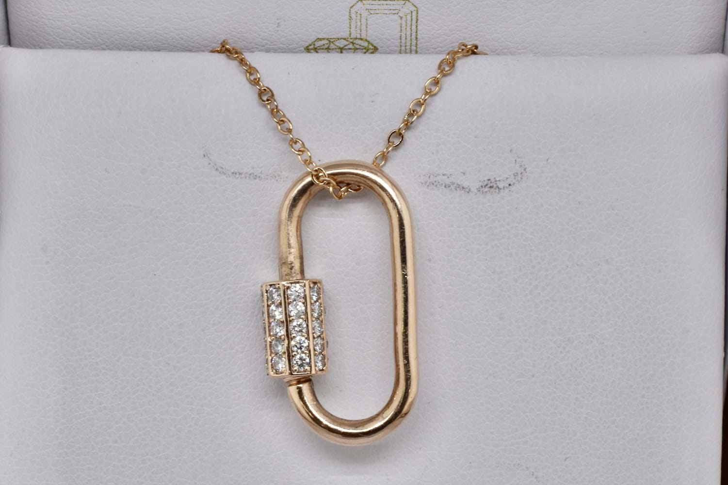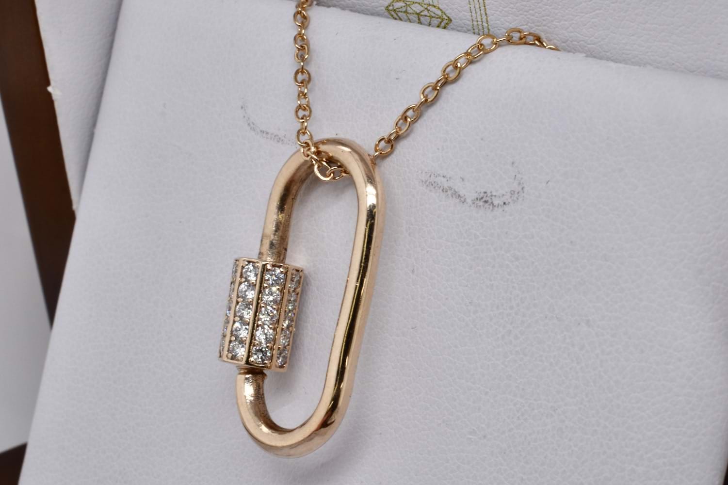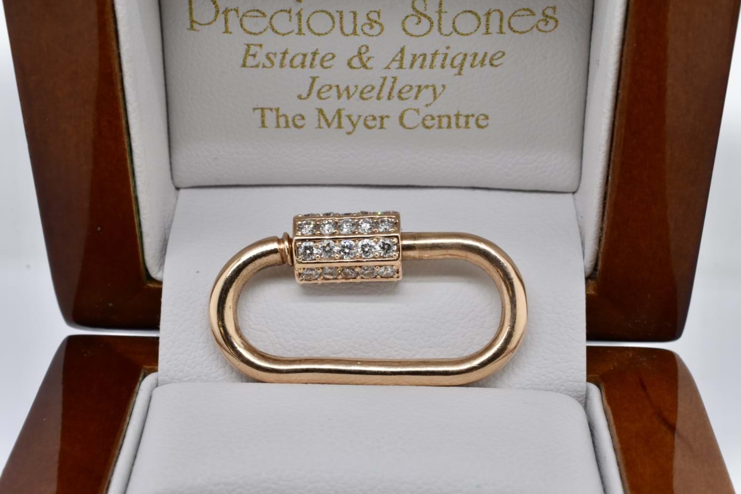 A contemporary design with a touch of sparkle, this handmade carabiner is a versatile piece which can be used as a clasp, charm or pendant. Handmade in 9ct yellow gold, it is in a rounded rectangle shape with the screw lock encrusted with a total of forty diamonds equalling 0.91ct GH/SI set in vertical lines to each side of the screw, which opens by hand. Independent Valuation Supplied