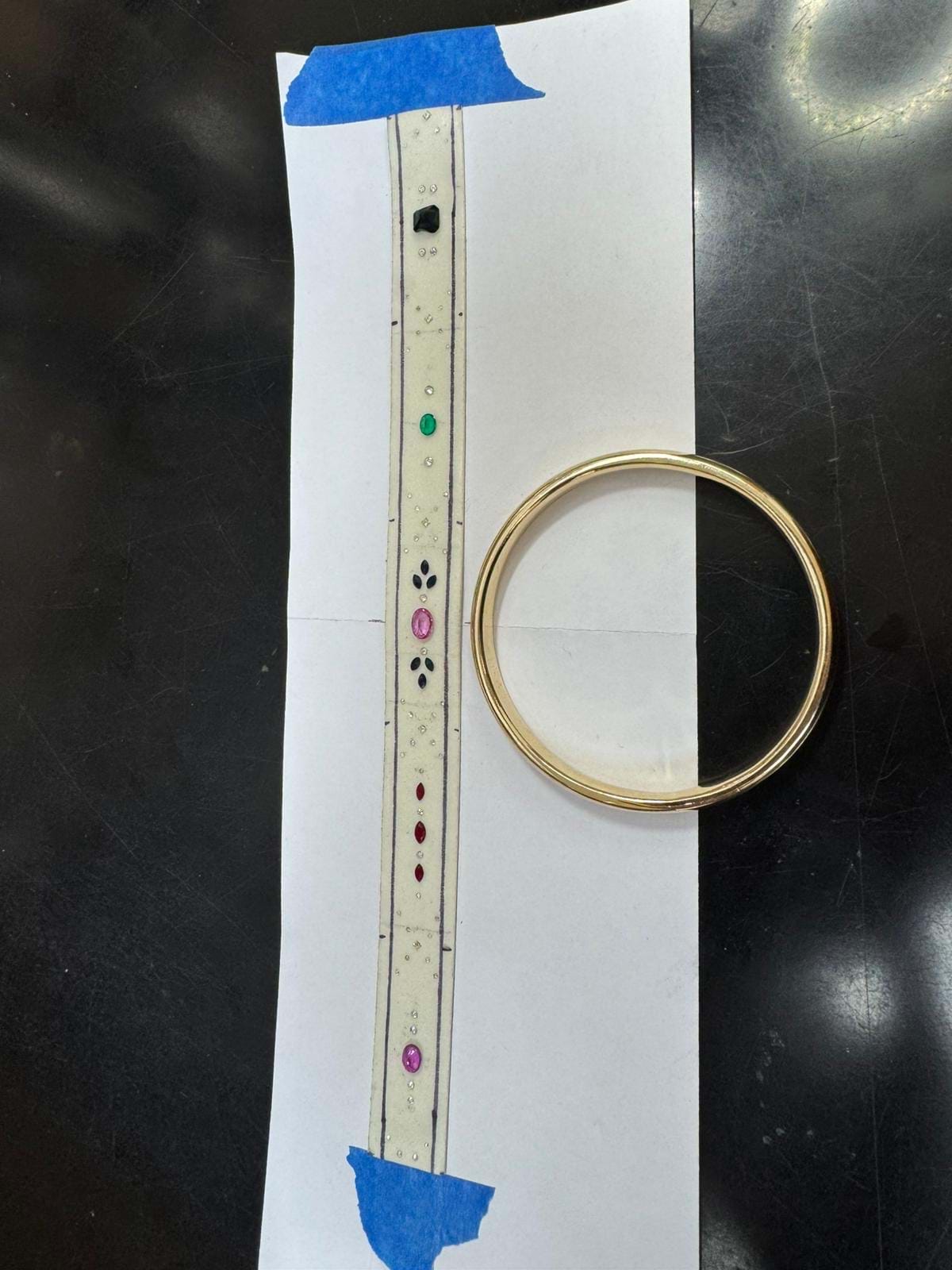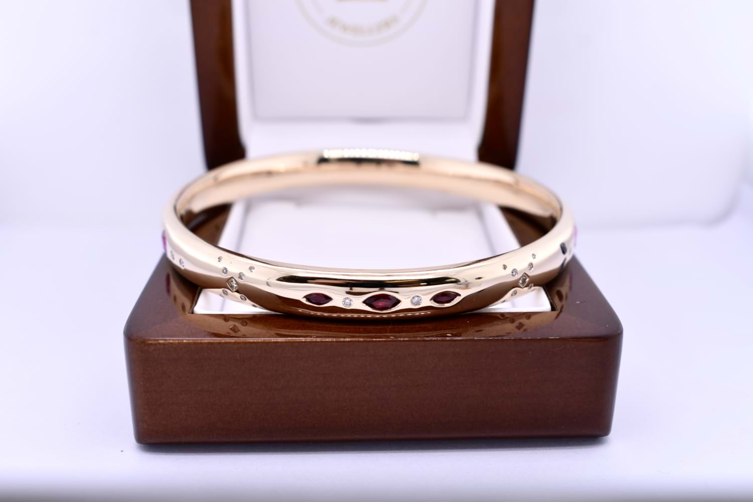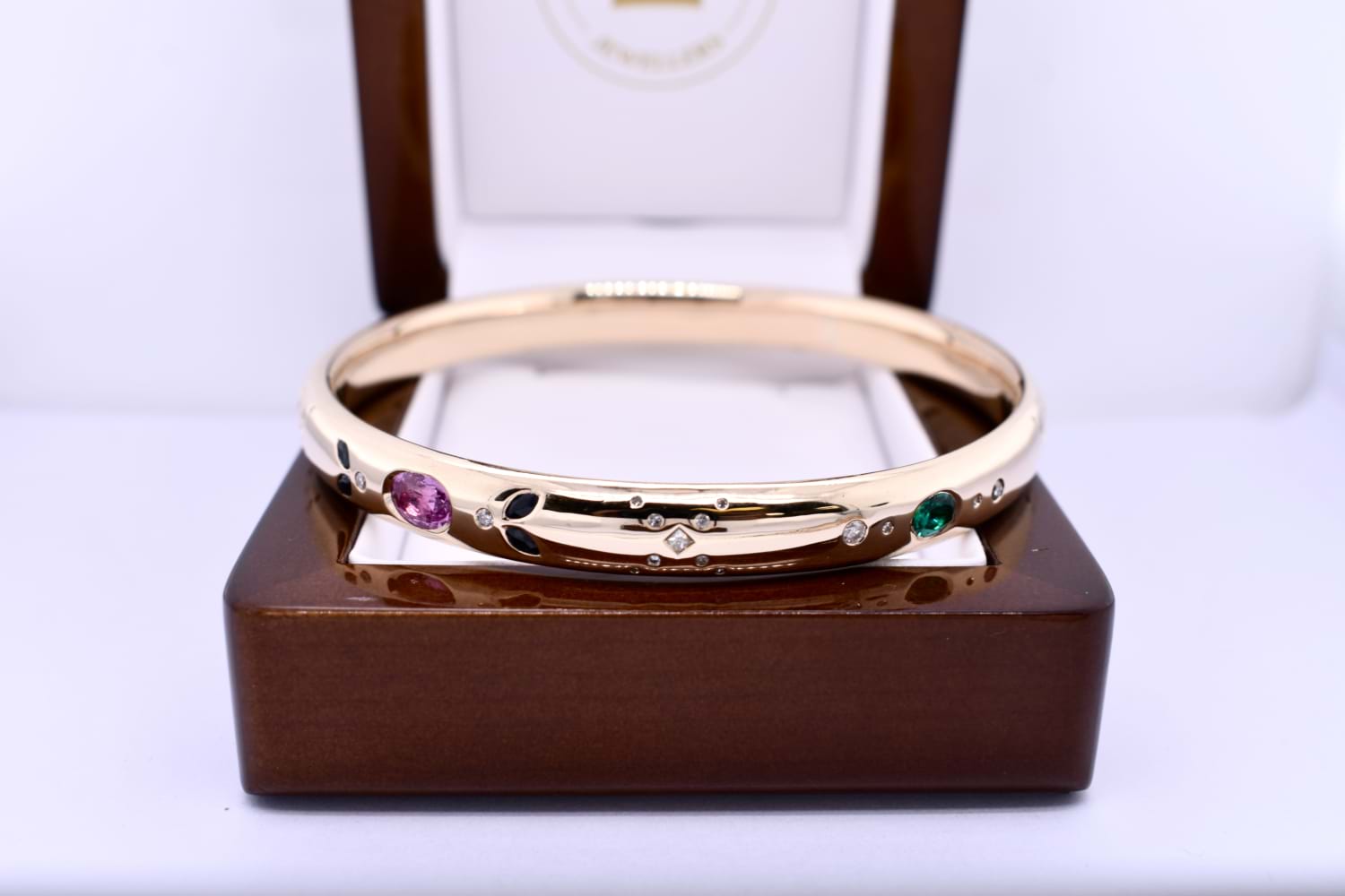 This fabulous bangle was made for a very special client recycling her old gold jewellery that she no longer wears. The bangle was handmade by our goldsmith and features all recycled and sentimental gemstones and diamonds inset around the entire bangle. This is the perfect way to incorporate many pieces into one wearable piece.