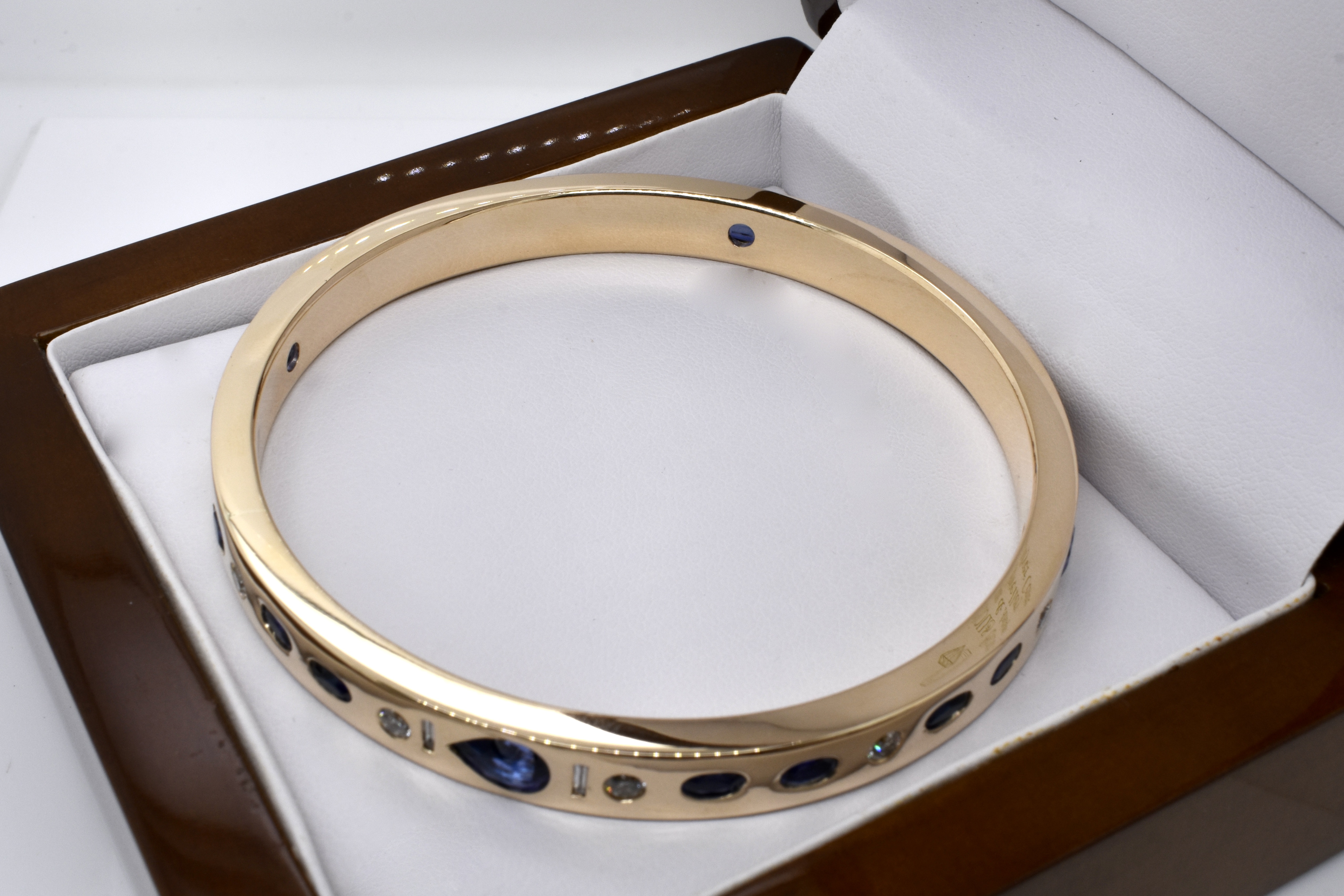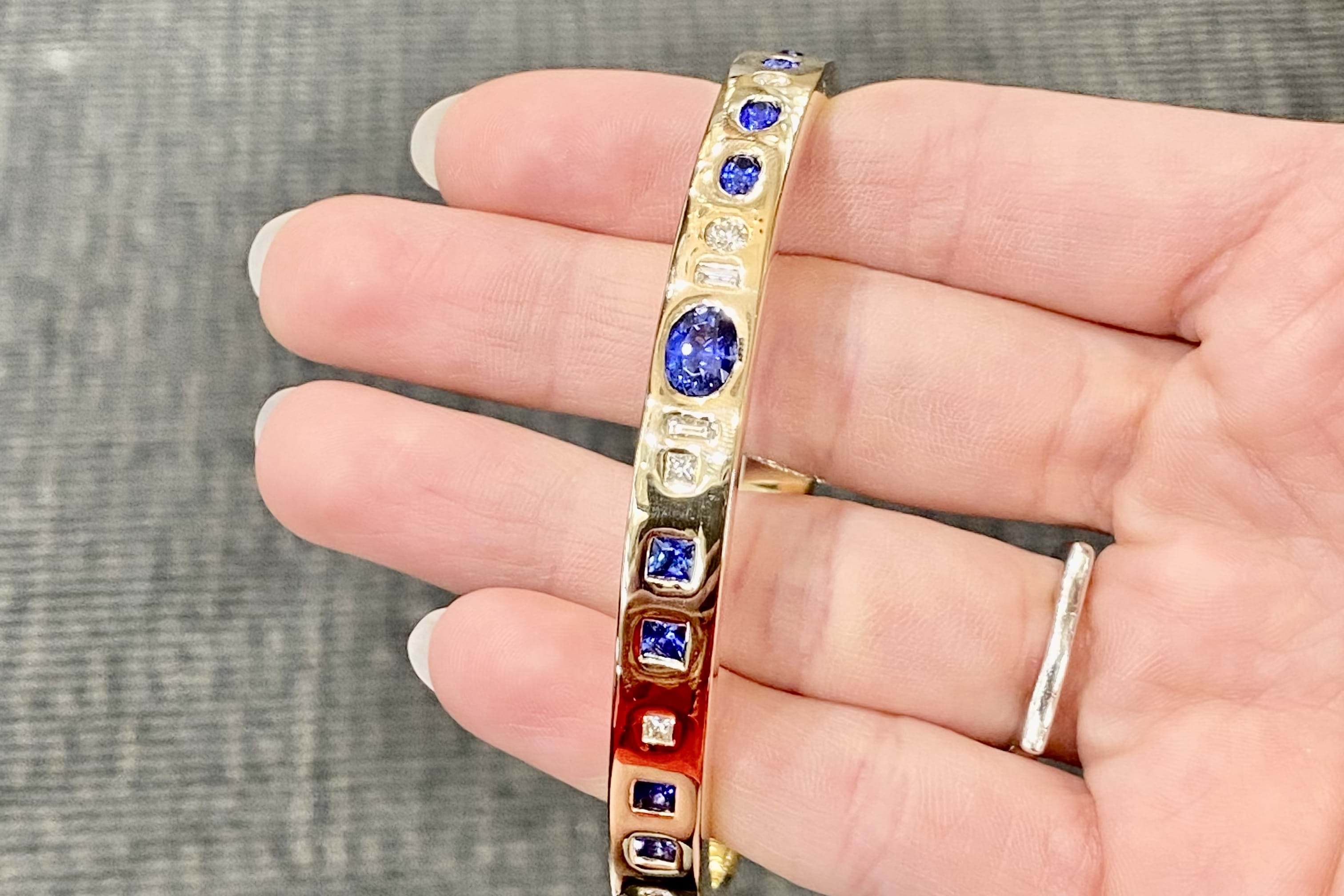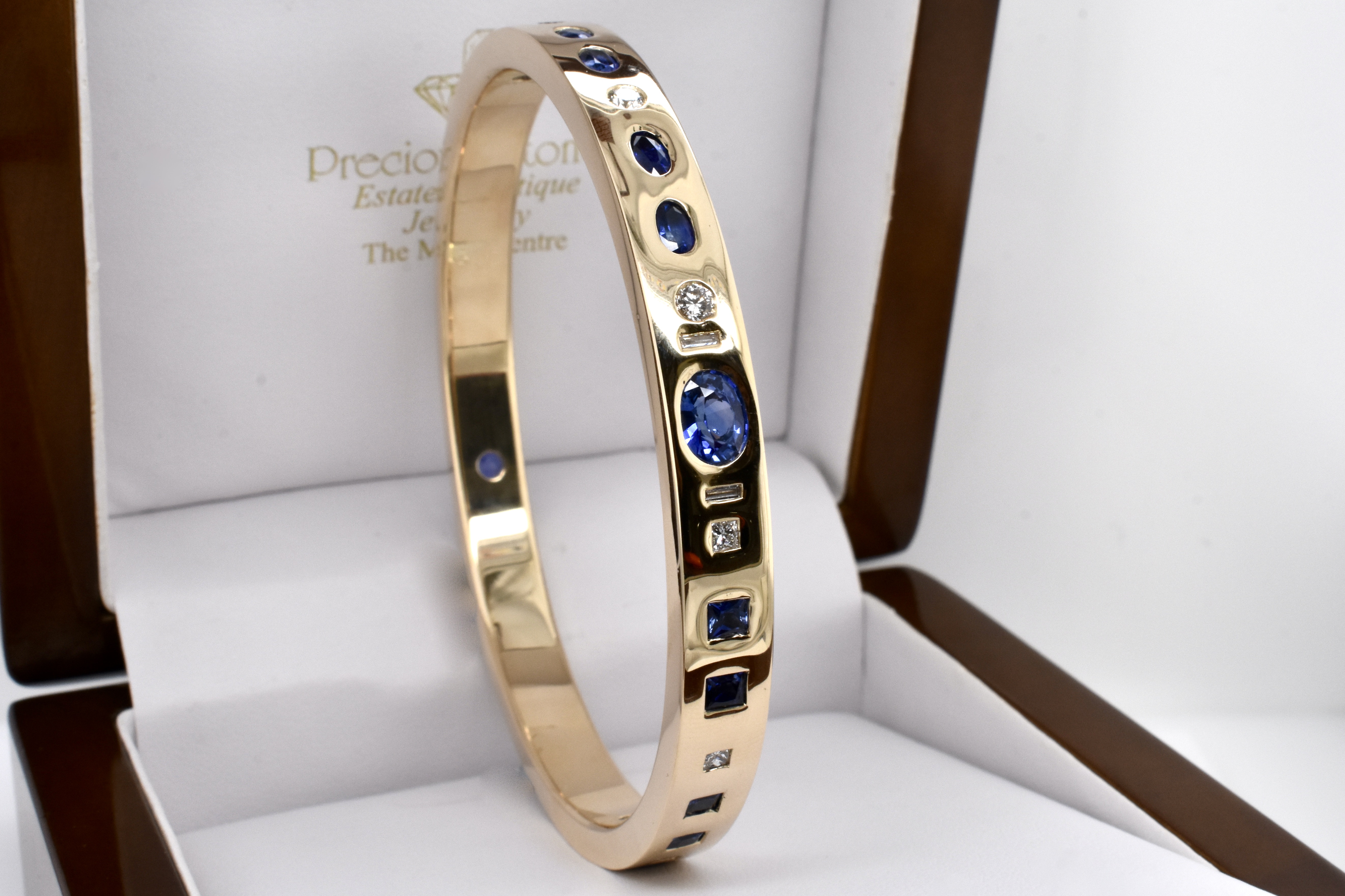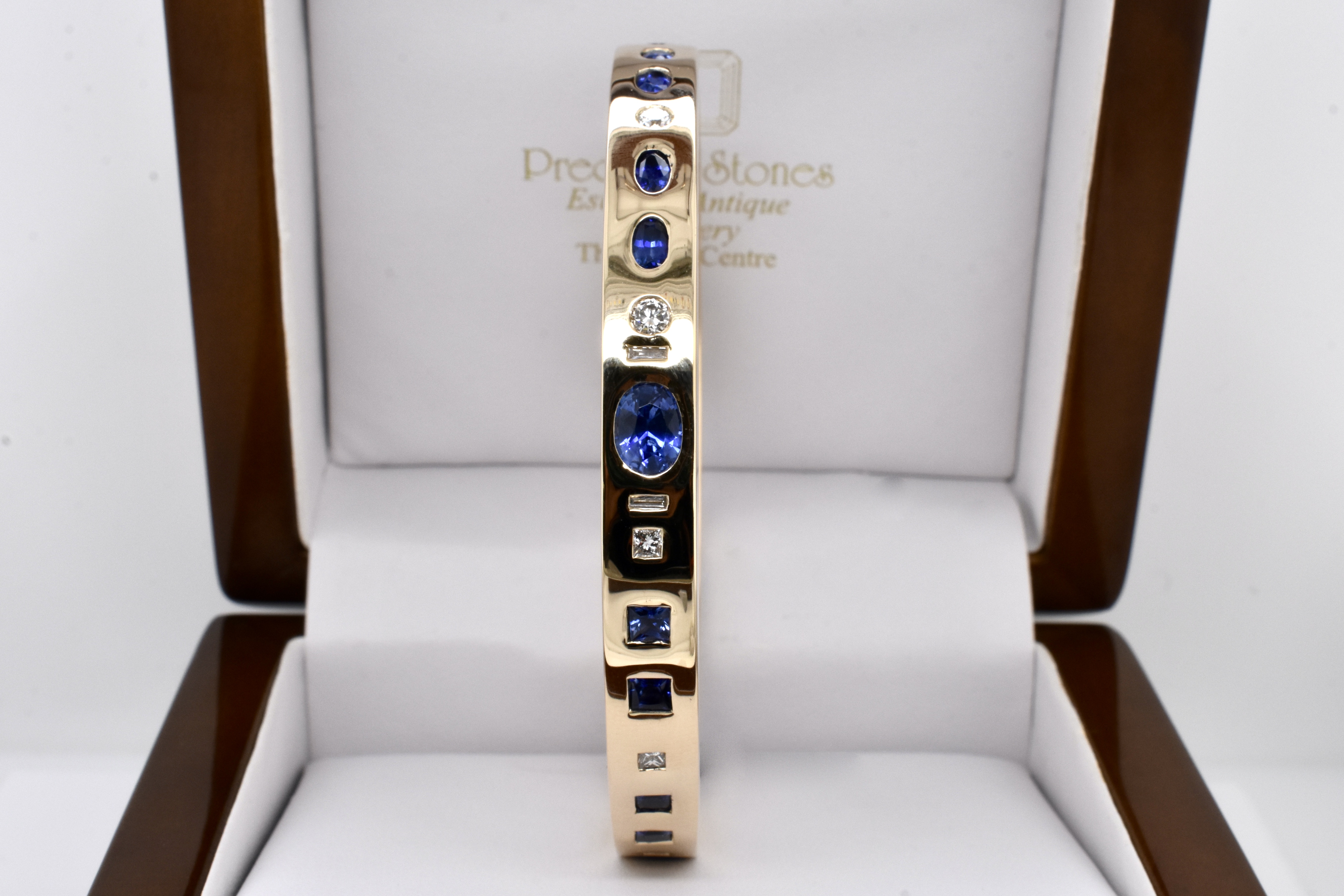 An exquisite and sumptuous piece, this bangle has been expertly hand crafted in solid 9ct yellow gold with a flat edge profile and a luxurious total weight of around 64 grams.The piece is set with an impressive total of 8.99ct of gorgeous mid blue Ceylon sapphires in princess cut, emerald cut, oval and pear shapes with a complement of sparkling white diamonds totalling 1.36ct GH/VS-SI all pressure set into the bangle. Independent Valuation Supplied