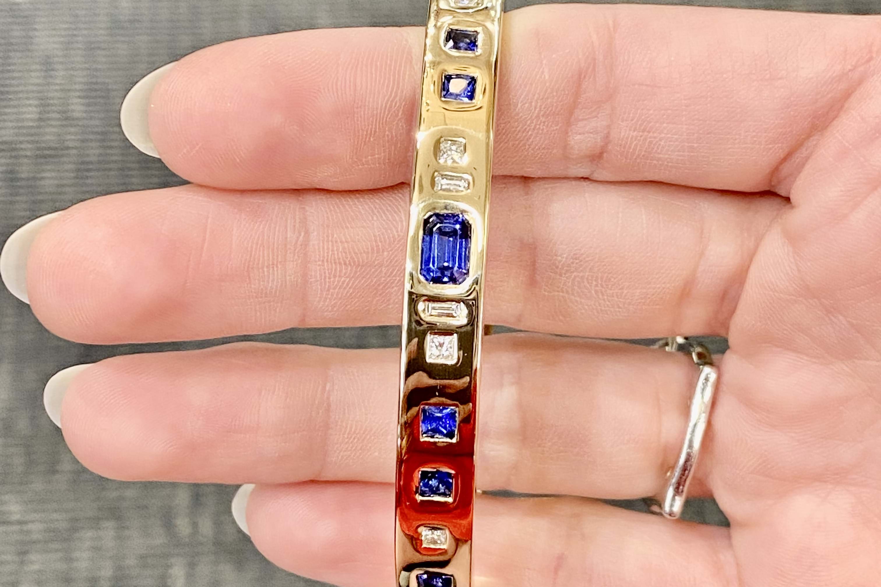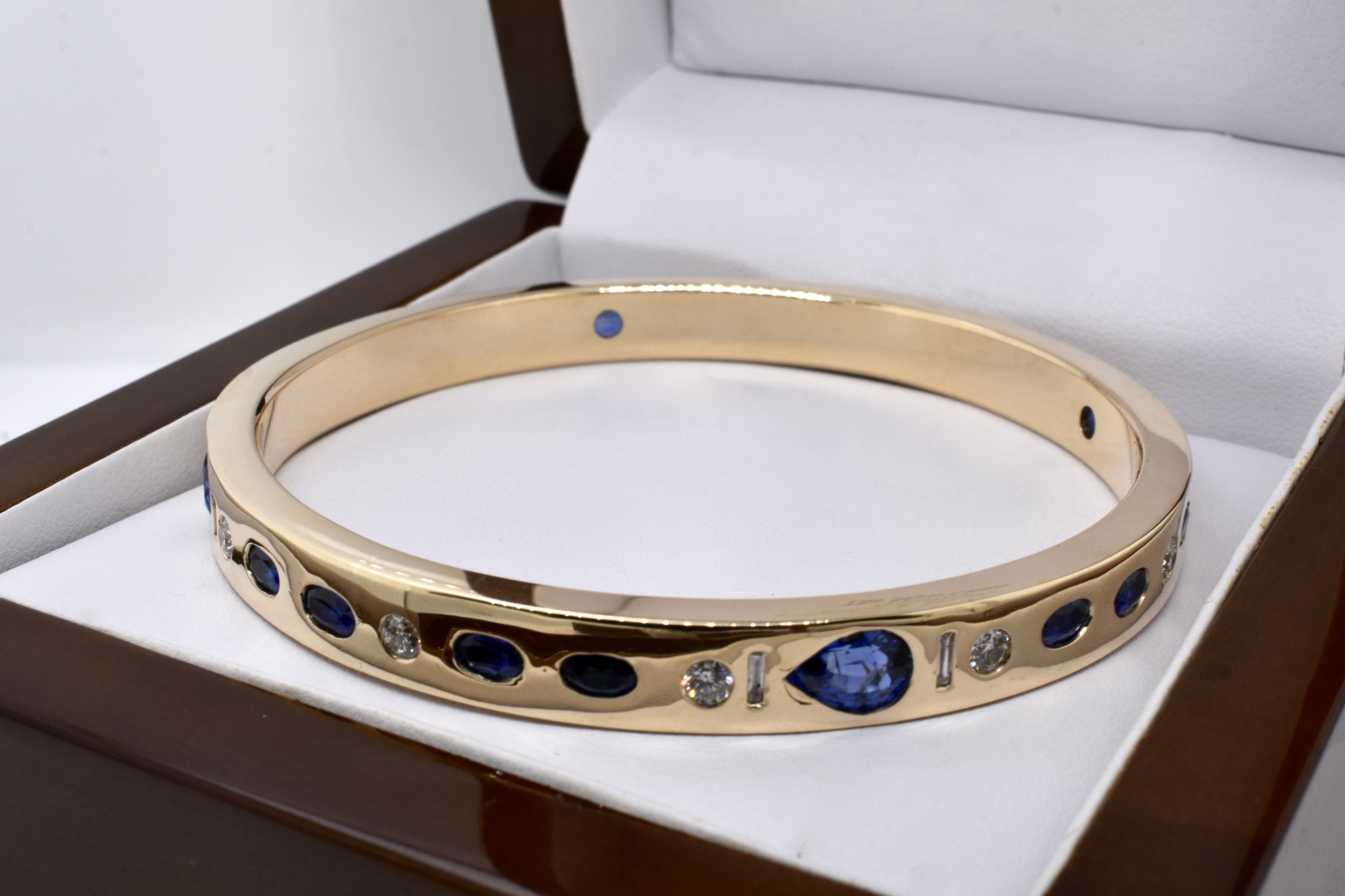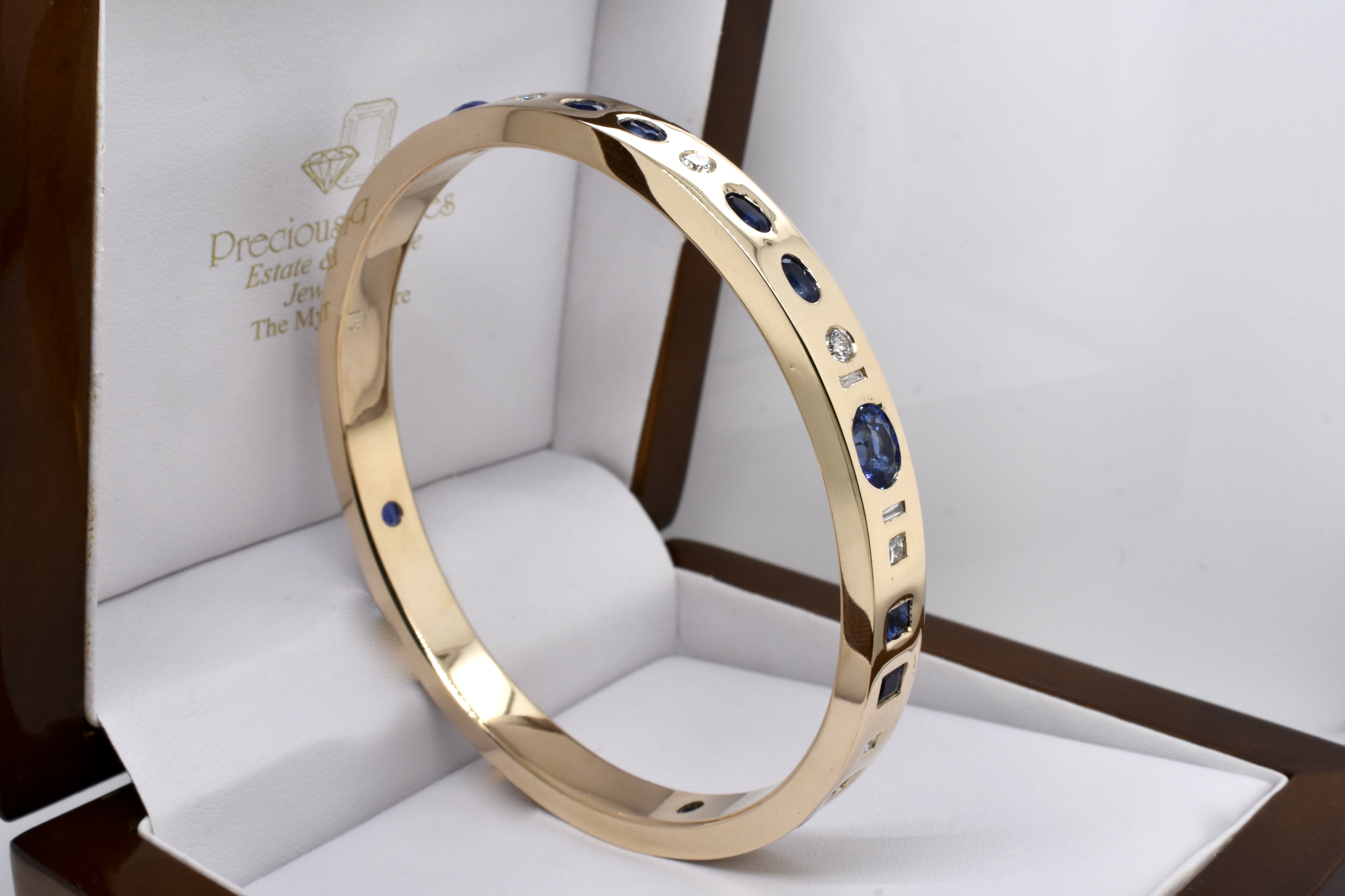 An exquisite and sumptuous piece, this bangle has been expertly hand crafted in solid 9ct yellow gold with a flat edge profile and a luxurious total weight of around 64 grams.The piece is set with an impressive total of 8.99ct of gorgeous mid blue Ceylon sapphires in princess cut, emerald cut, oval and pear shapes with a complement of sparkling white diamonds totalling 1.36ct GH/VS-SI all pressure set into the bangle. Independent Valuation Supplied