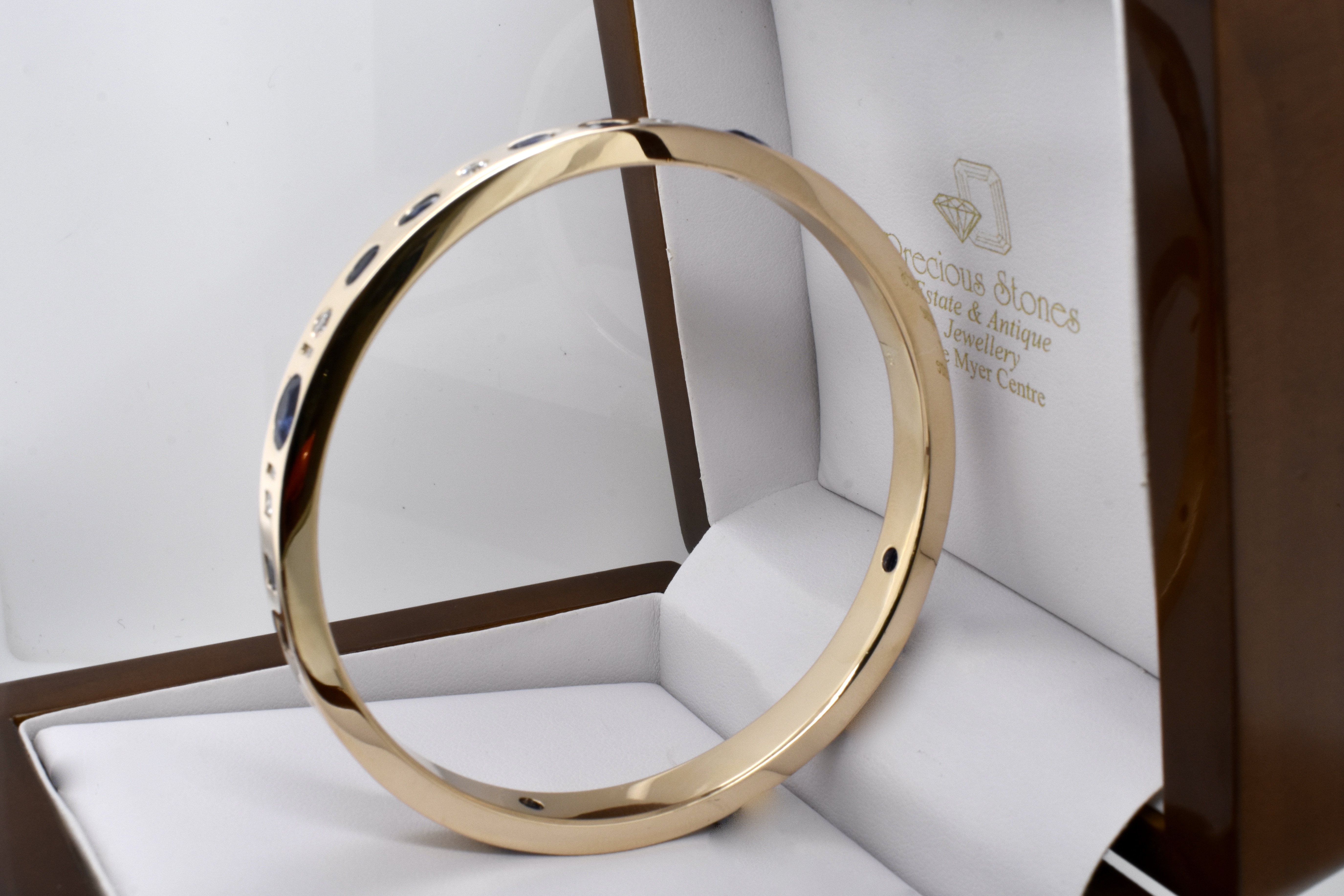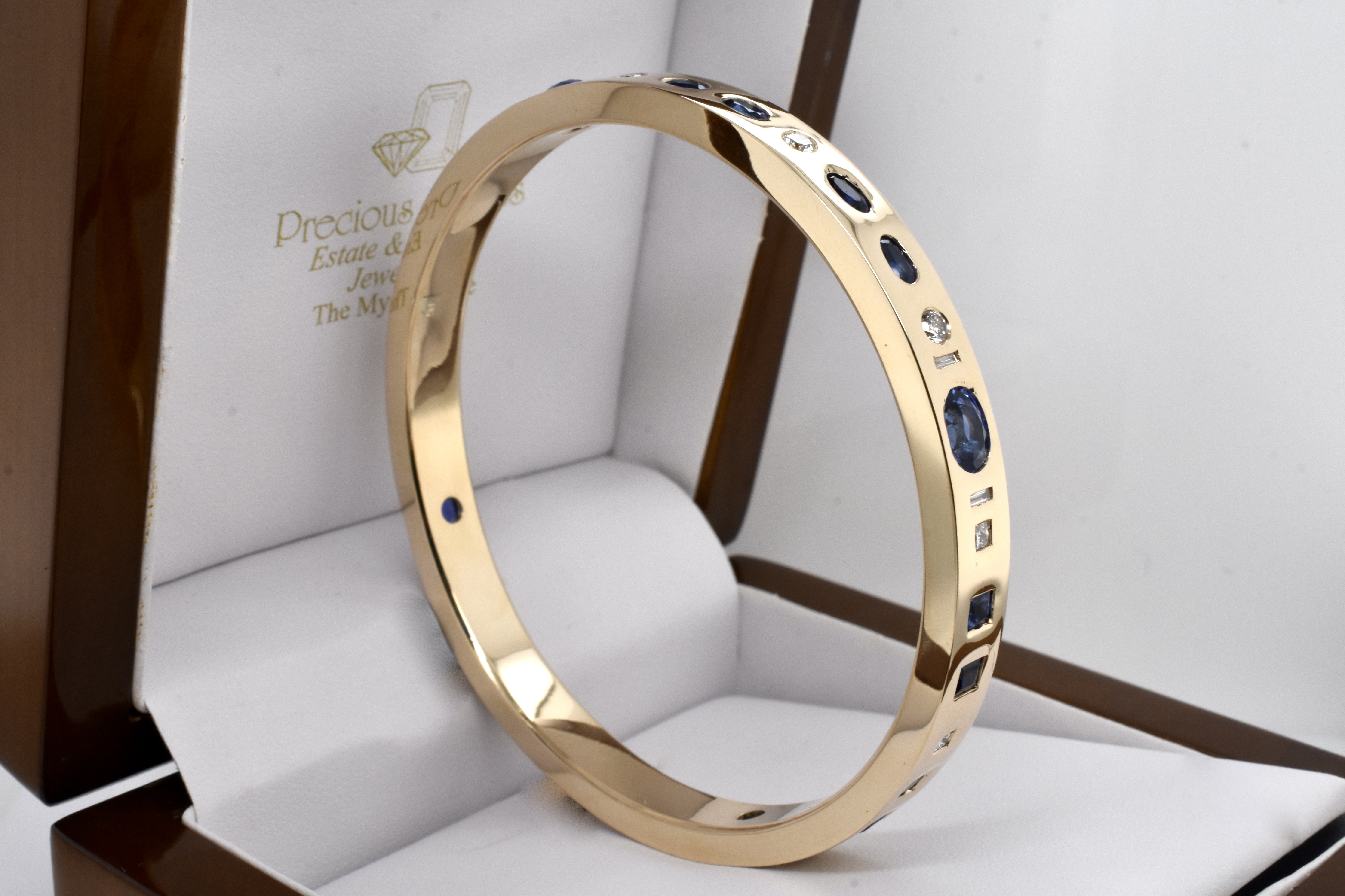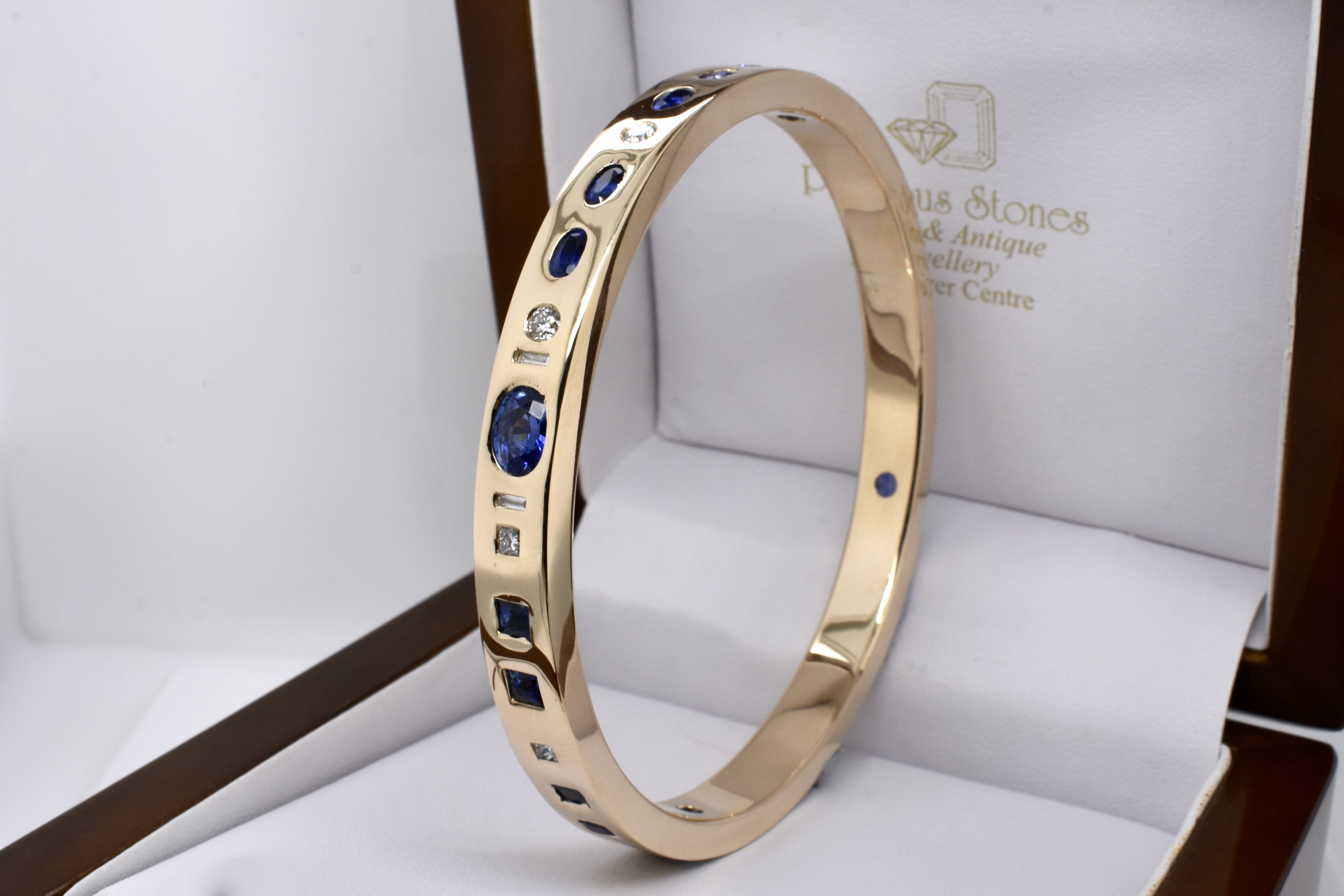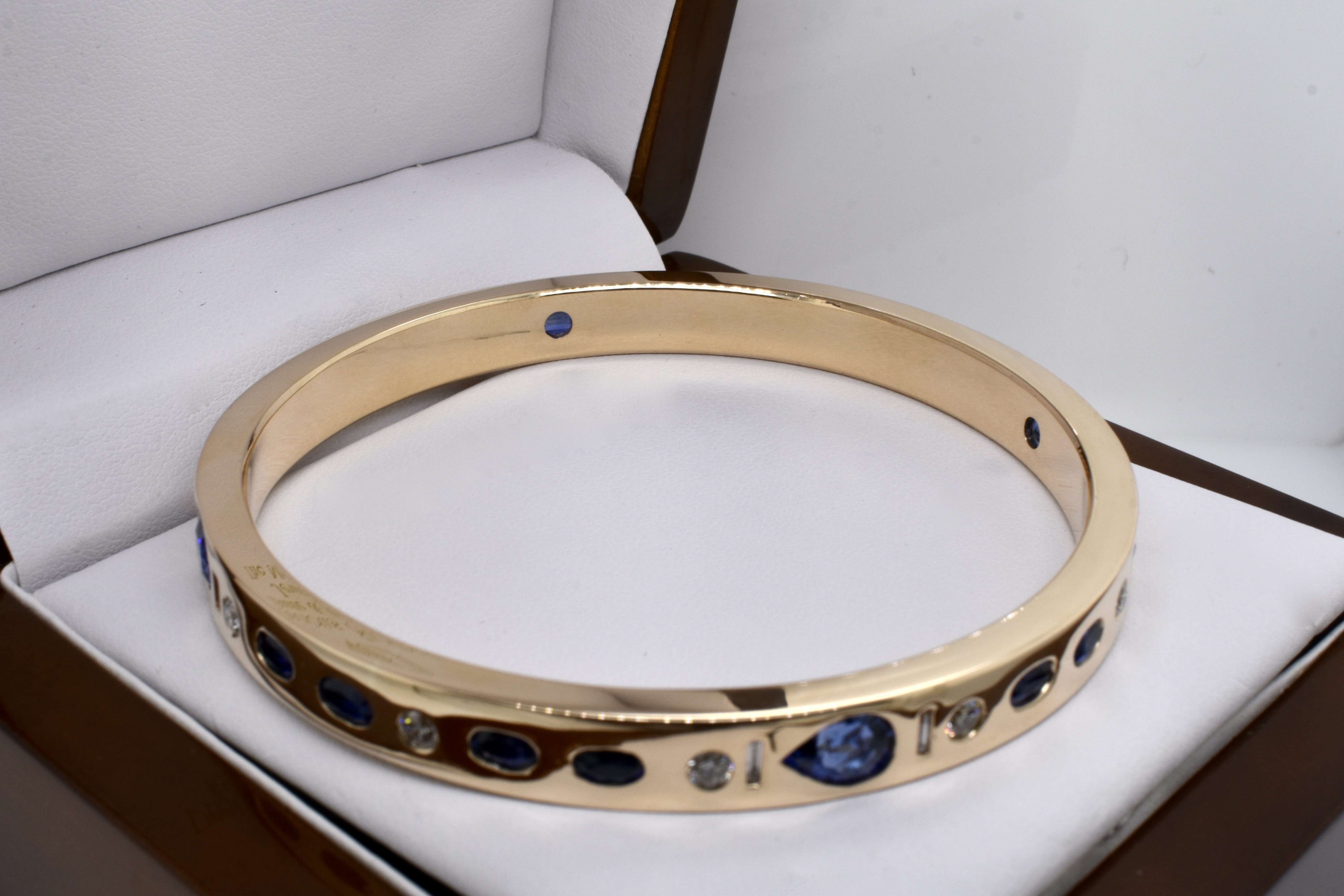 An exquisite and sumptuous piece, this bangle has been expertly hand crafted in solid 9ct yellow gold with a flat edge profile and a luxurious total weight of around 64 grams.The piece is set with an impressive total of 8.99ct of gorgeous mid blue Ceylon sapphires in princess cut, emerald cut, oval and pear shapes with a complement of sparkling white diamonds totalling 1.36ct GH/VS-SI all pressure set into the bangle. Independent Valuation Supplied