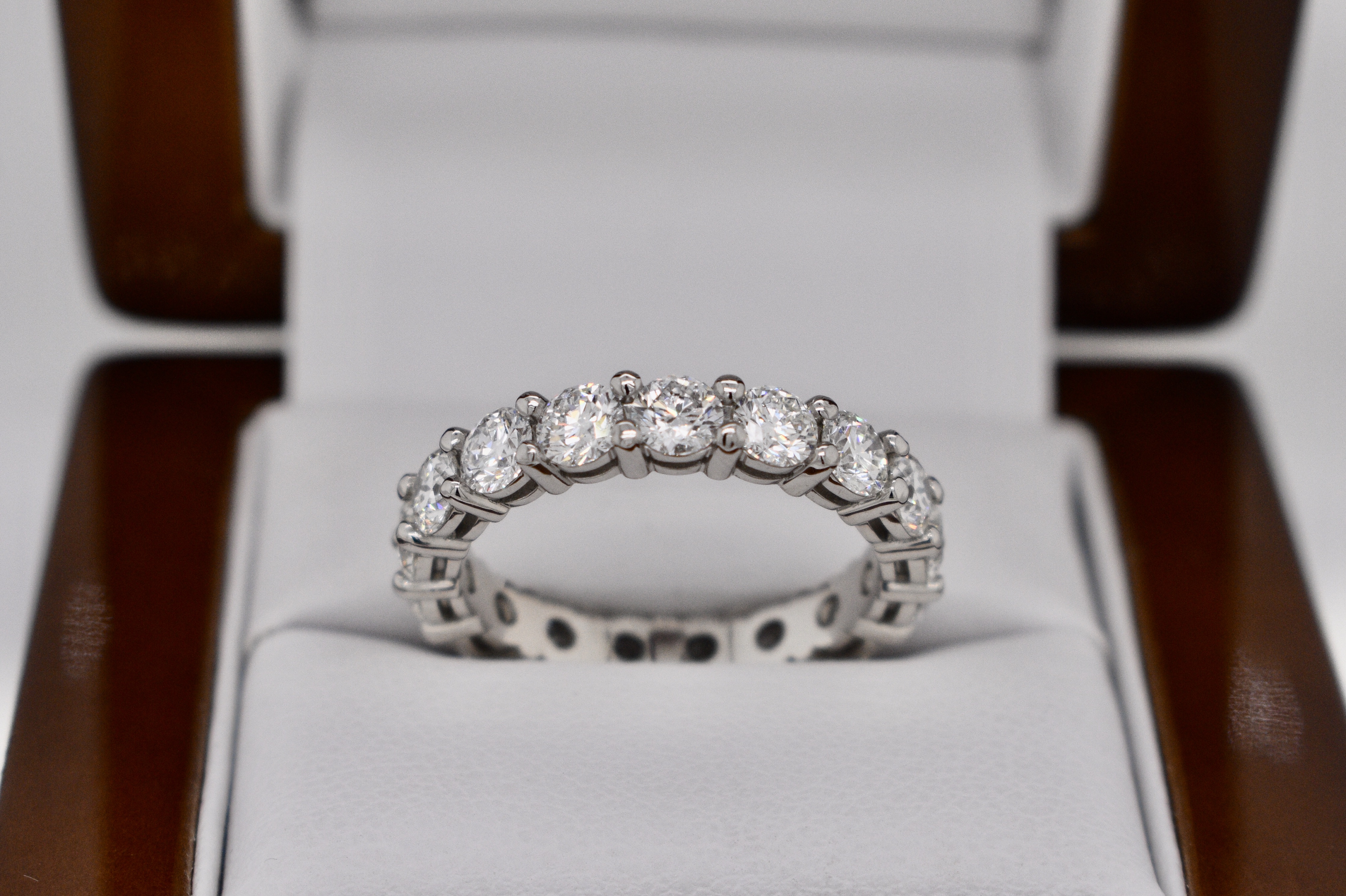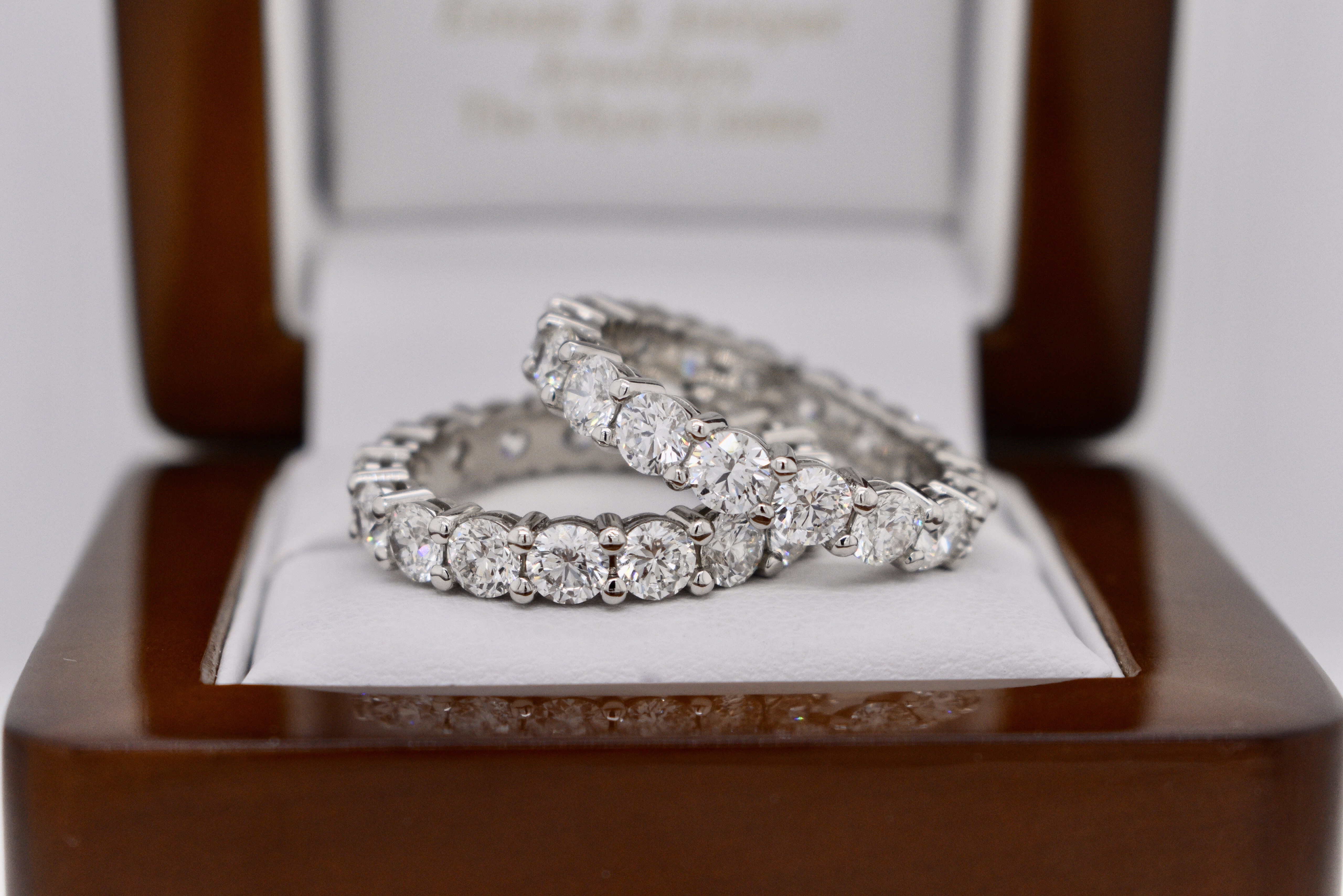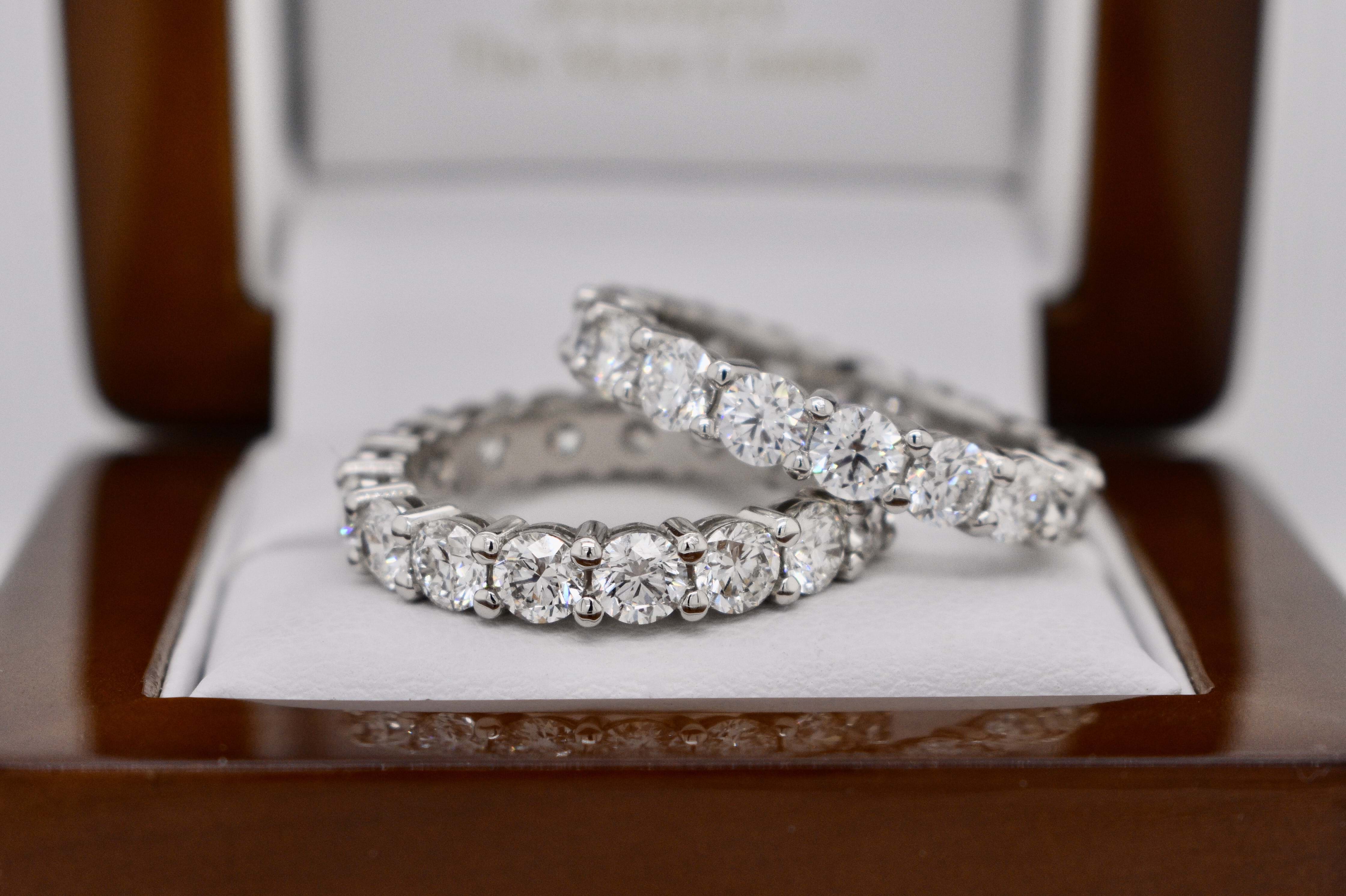 A pair of spectacular full circle diamond eternity bands expertly crafted in platinum with each band featuring 17 scintillating round brilliant cut diamonds totalling 4.09cts D-F/VS in a shared claw setting. Total diamond content in both bands totals an incredible 8.18cts! Independent Valuations Supplied.