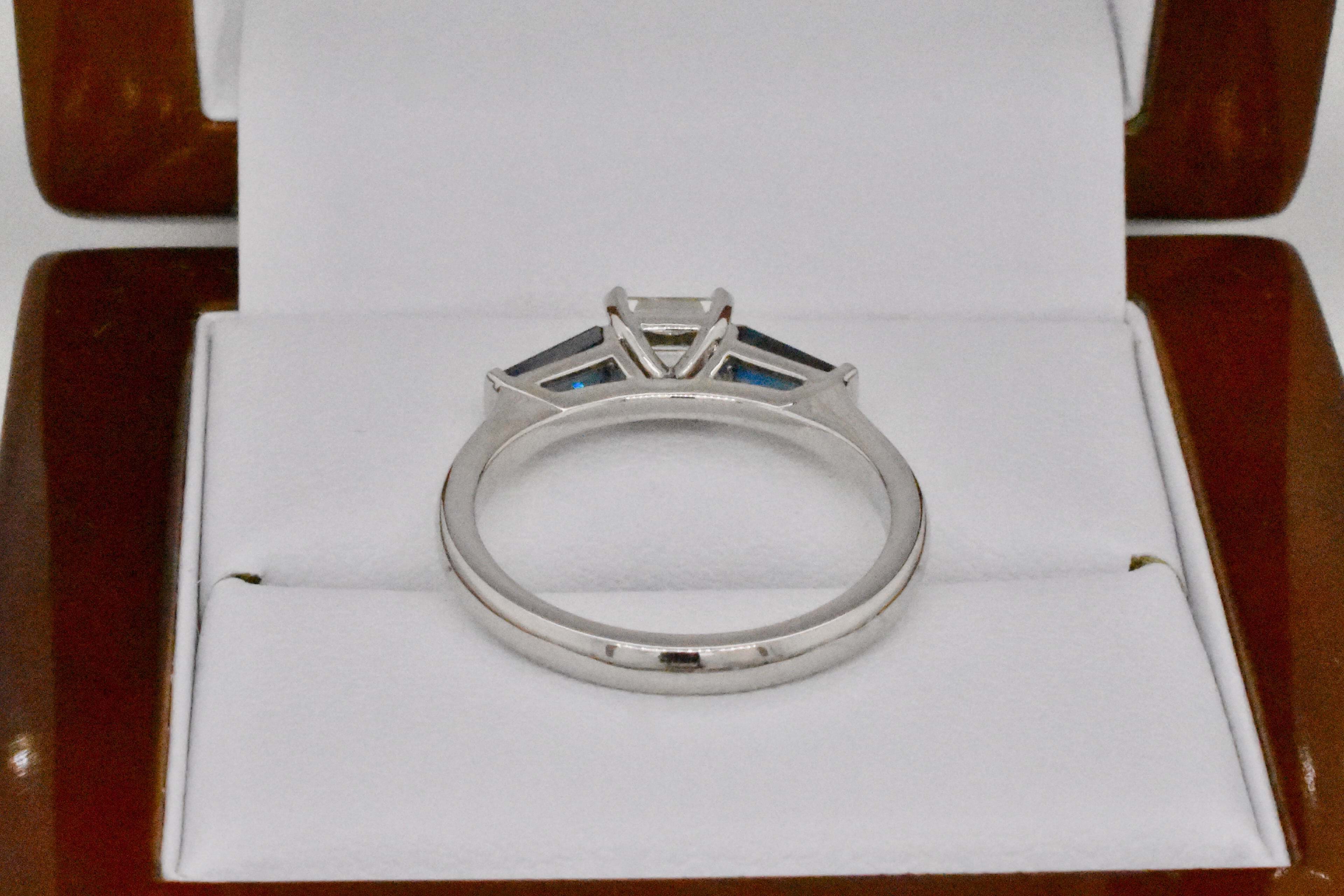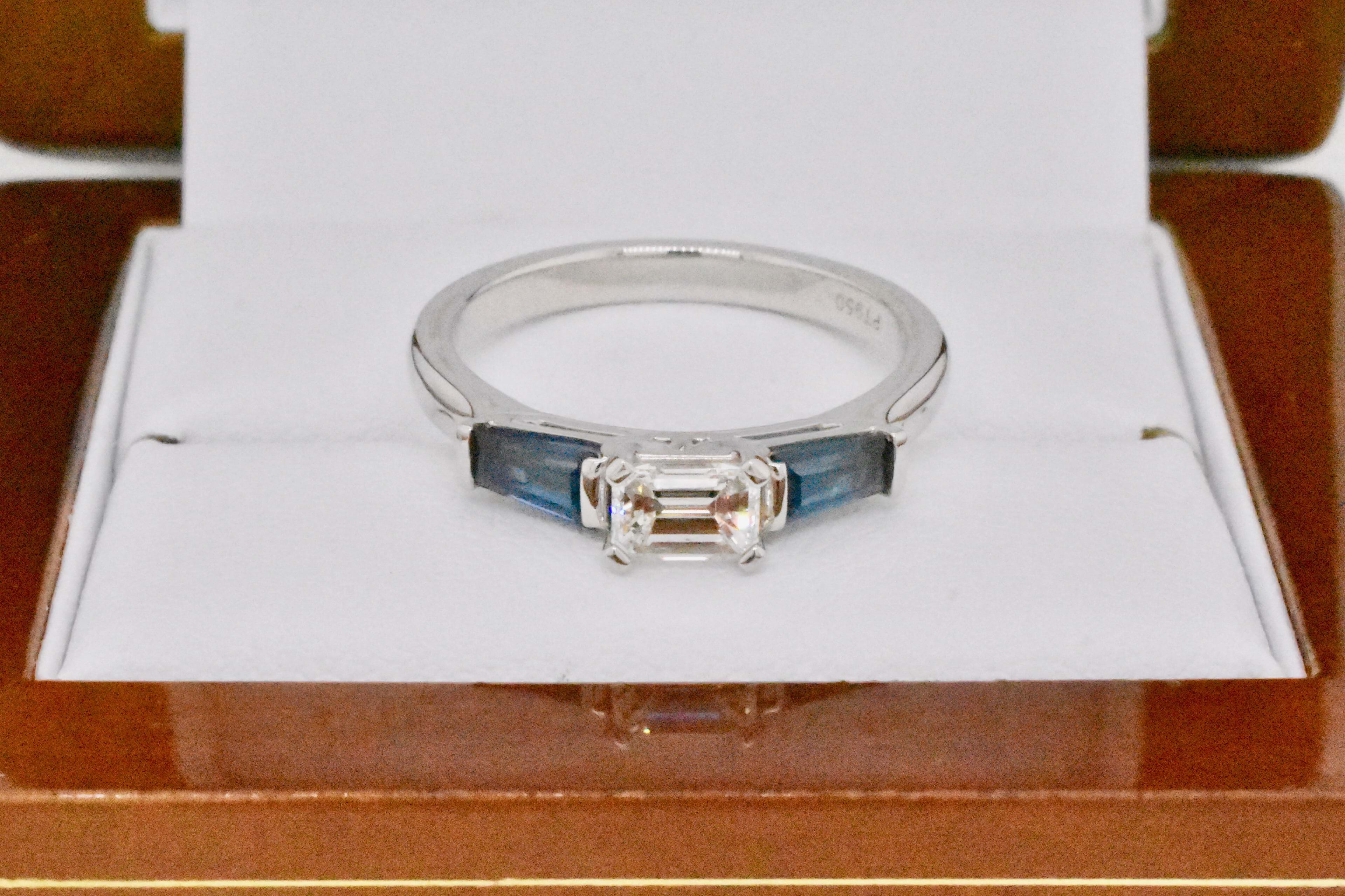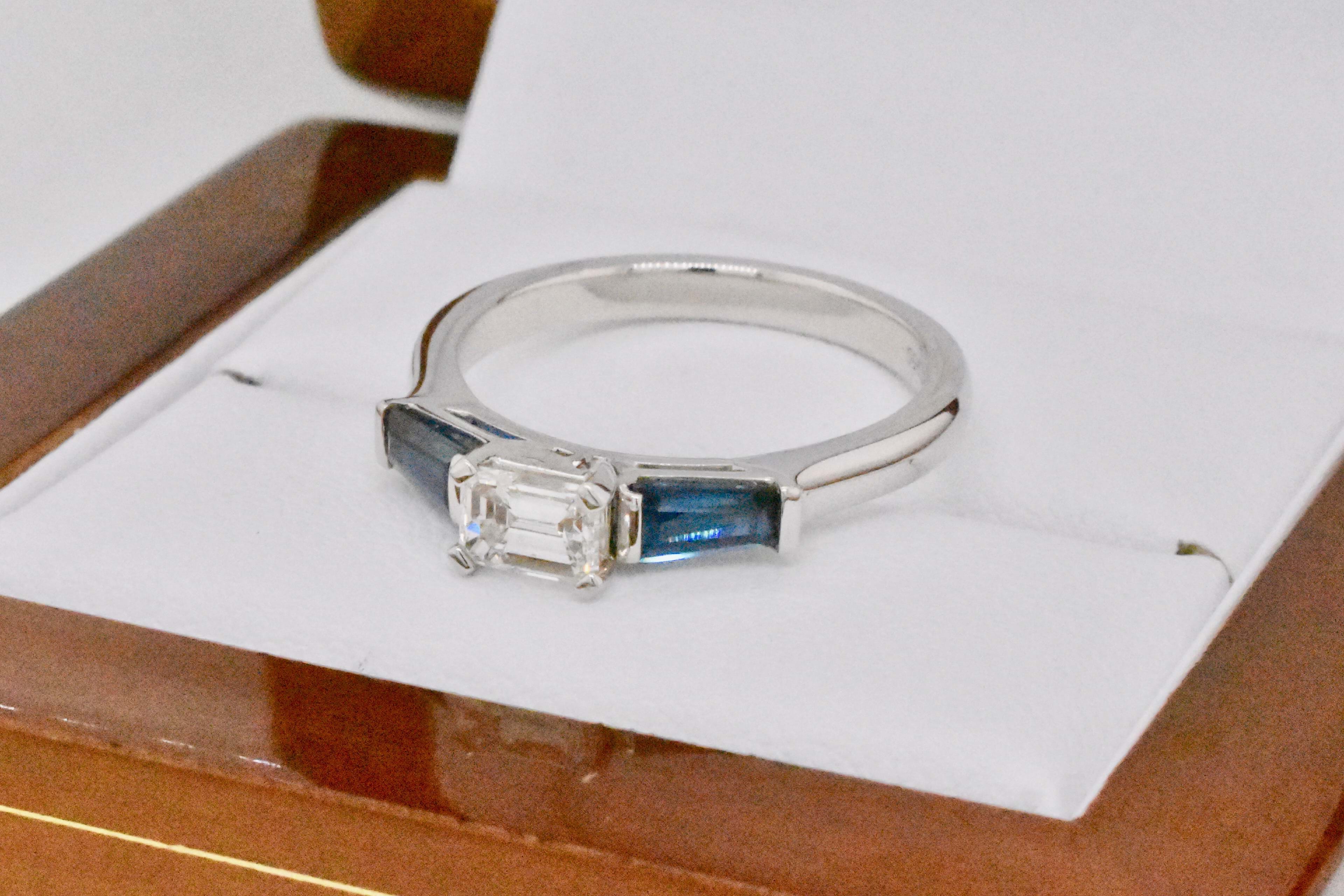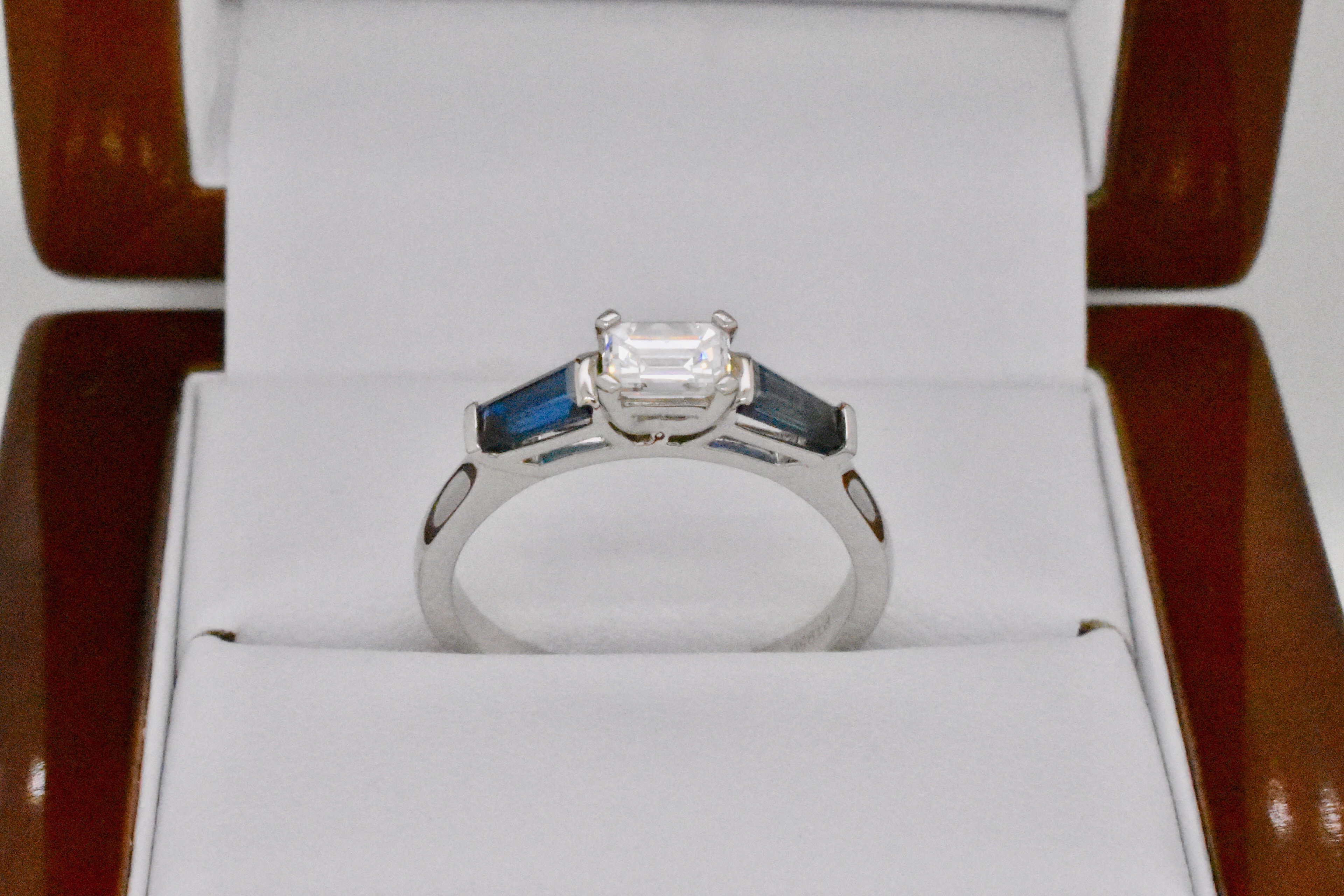 Inspired by Art Deco designs this beautiful engagement ring was expertly crafted in platinum with each stone hand picked in store to create a symmetrical look, and showcase the centre stone. The central emerald cut diamond is 0.53cts with the two tapered baguette blue sapphires totalling 0.77cts. This ring is designed to sit perfectly with a diamond or plain wedding band.