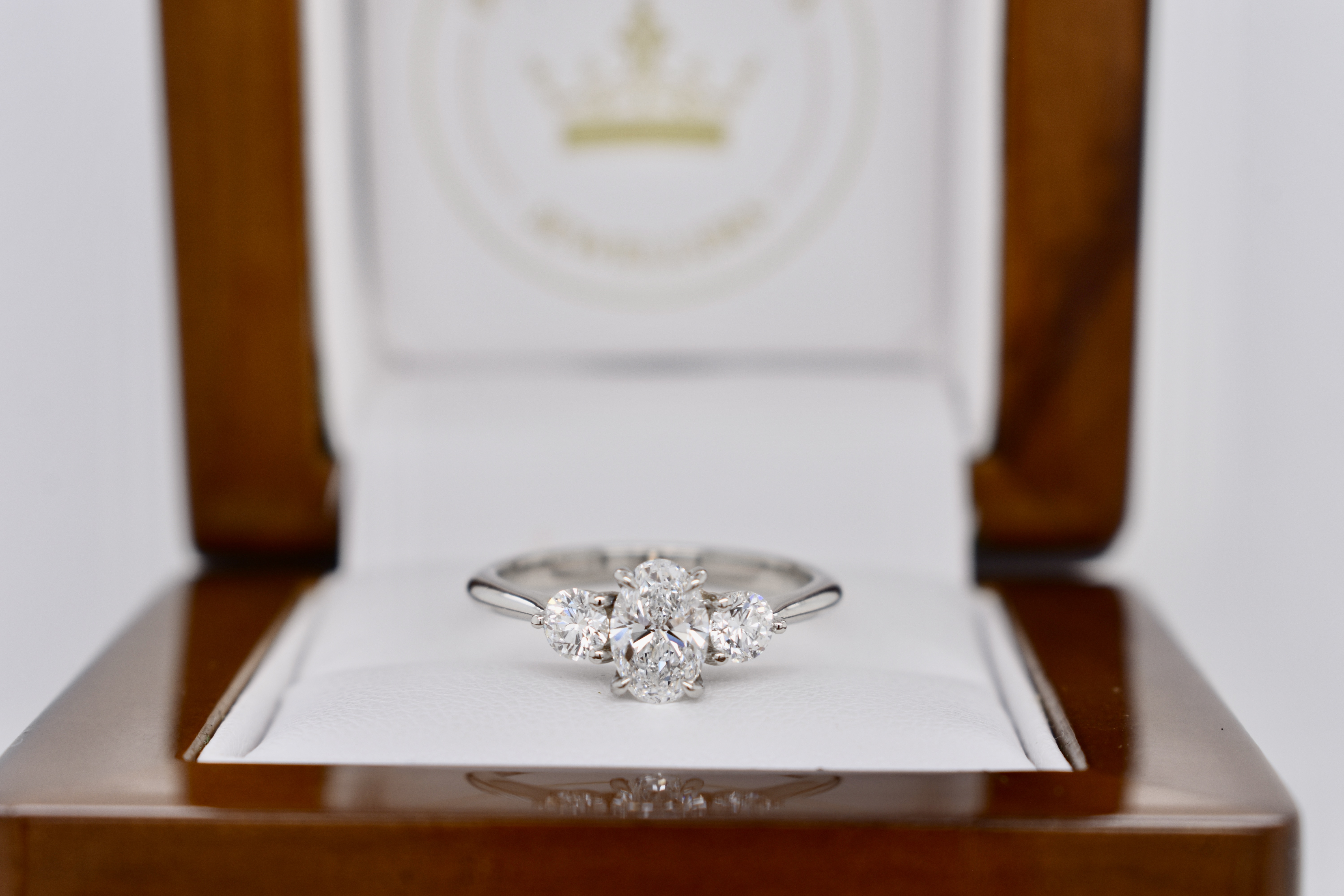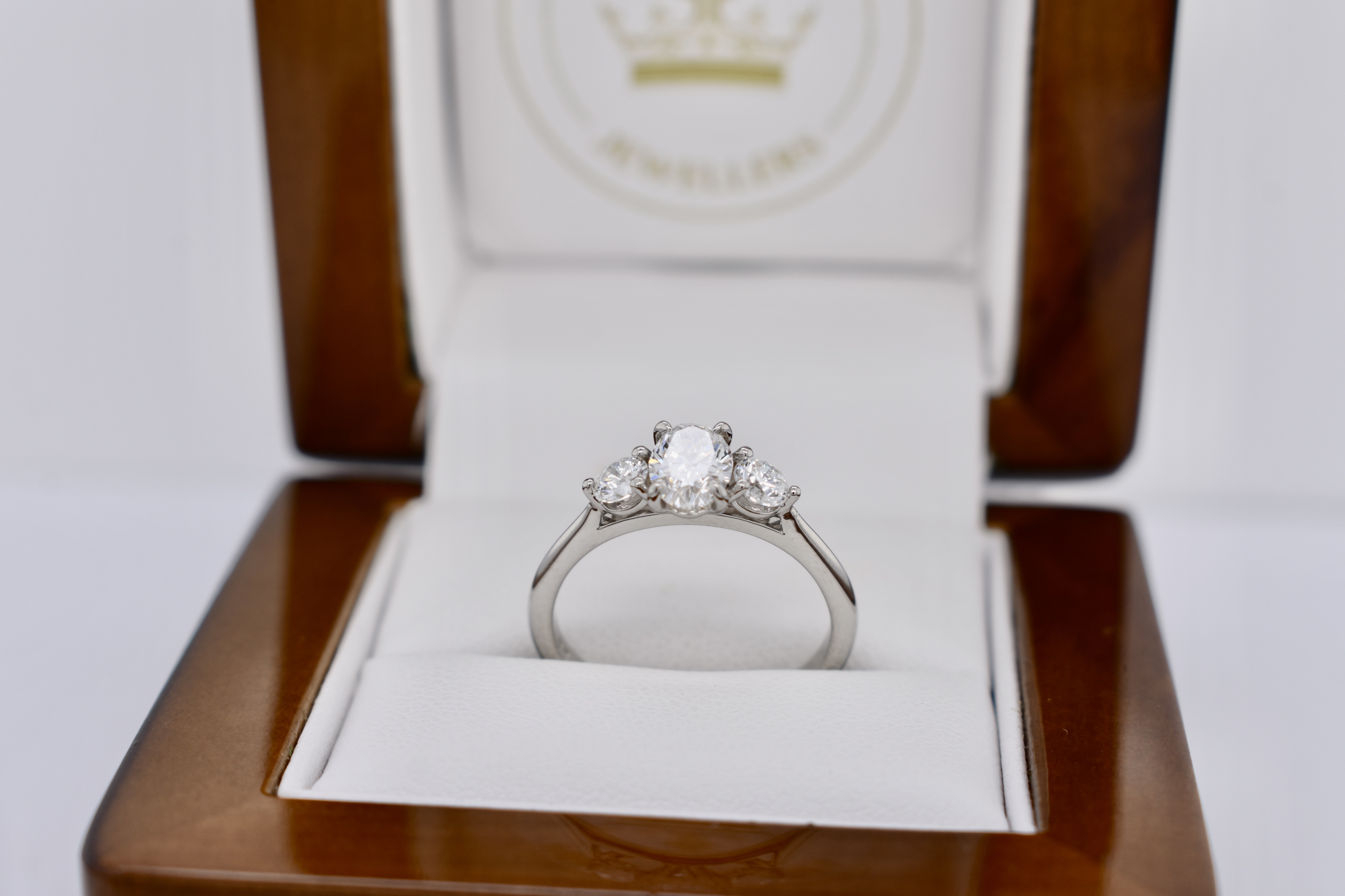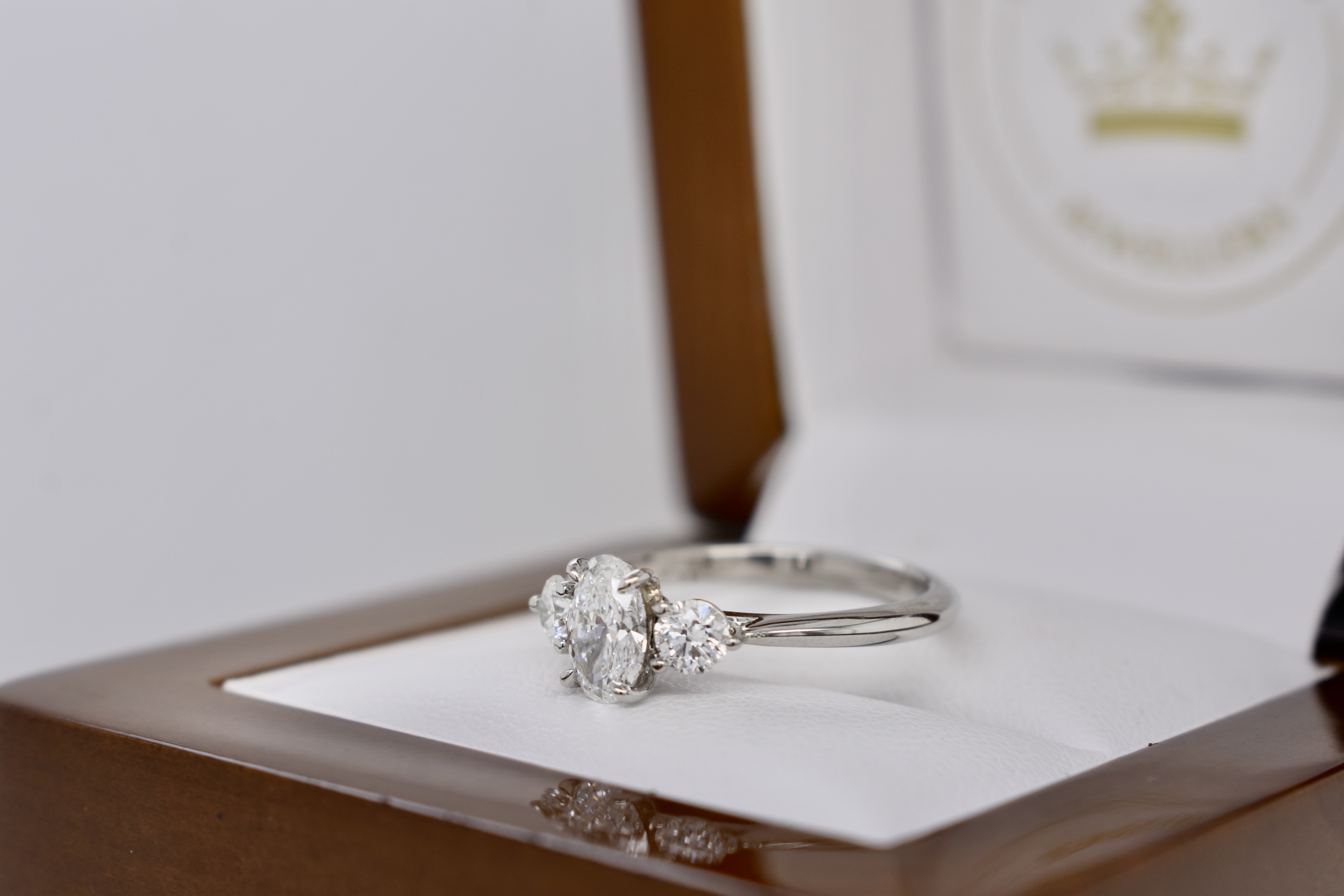 Timeless and elegant engagement ring featuring three scintillating diamonds set into platinum. The centre diamond is a beautiful 0.70ct oval D-colour and is flanked on either side by a shimmering pearshape diamond with a combined weight of 0.36cts. Designed to sit perfectly with wedding bands. Independent Valuation Supplied.