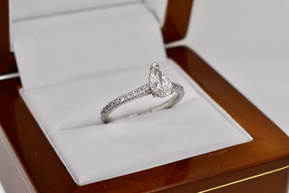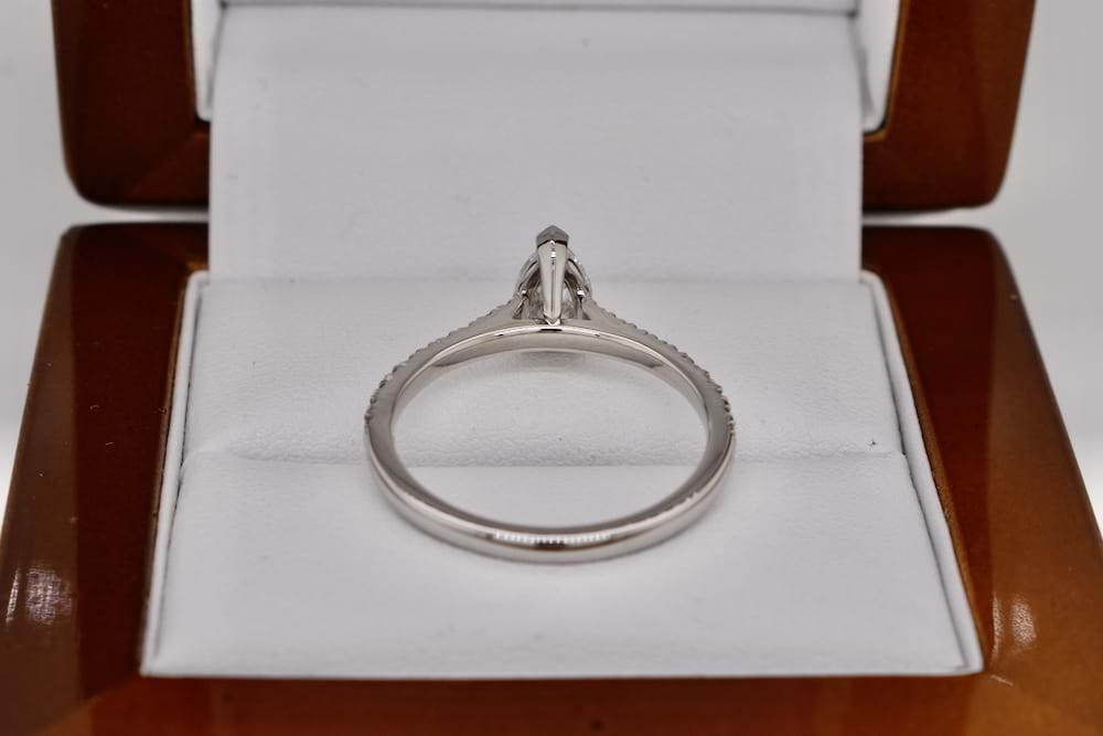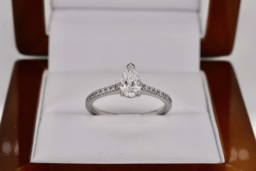 A stunning GIA certified D colour 0.72ct pearshape diamond cap and two claw set into platinum with ten shimmering round brilliant cut diamonds cut down claw set in each shoulder with a combined total of 0.23cts (D-G/SI). This beautiful pearshape diamond was chosen in store and is now the feature of this beautiful engagement ring and story. Independent Valuation & GIA Certificate Supplied.