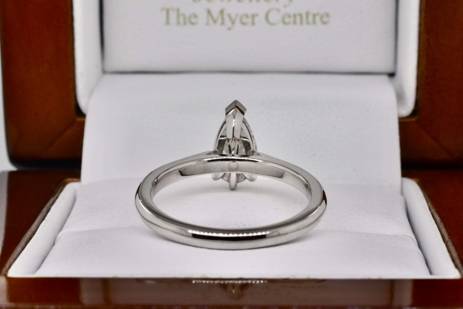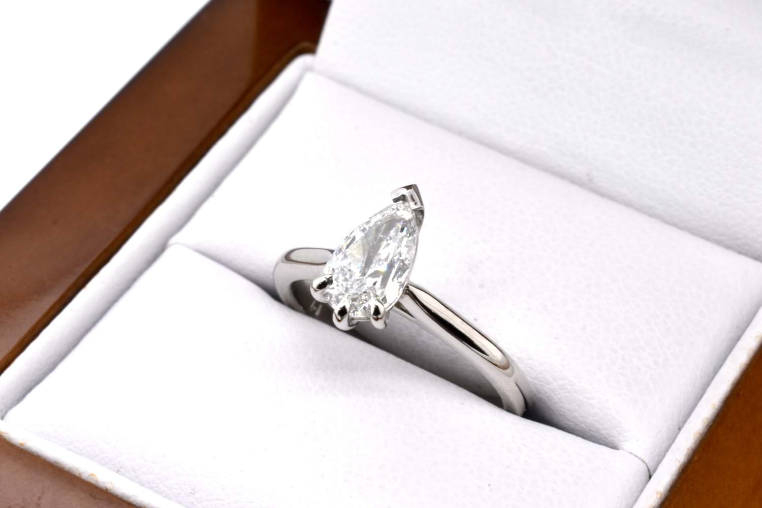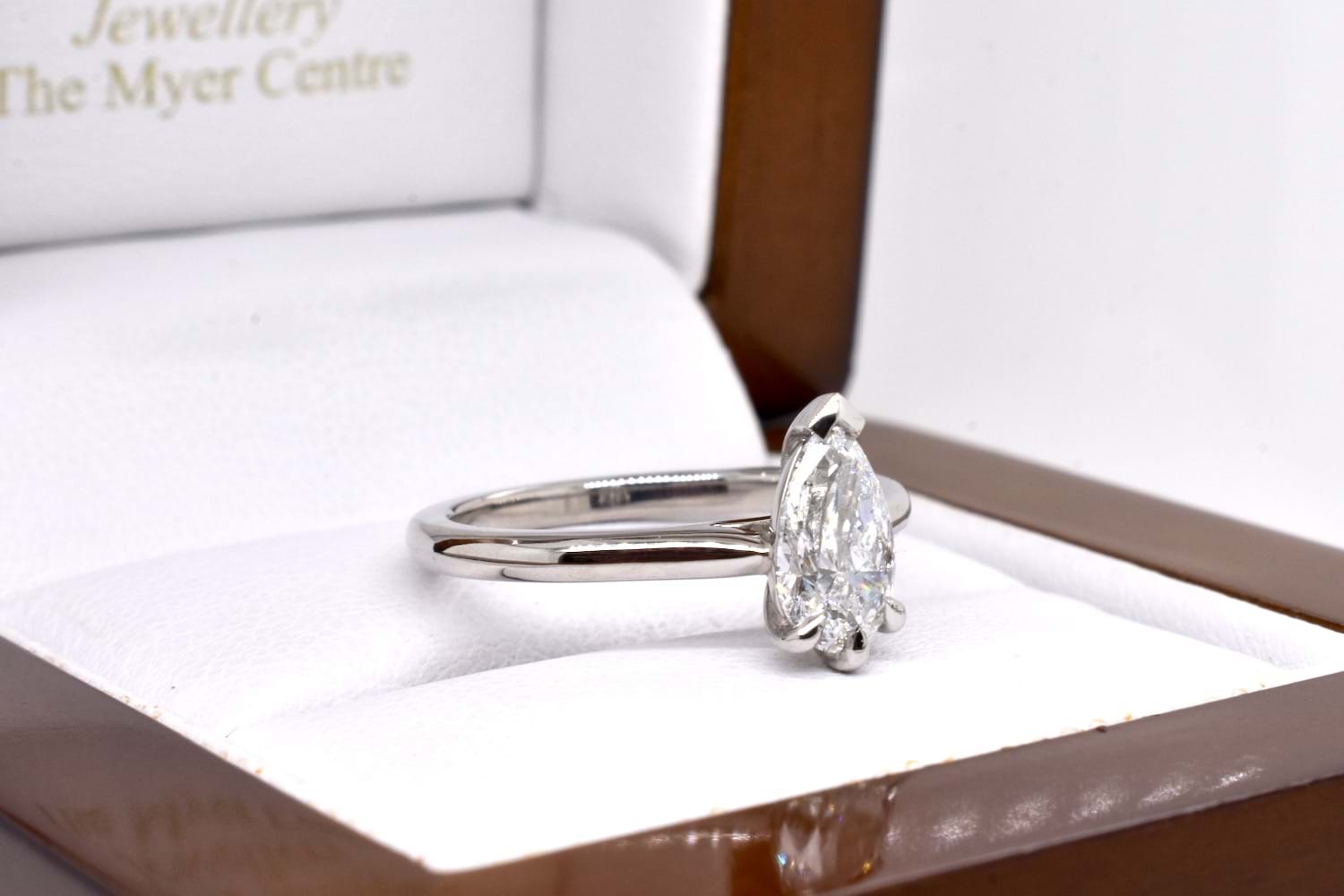 This spectacular D colour pearshape diamond of 0.90cts was selected in store by our client and has been designed into this modern and striking platinum solitaire engagement ring. The diamond is set with a cap and three claws and has a plain platinum band, allowing for any wedding band to sit perfectly in future. GIA Certificate and Independent Valuation Supplied