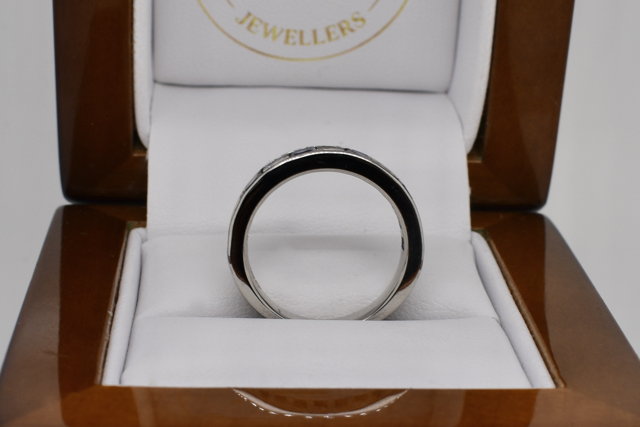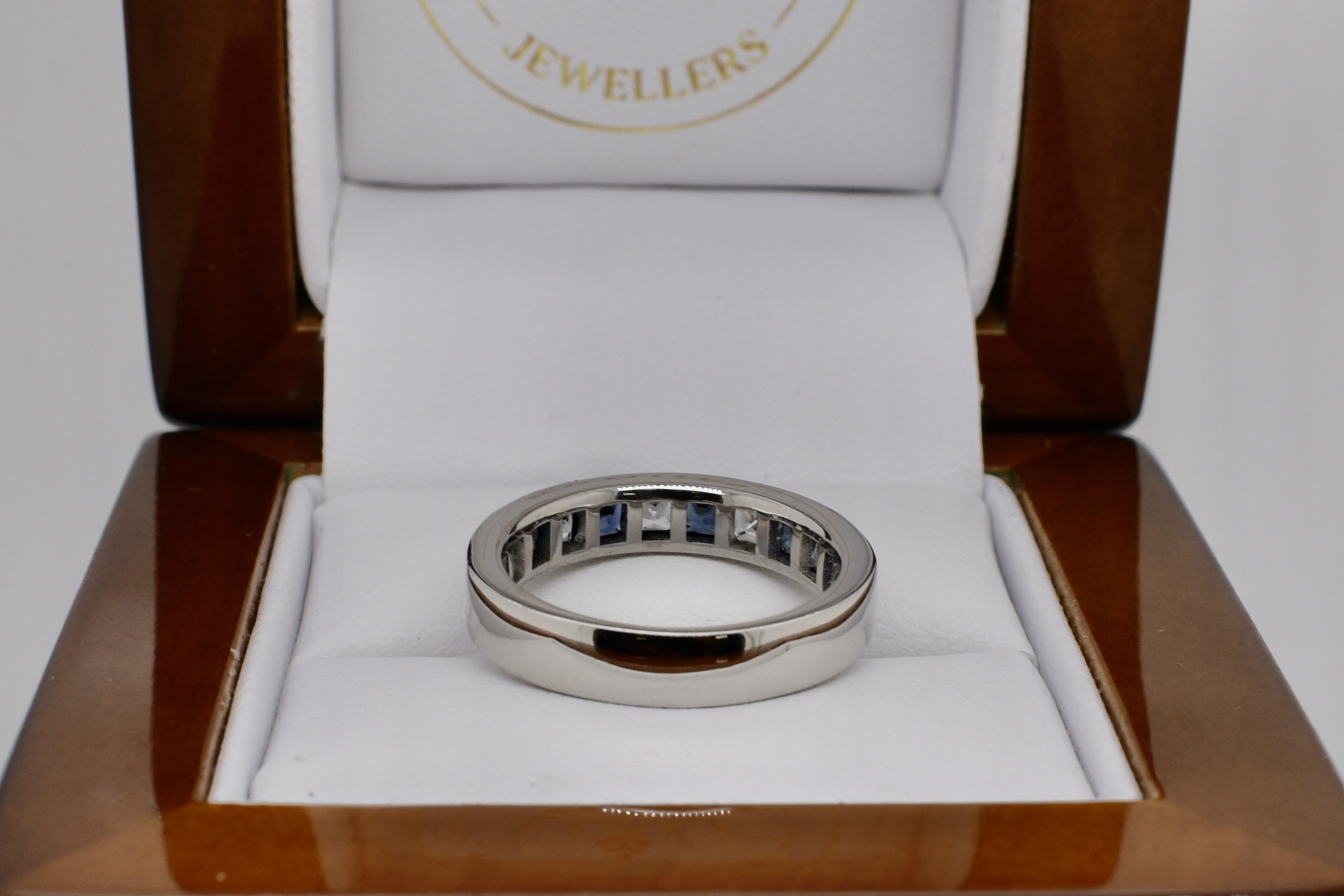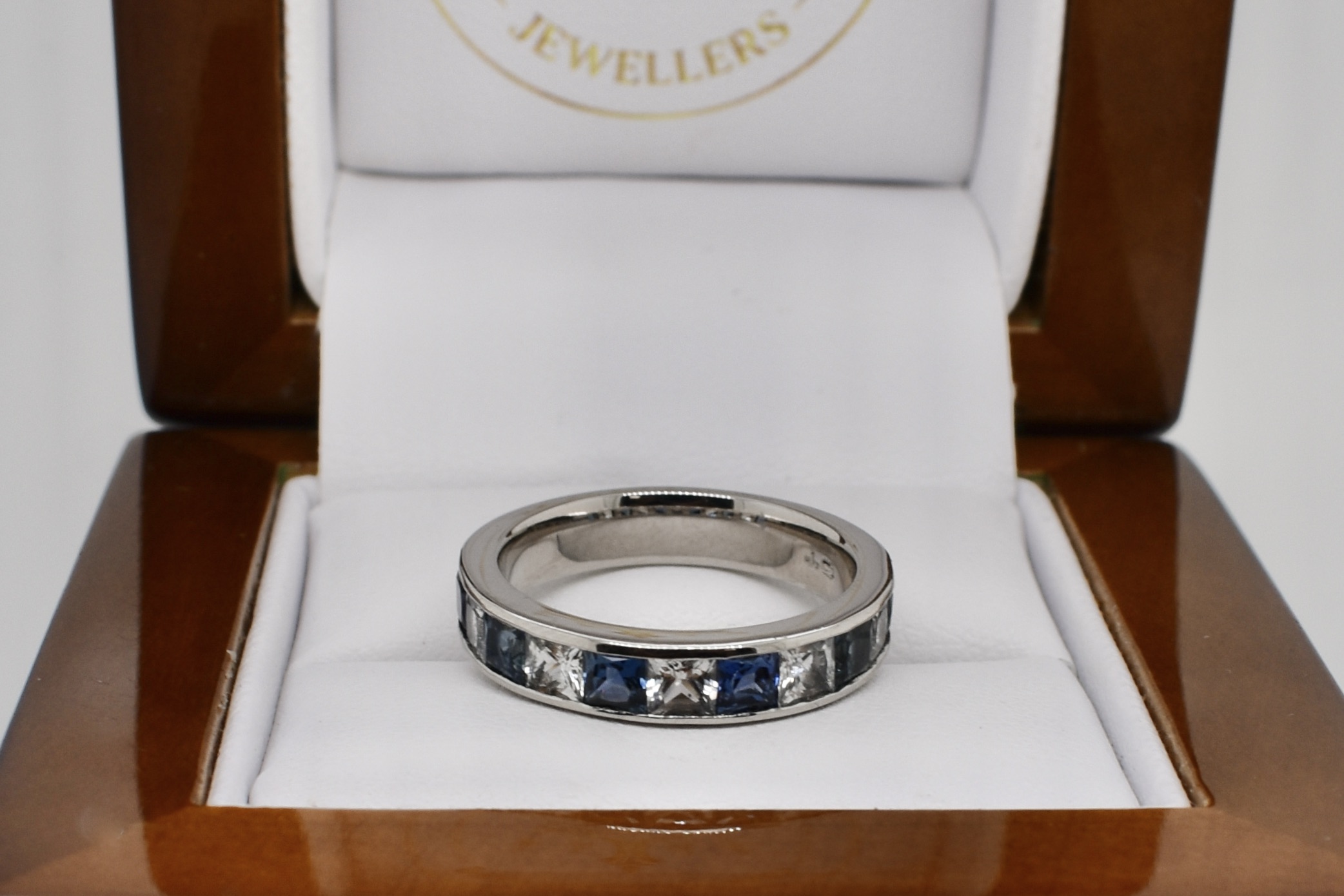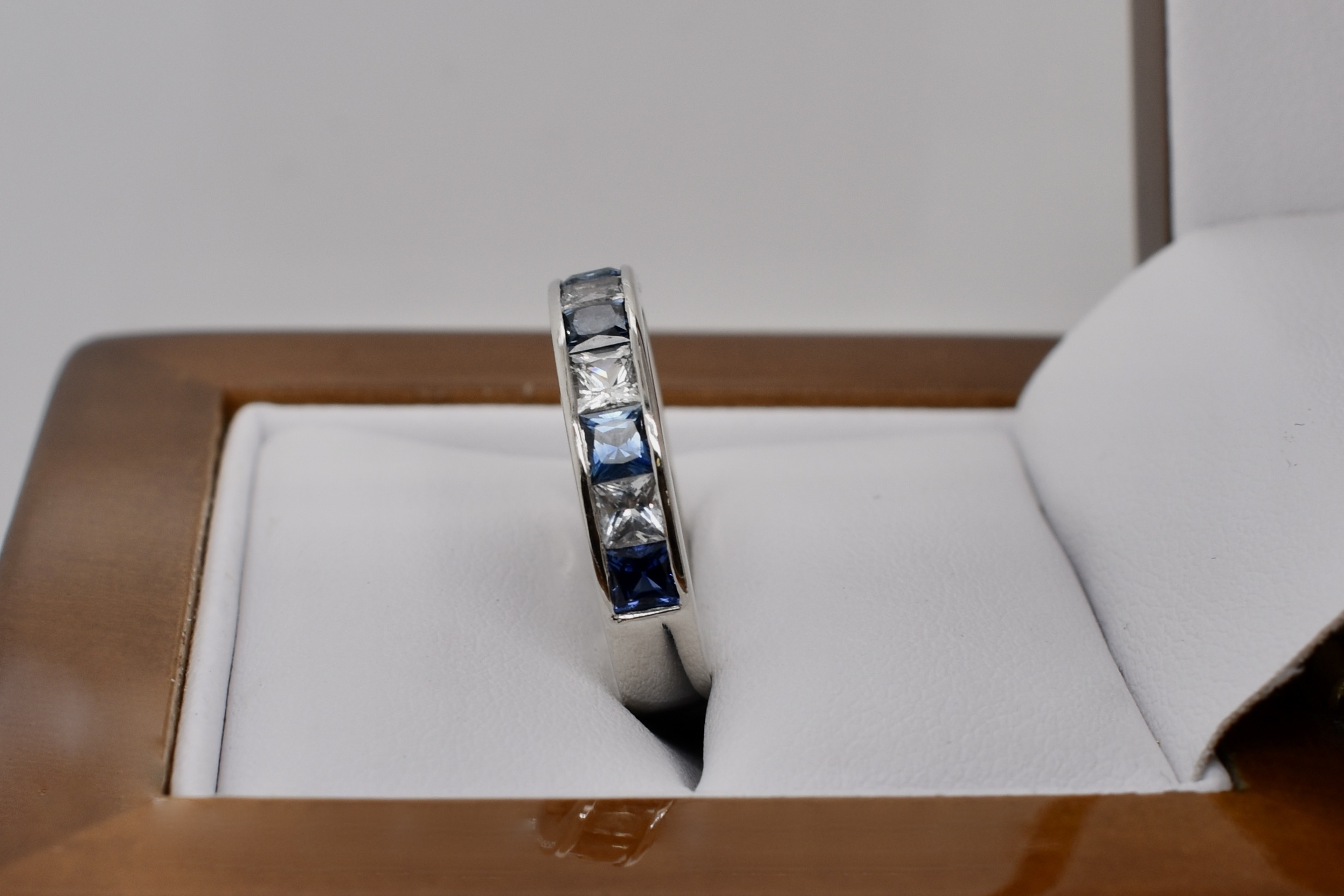 Seeking an alternative to diamonds, this classic channel set band was created for our client using white princess cut sapphires and blue princess cut sapphires. Crafted in platinum the six blue sapphires equal 1.11ct and the white equal 0.94ct. Independent Valuation Supplied.