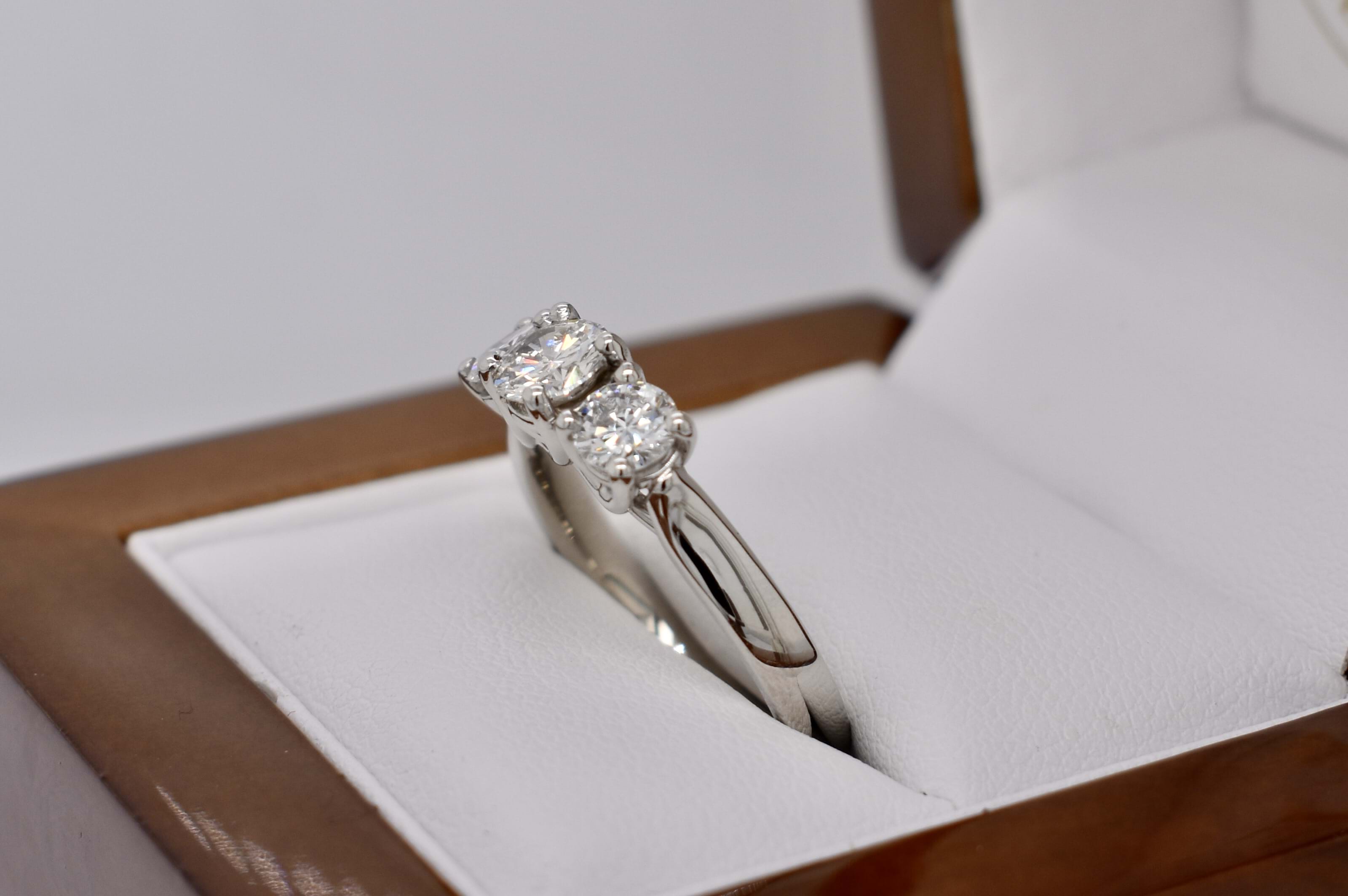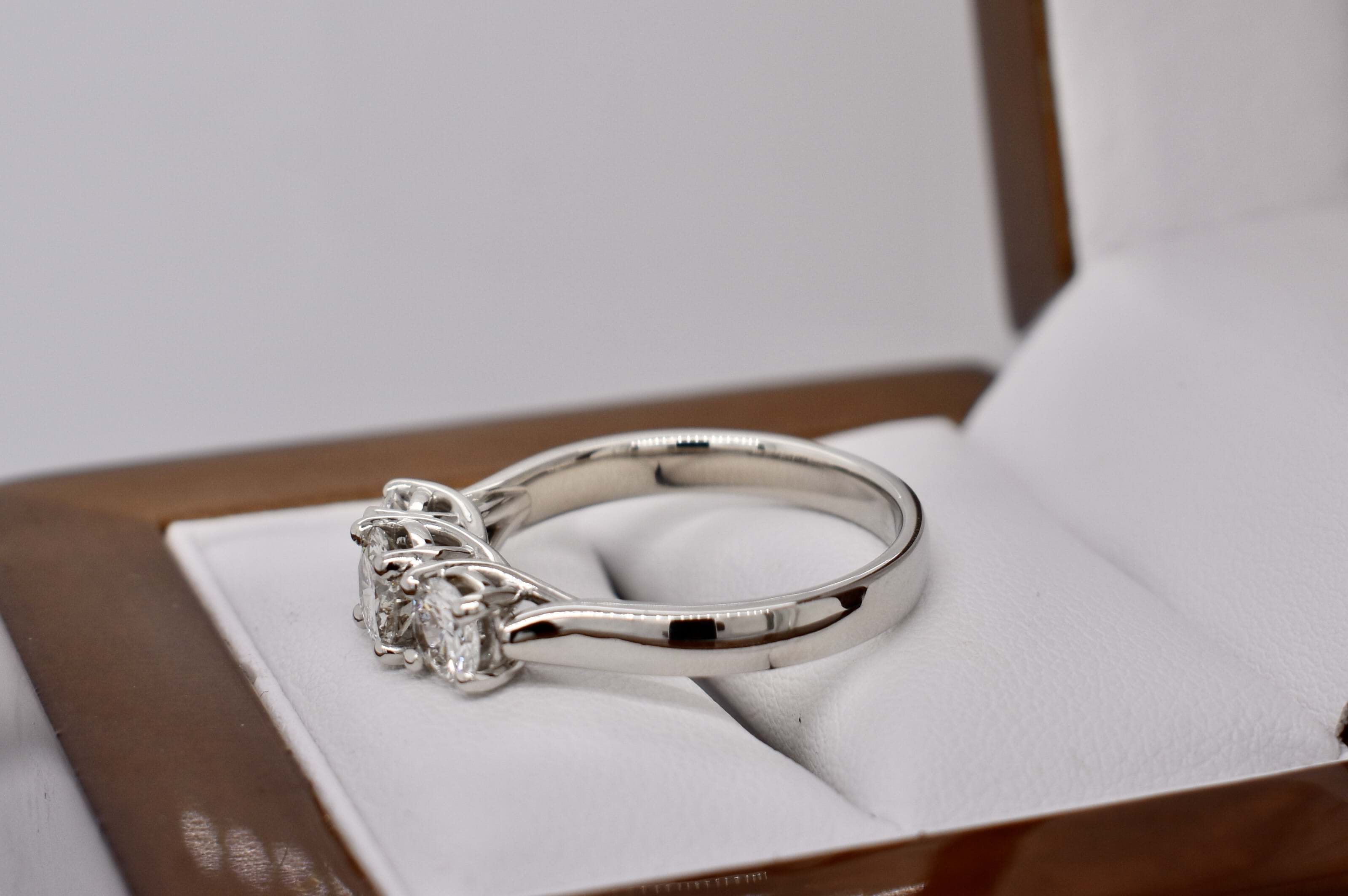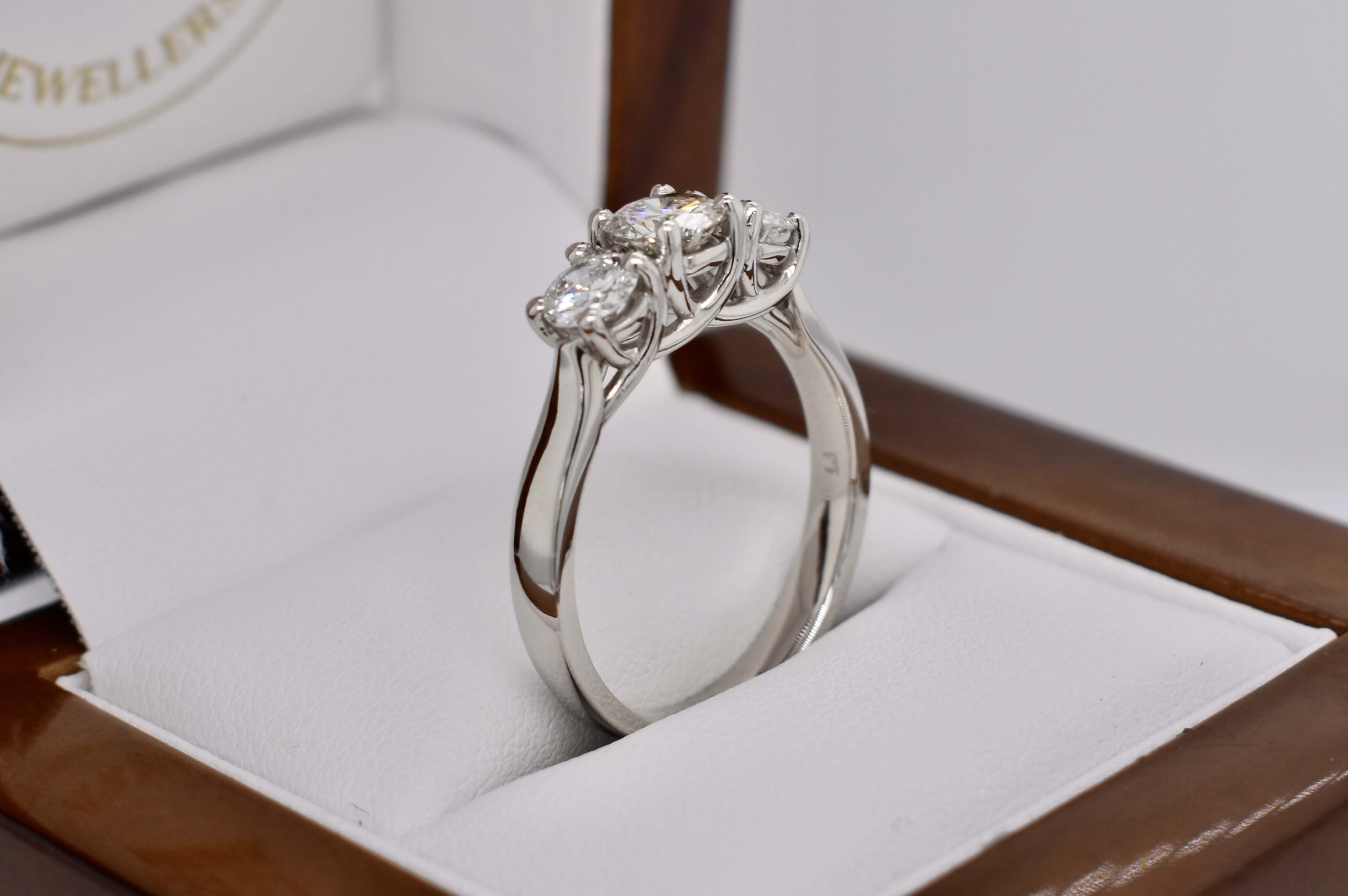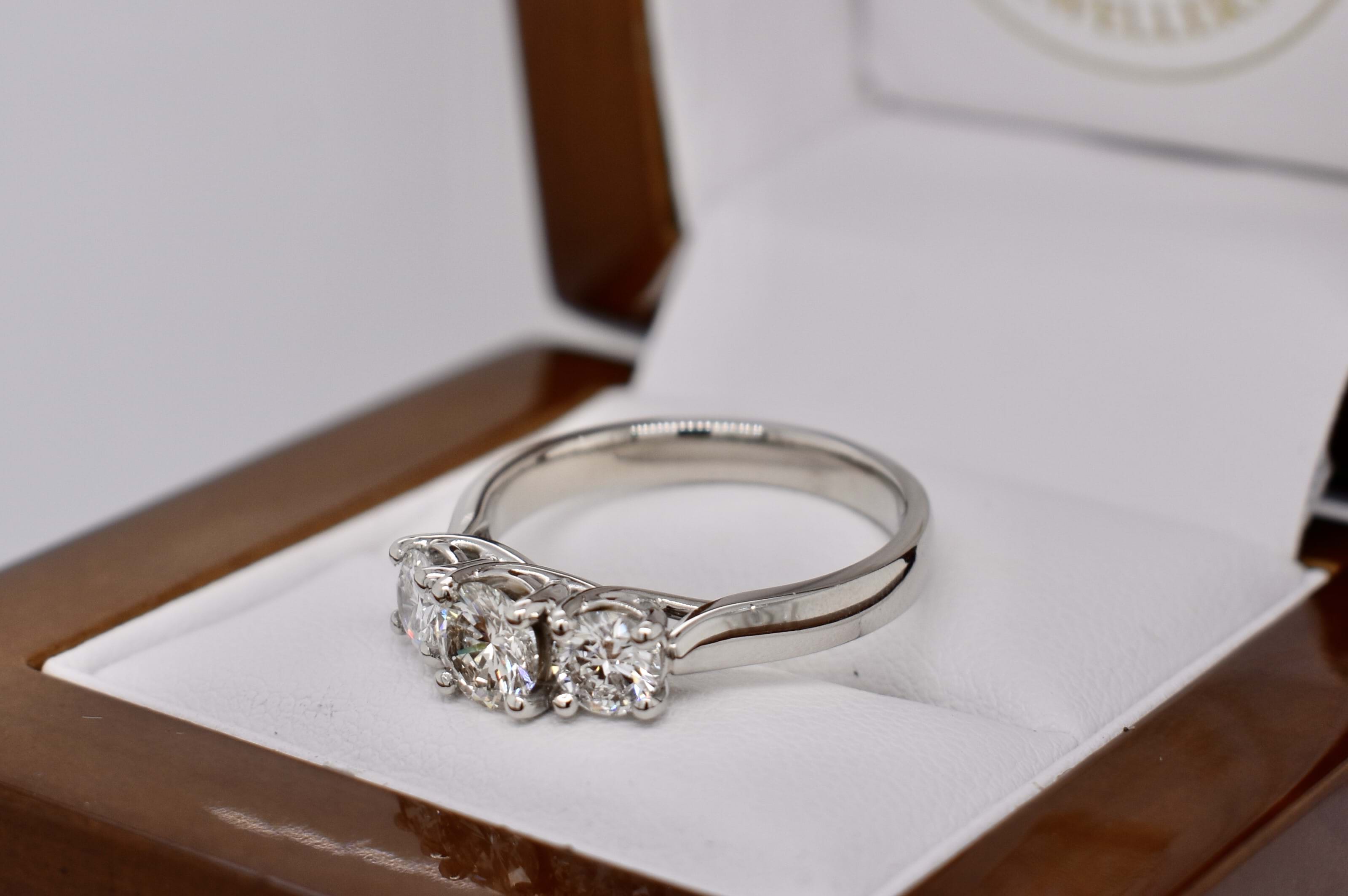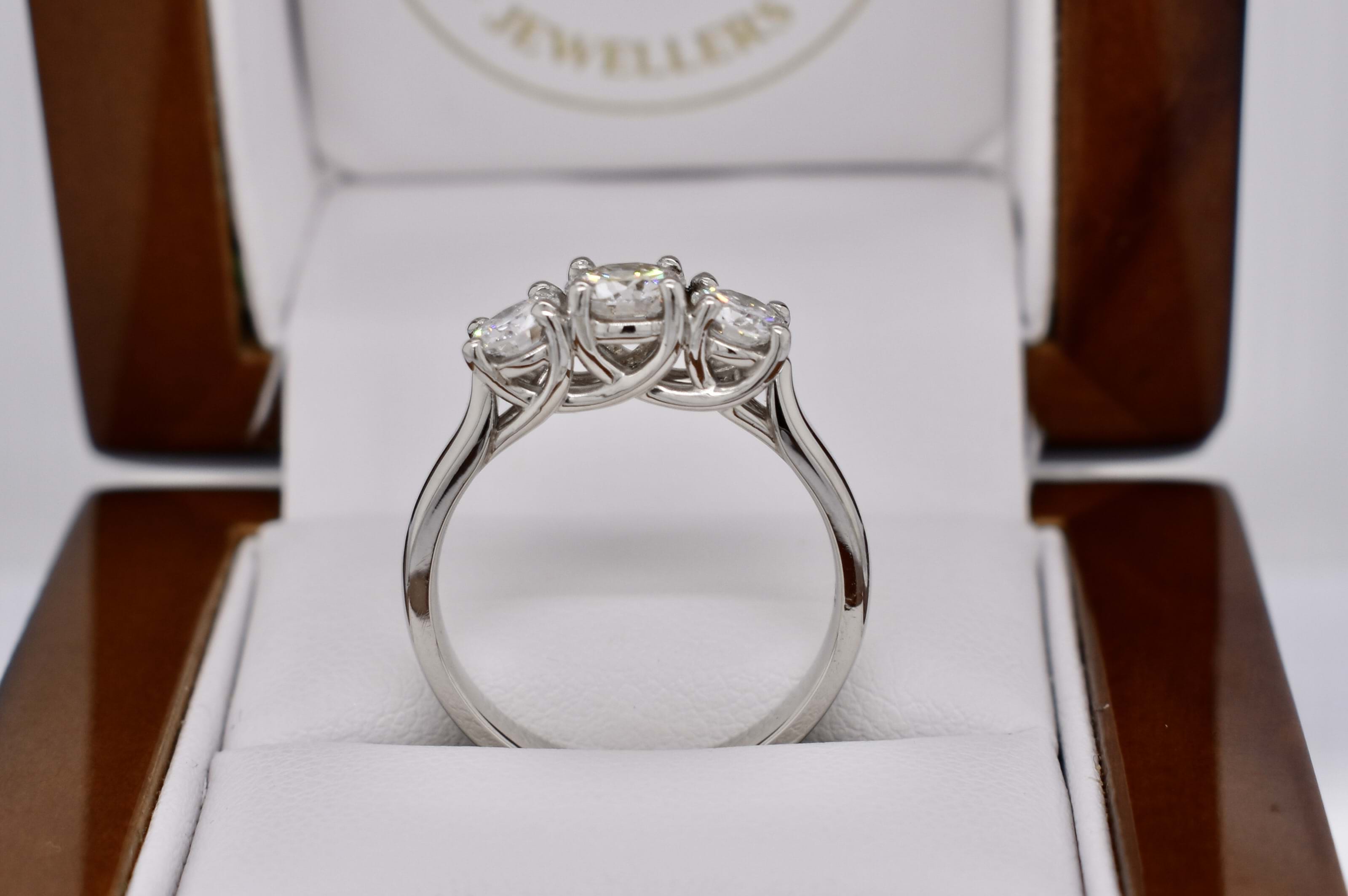 Recycling and reviving old, unworn jewellery and gemstones for our clients is one of our specialties. This timeless and classic trilogy ring was expertly crafted in our workshop in platinum and contains three round brilliant cut diamonds that were all salvaged from our clients existing, unworn, jewellery collection. Independent Valuation Supplied.