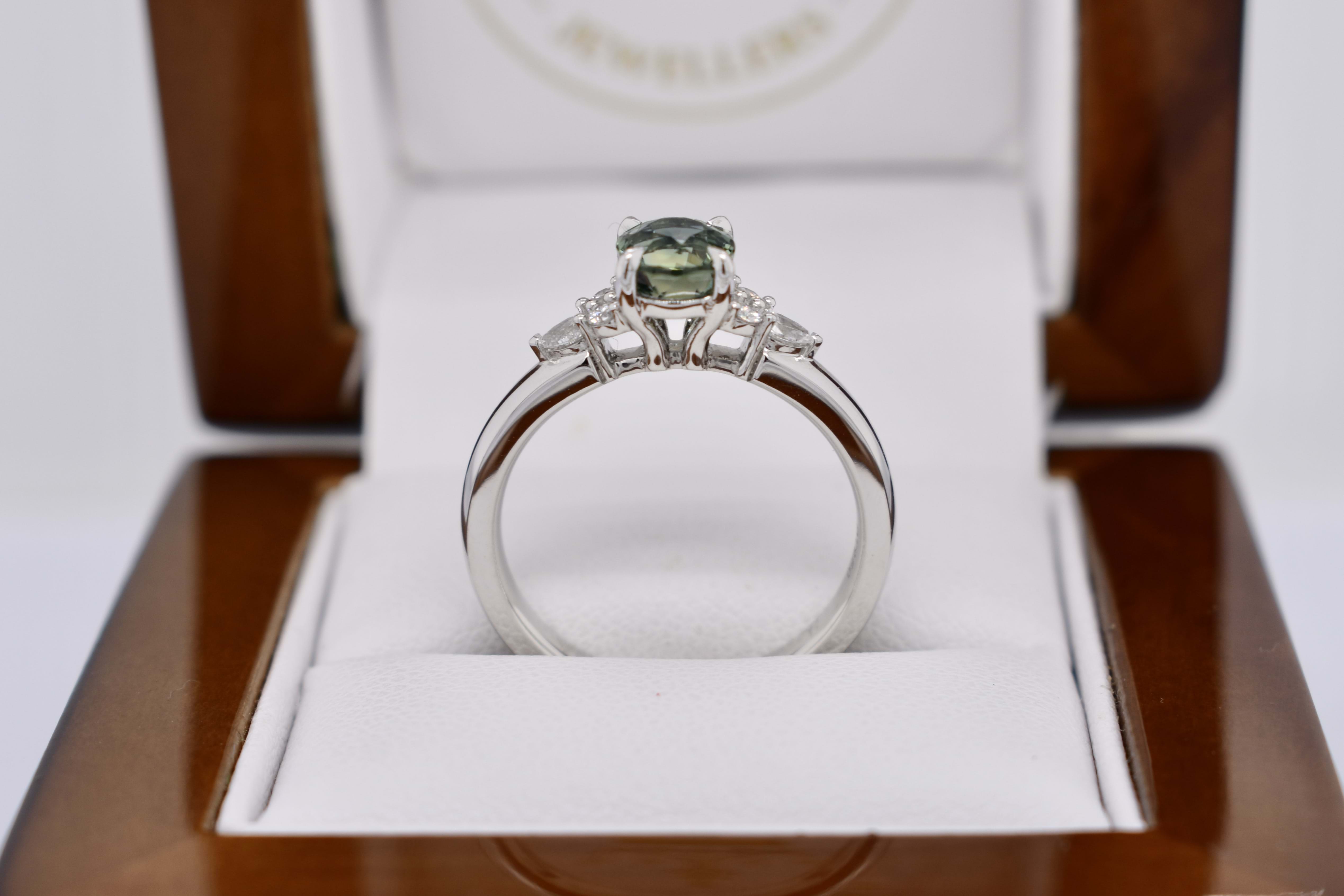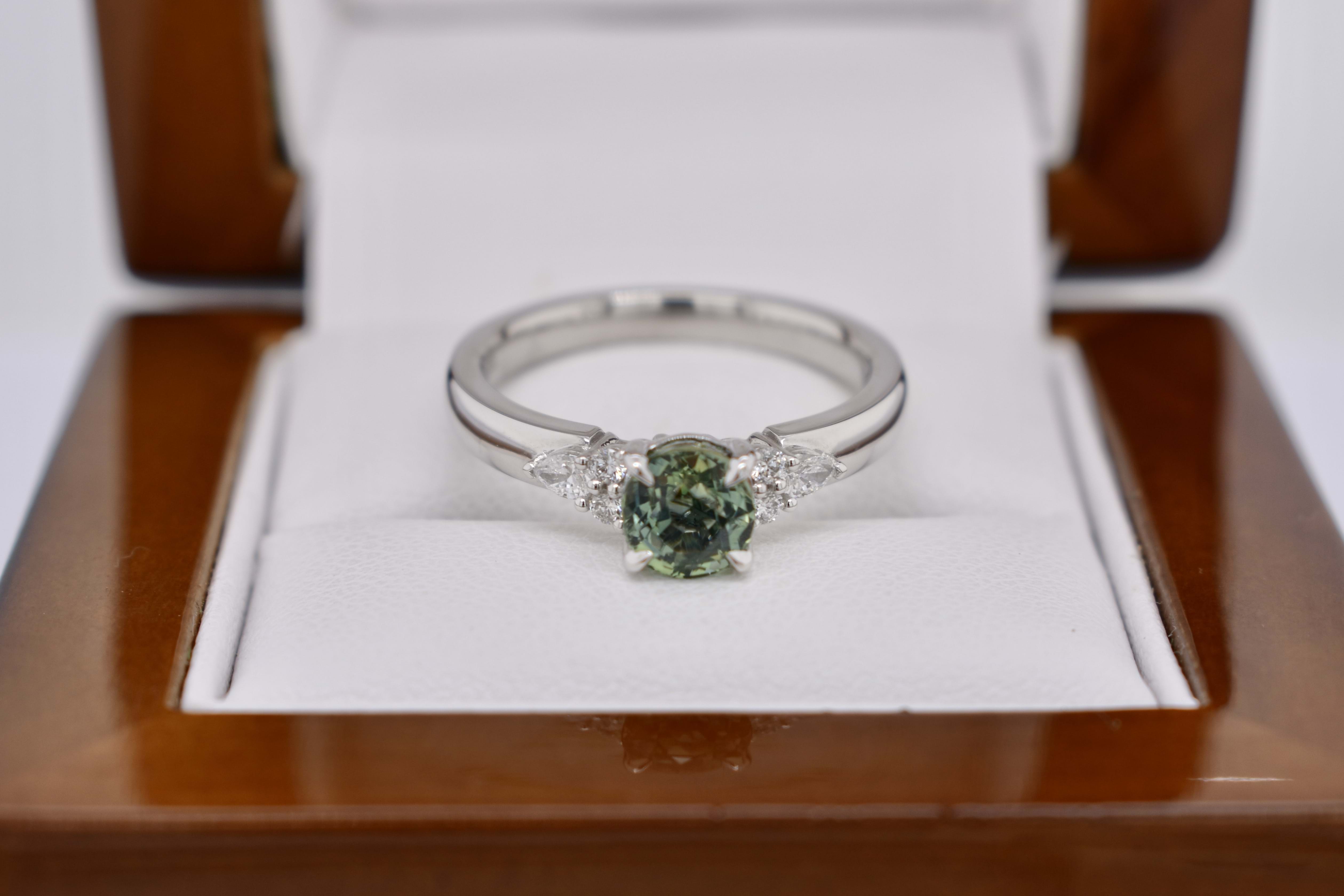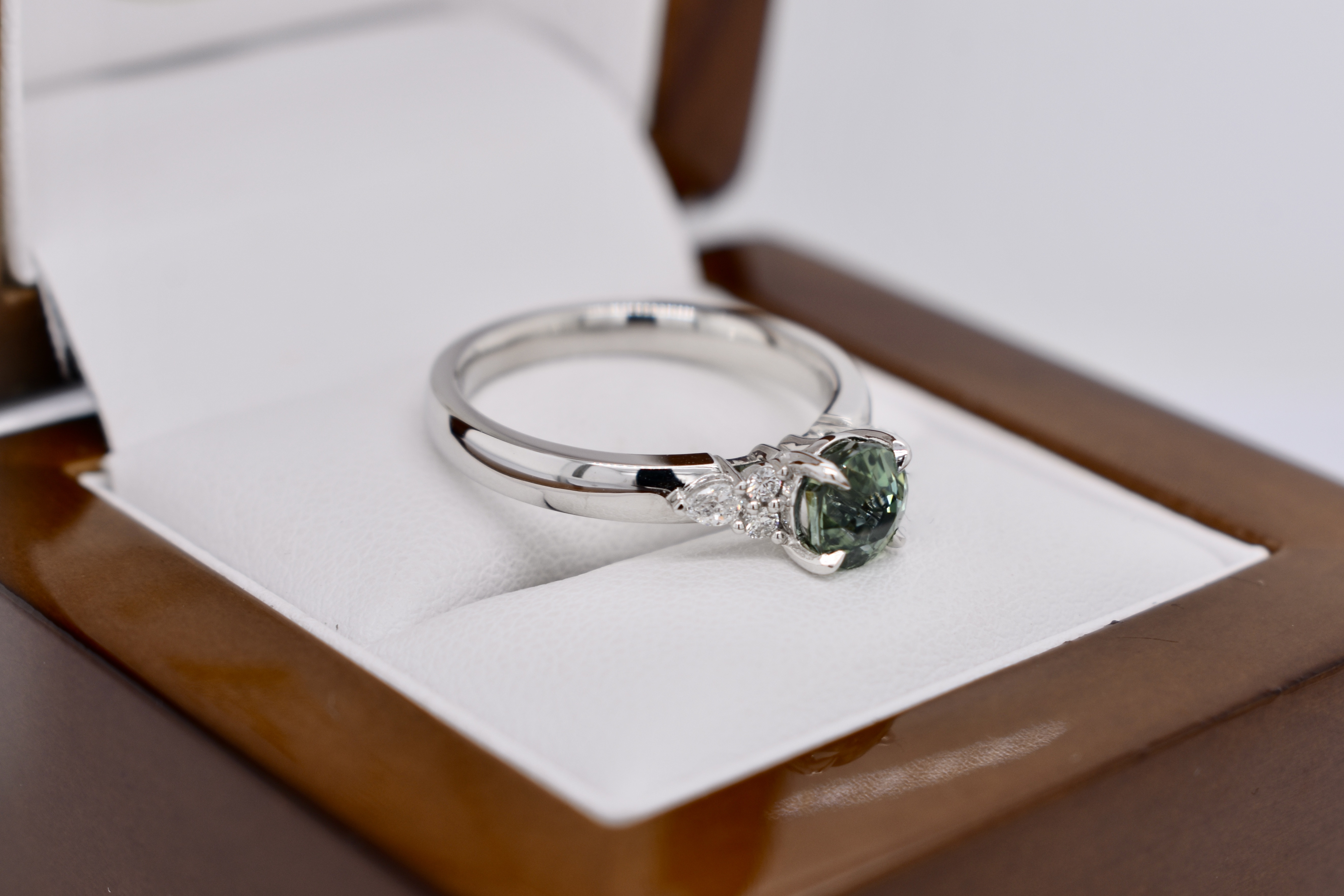 A beautiful engagement ring featuring a gorgeous 1.41ct Australian teal sapphire hand chosen in store by our client and designed alongside our design consultants into this timeless platinum ring. The ring has an accent of two shimmering round diamonds on each side and a pearshape diamond, and has been designed to sit perfectly with wedding bands. Total diamond content equals 0.19ct FG/VS-SI. Independent Valuation Supplied.