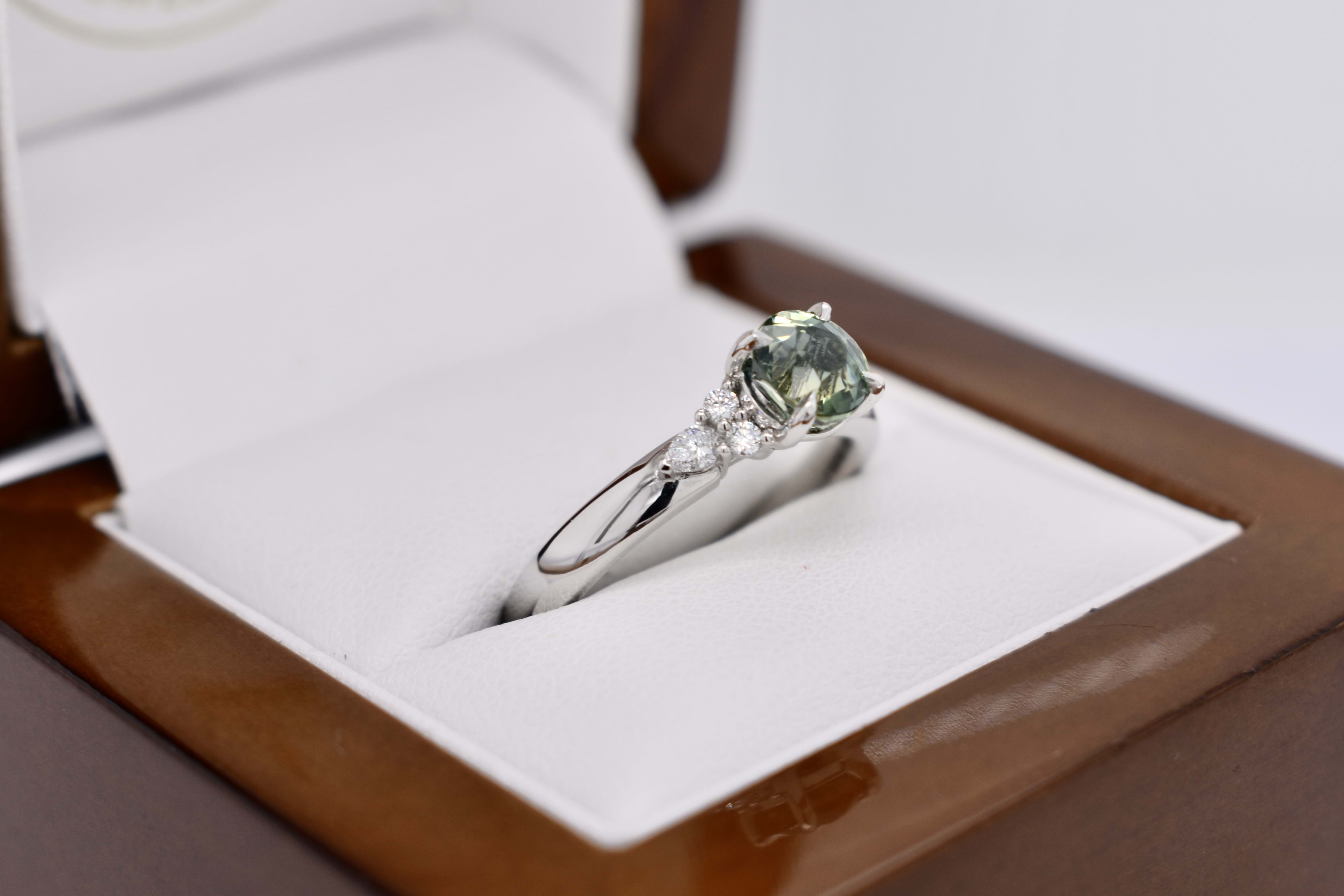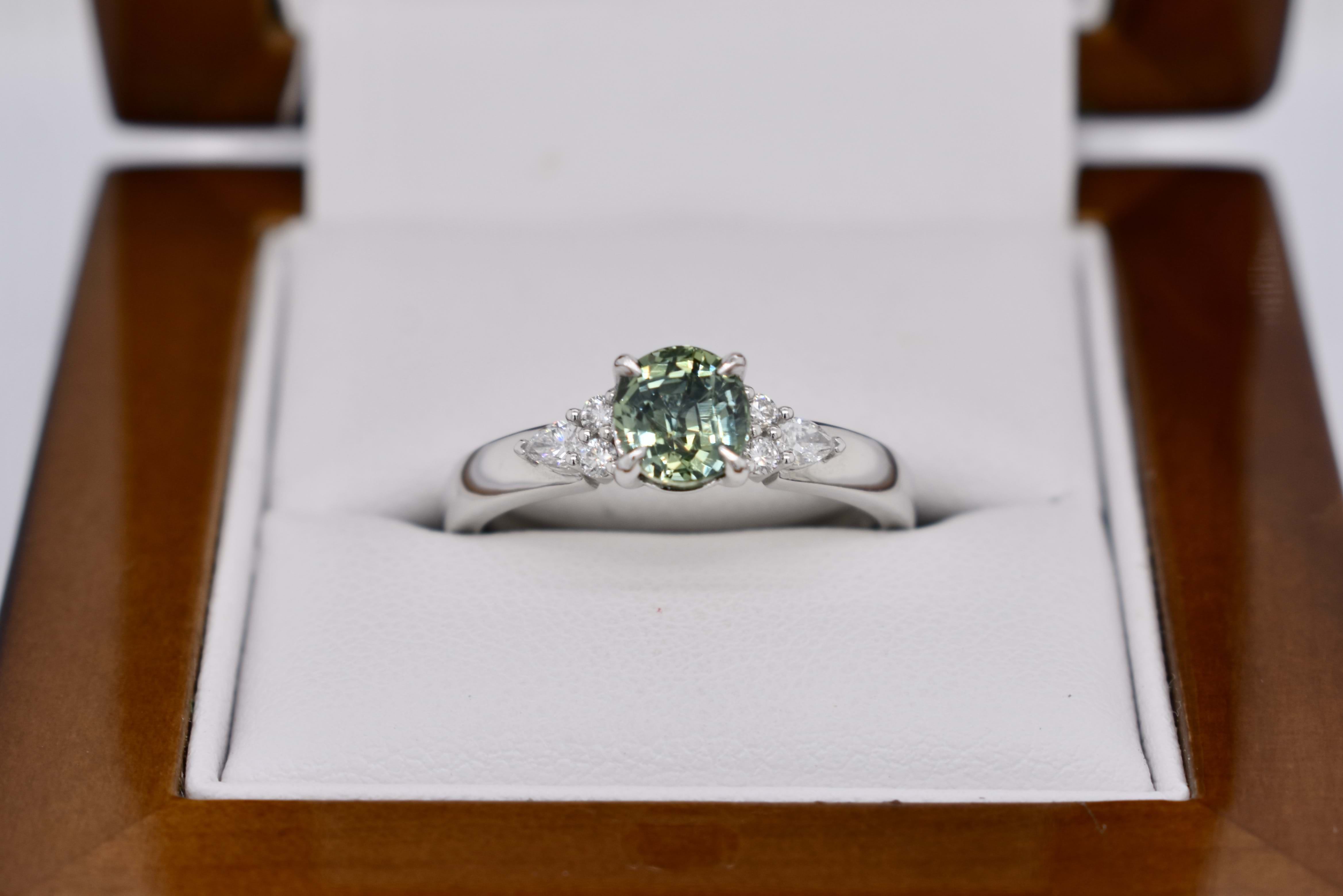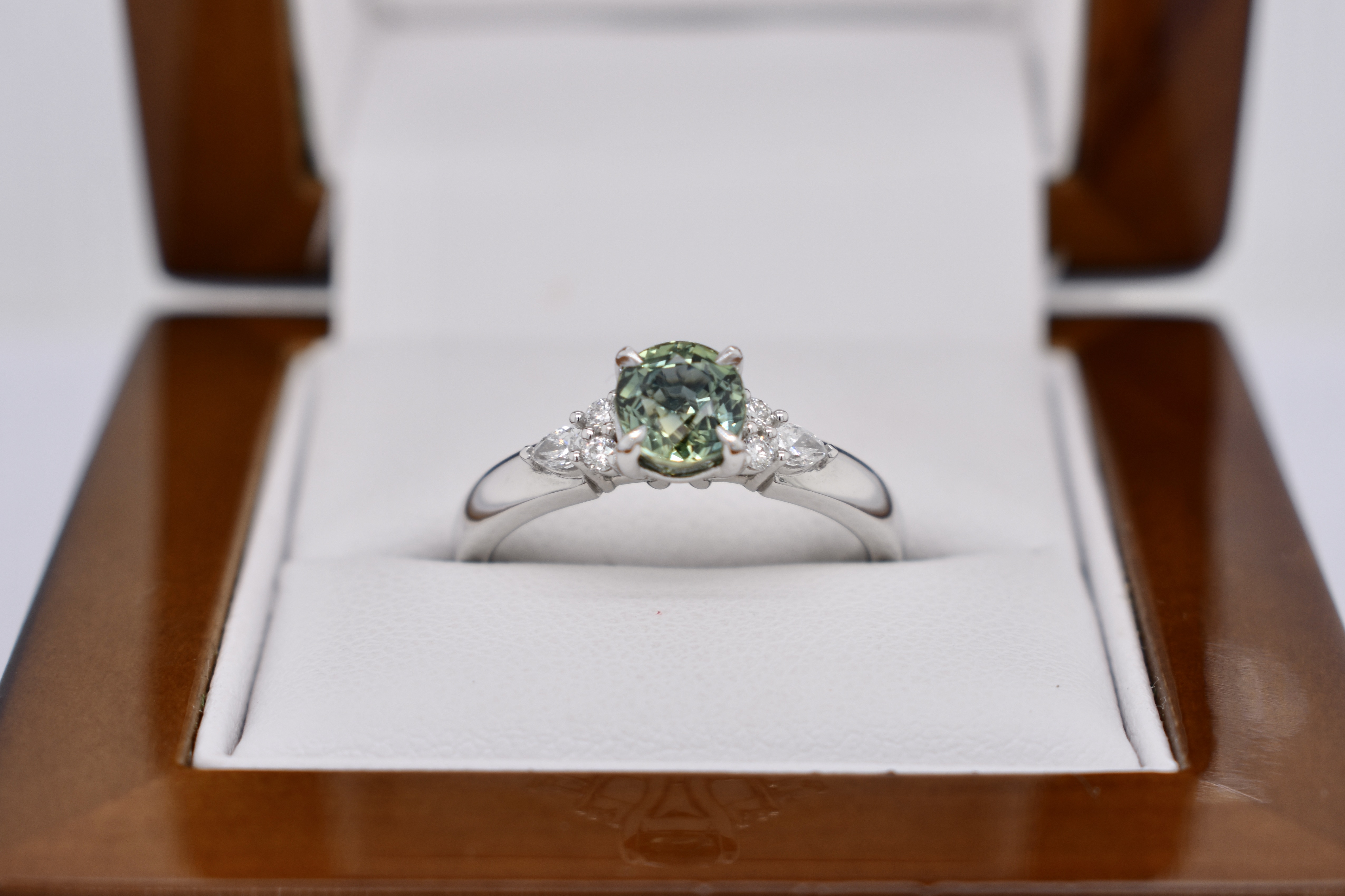 A beautiful engagement ring featuring a gorgeous 1.41ct Australian teal sapphire hand chosen in store by our client and designed alongside our design consultants into this timeless platinum ring. The ring has an accent of two shimmering round diamonds on each side and a pearshape diamond, and has been designed to sit perfectly with wedding bands. Total diamond content equals 0.19ct FG/VS-SI. Independent Valuation Supplied.