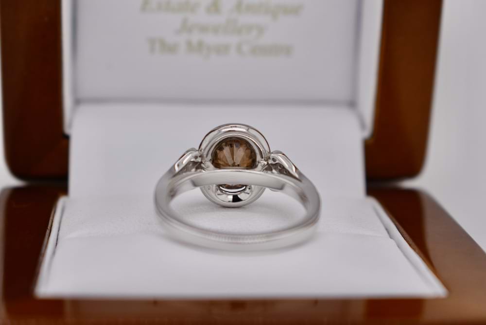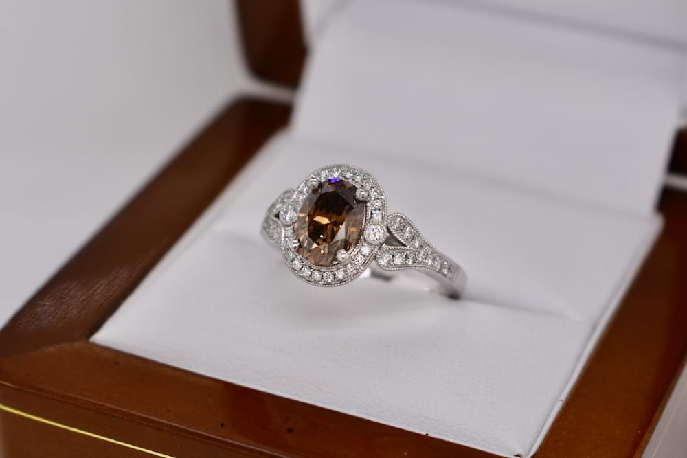This gorgeous 1.57ct oval champagne diamond (C7/VS2) was hand selected in store to be the feature of this gorgeous Art Deco inspired engagement ring. Crafted in platinum with an additional 46 sparkling white round brilliant cut diamonds totaling 0.34cts (FVS) we are sure this bride to be will be impressed and in love with her stunning custom diamond engagement ring. Independent Valuation Supplied. If you are inspired by this archived design contact us today to discuss how we can create something incredible for you or your loved one.