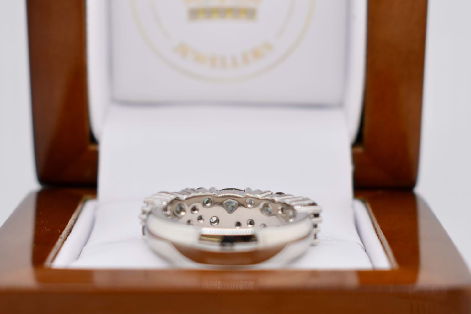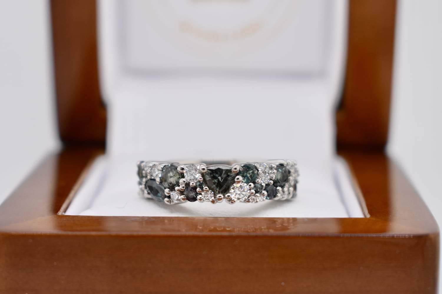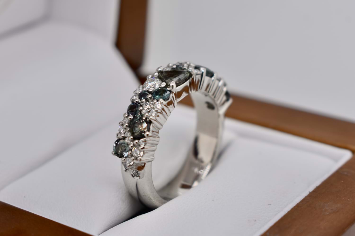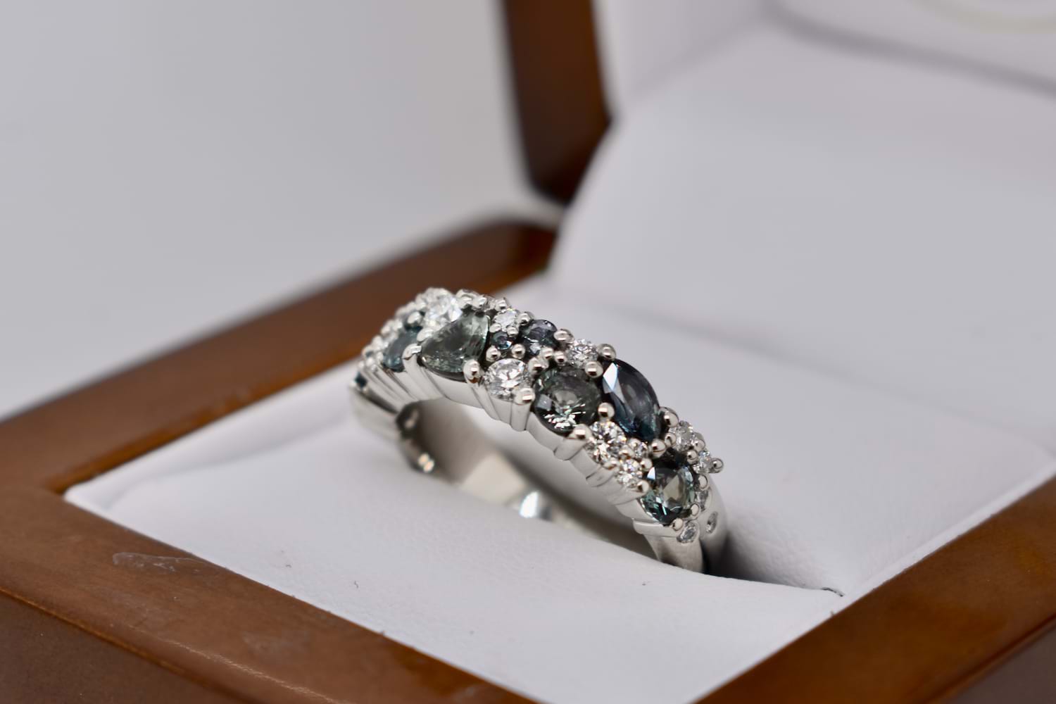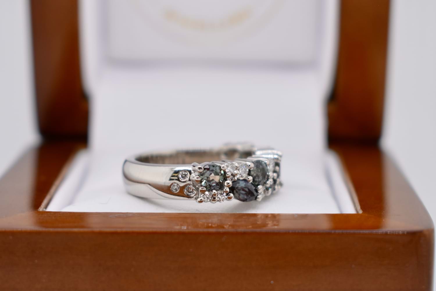 Famous for their colour changing properties, Alexandrite's are prized by gem collectors globally. Featuring a collection of eleven natural alexandrite's, each hand selected by our client, set with a scattering of shimmering white diamonds in a bespoke platinum ring this ring is sure to excite any passionate gem collector. The ring contains a combined total of 1.75cts of colour change alexandrite's and 25 sparkling round brilliant cut diamonds equalling 0.38cts.
