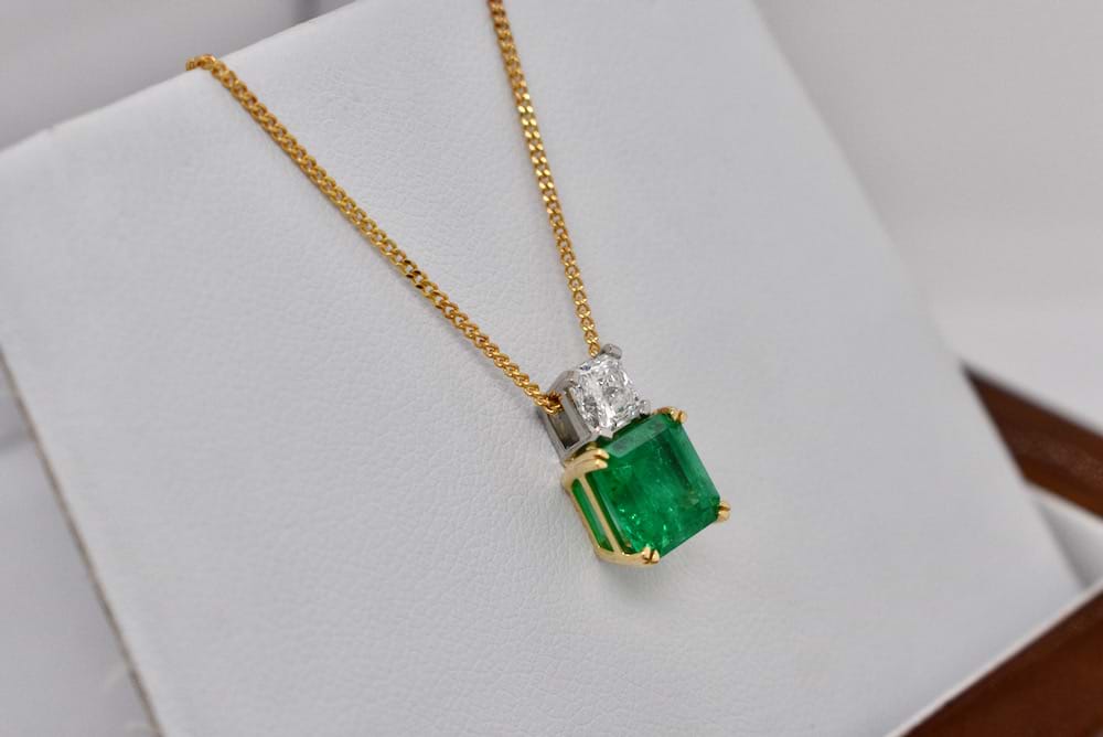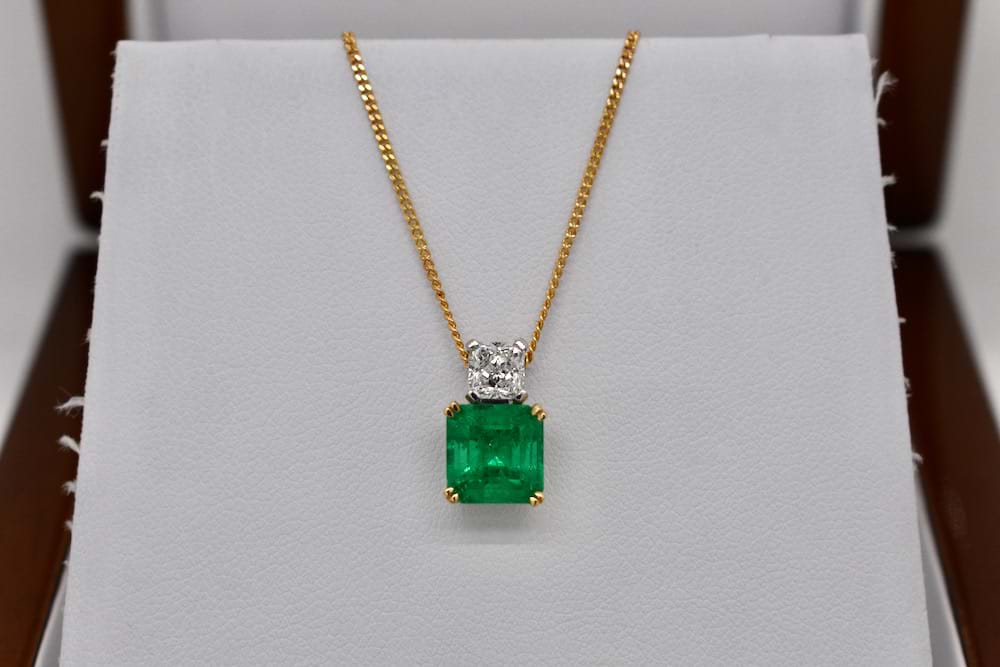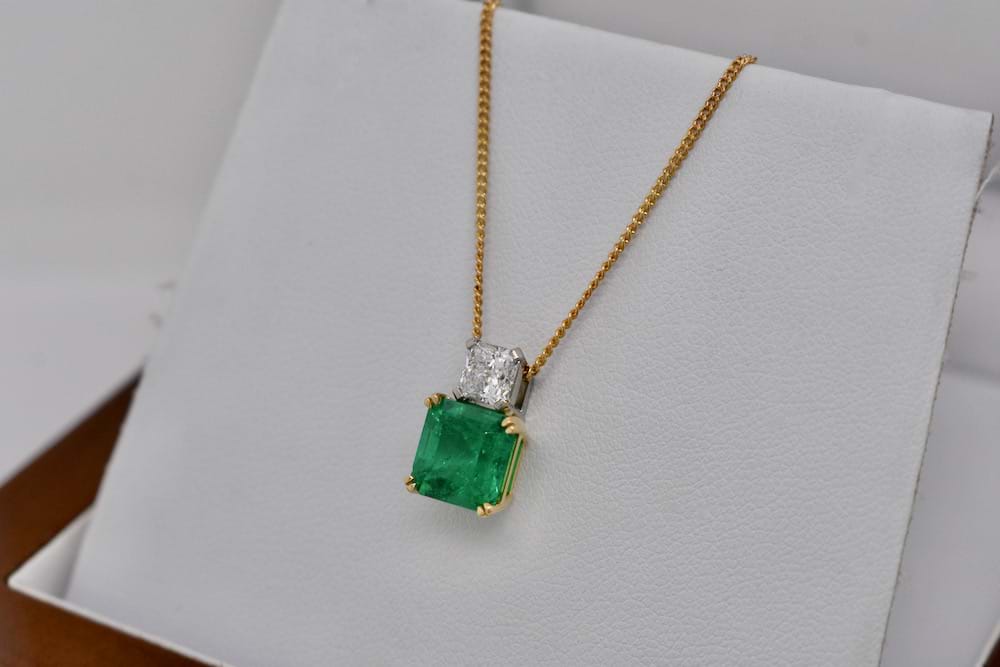 A spectacular pendant expertly crafted in our workshop in platinum and 18ct yellow gold to perfectly showcase this stunning 2.15ct, square emerald cut, Colombian emerald. Design with a slide style bale, the 0.50ct EVS1 radiant cut diamond acts as both a stunning contrast to the emerald and also as the front for the bale. Independent Valuation, Spectra Gem Lab Report and GIA Certificate Supplied.